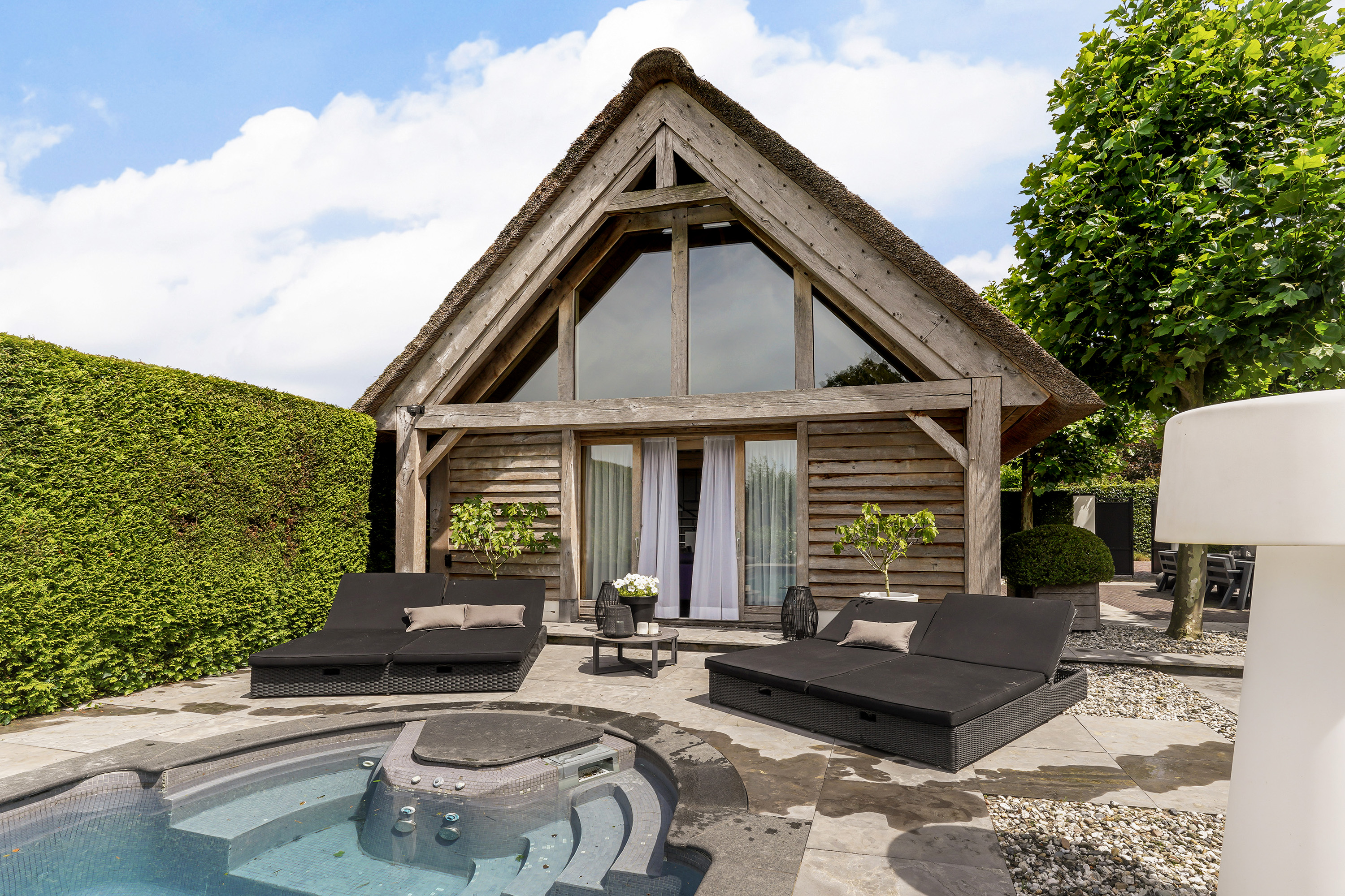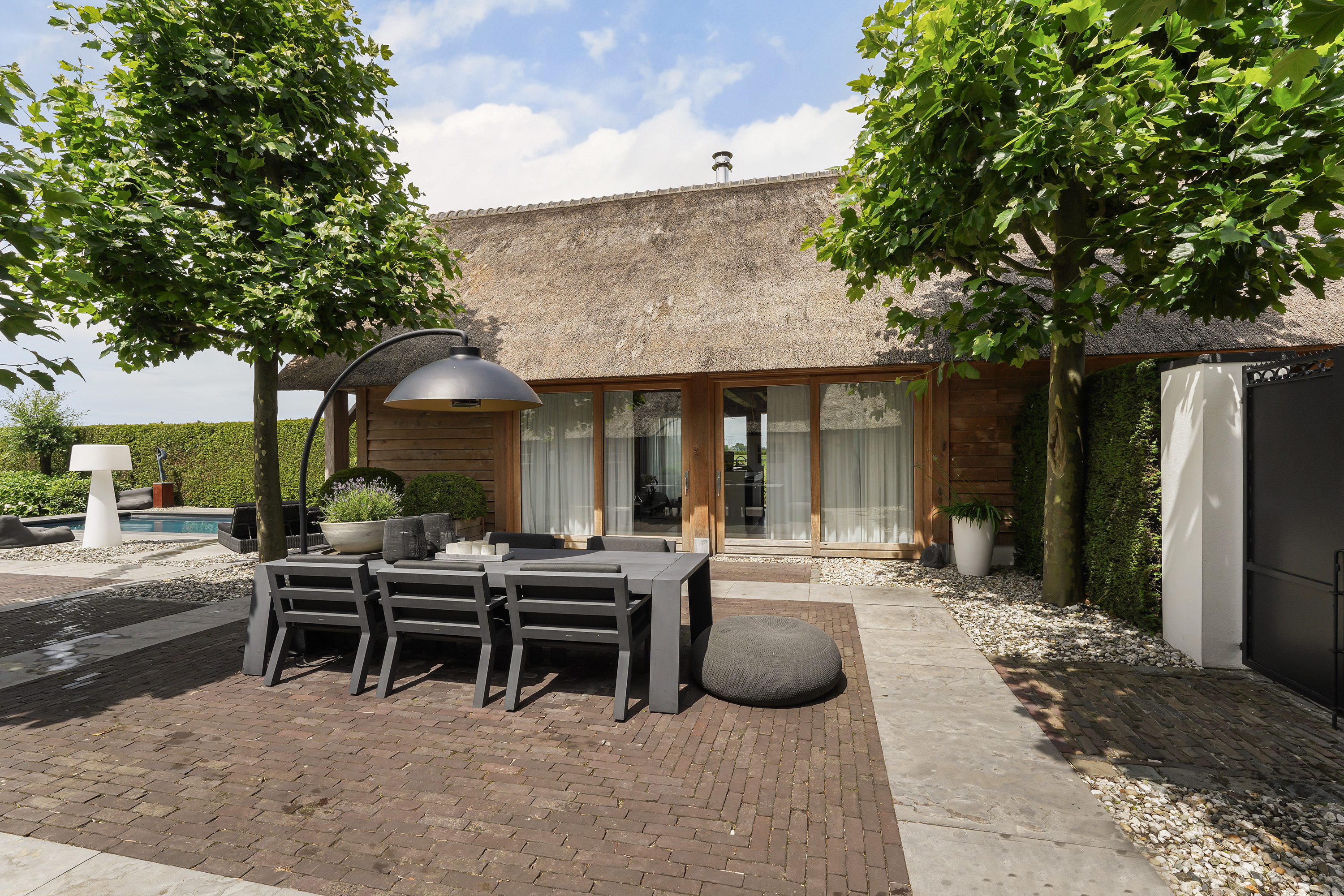 ويُعد بيت الضيافة بمساحة 124 م² ملاذاً قائماً بذاته، ويضم ساونا لأربعة أشخاص، وموقداً مفتوحاً، ومكتباً واسعاً، ودرجاً حلزونياً من الفولاذ، جميعها تحت سقف قشّي يدوي الصنع، ما يمنح شعوراً بالترف المصقول. وتسمح الأبواب المنزلقة بدخول الحديقة، فيما يمكن أن يتحول بيت الضيافة إلى مطبخ خارجي أو بار. ولضمان الكفاءة المثلى، يمتلك كل من المسبح المُدفأ، وبيت الضيافة، والفيلا الرئيسية أنظمة تدفئة منفصلة.