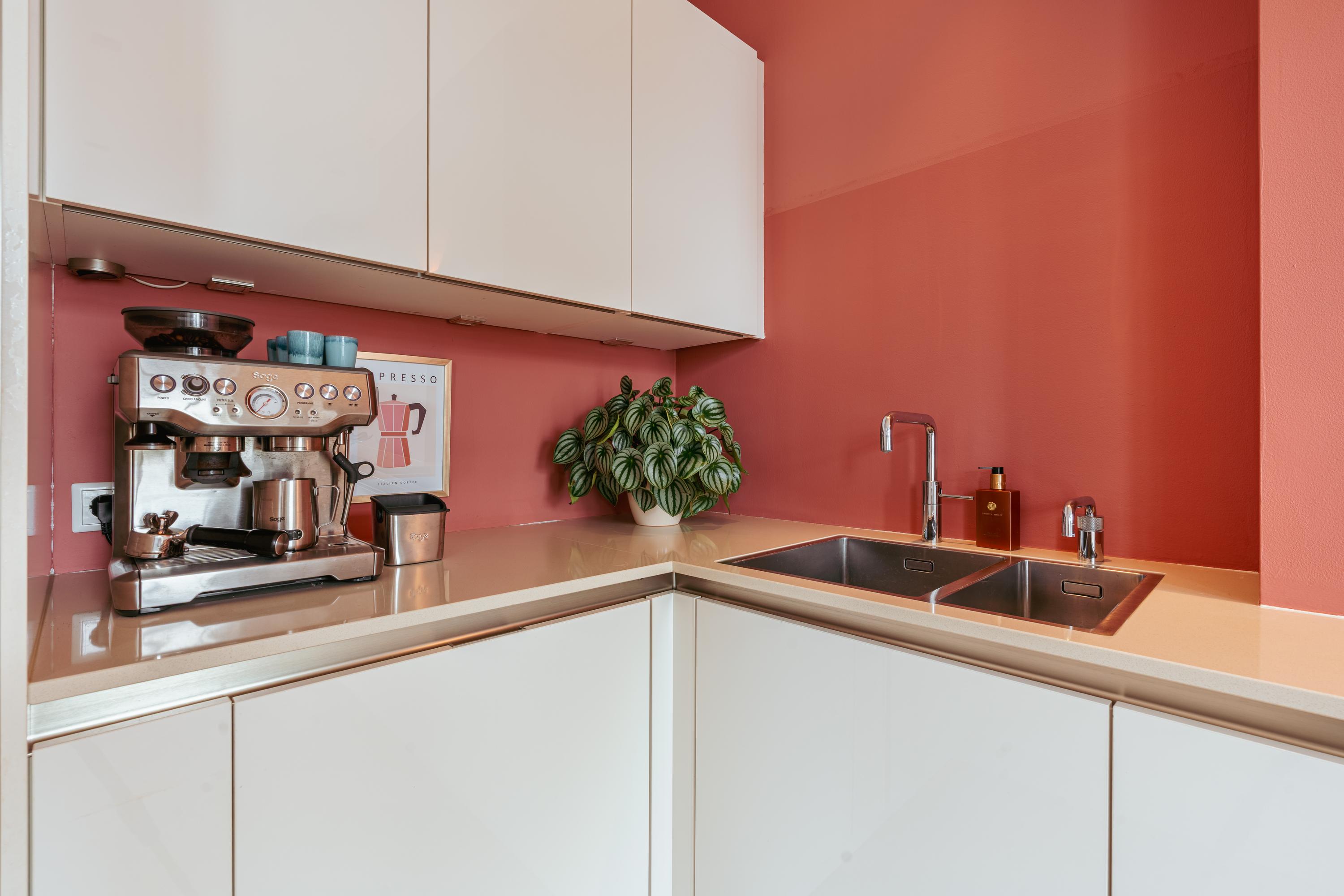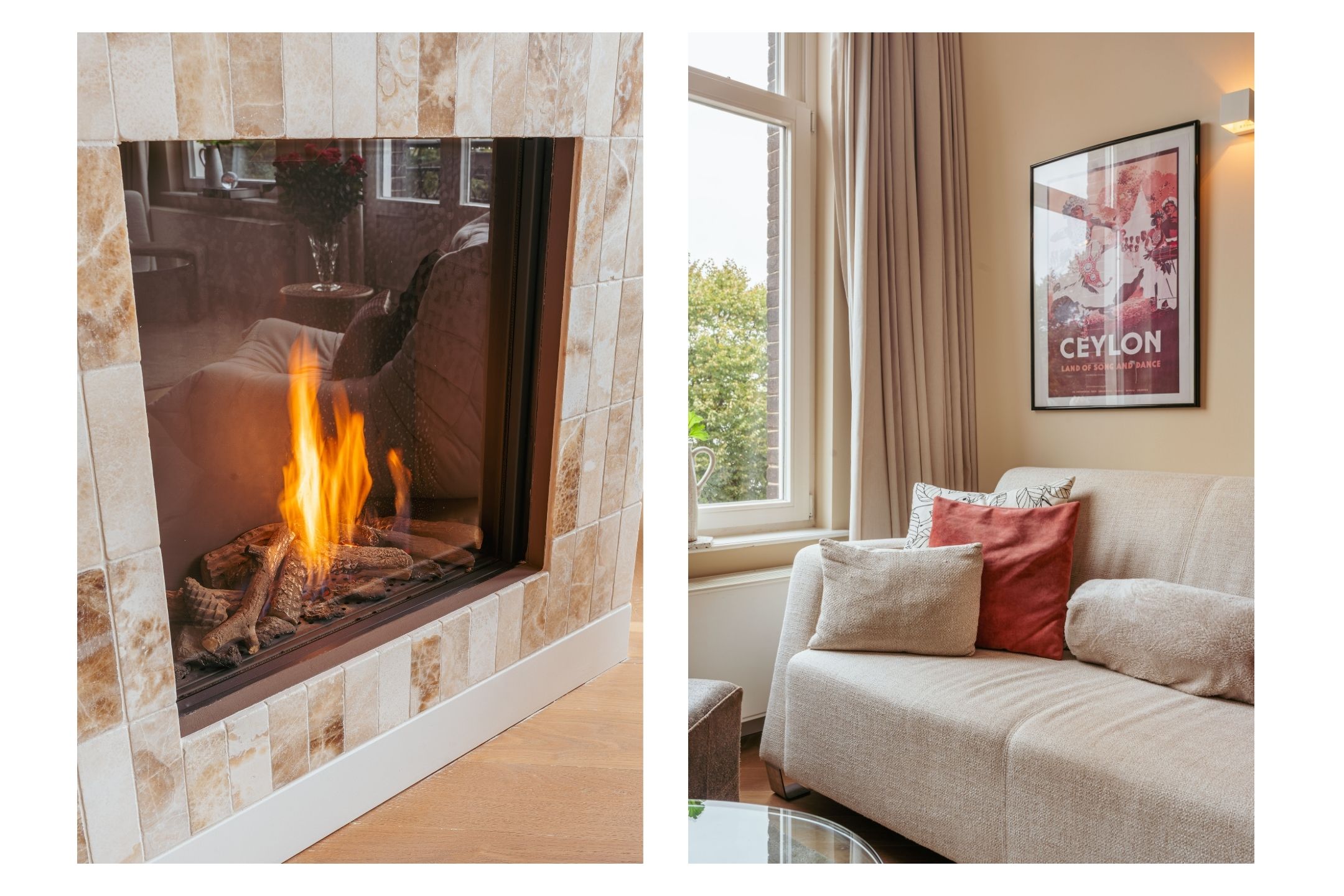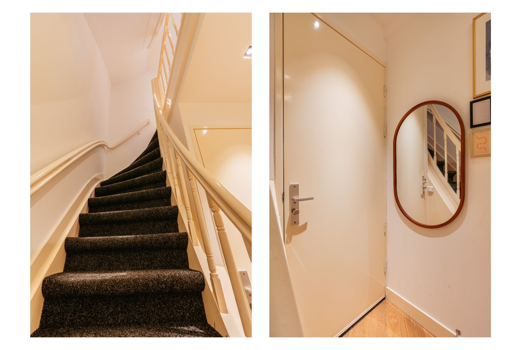 Der diskrete Zugang erfolgt im zweiten Obergeschoss, mit Platz für eine Garderobe und einer Treppe zu den lichtdurchfluteten Innenräumen. Der Wohnbereich im dritten Obergeschoss erstreckt sich über die gesamte Breite des Gebäudes; große Fenster und doppelte französische Türen, die auf einen nach Westen ausgerichteten Balkon führen, durchfluten den Raum mit Tageslicht. Ein Fischgrät-Holzboden, hohe Decken, ein Gaskamin und originale Einbauschränke verleihen Wärme und Charakter. Der Essbereich, zugänglich durch originale Ensuite-Türen, schließt an einen rückwärtigen Balkon mit Morgensonne an. Die moderne, weiße Küche ist mit hochwertigen Geräten wie einem Quooker und einem Fünf-Flammen-Gasherd ausgestattet – perfekt für Gastgeber.
