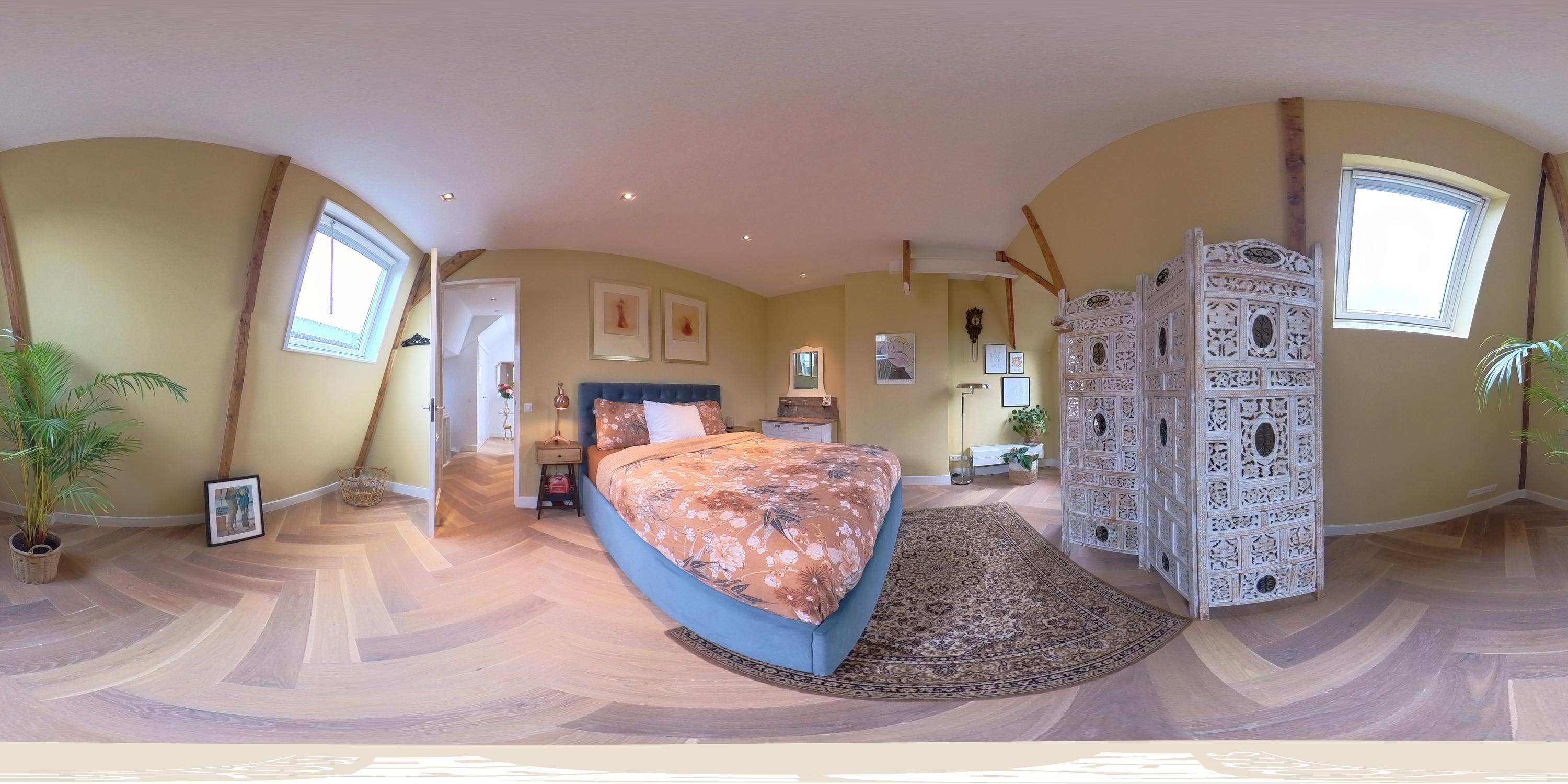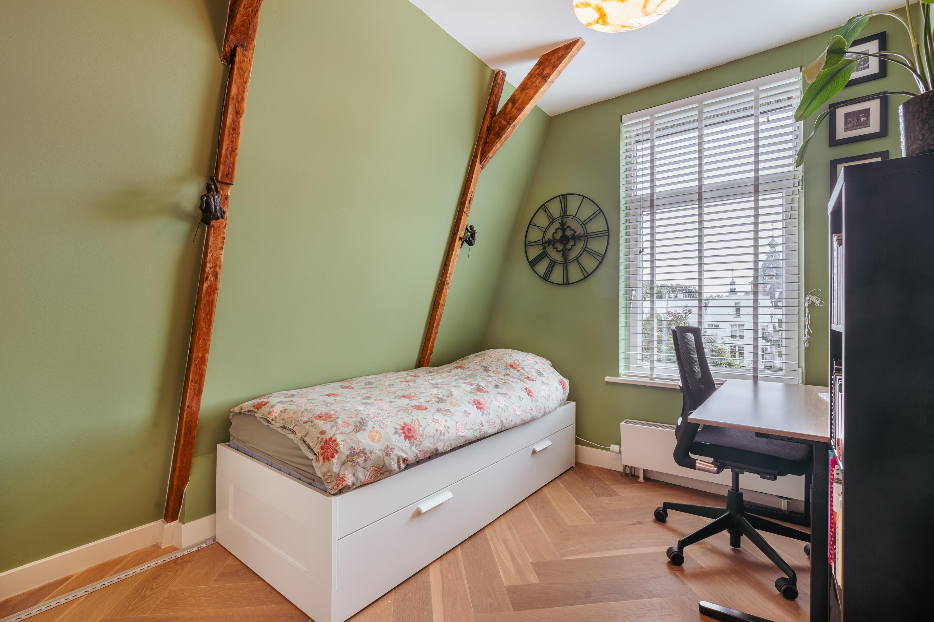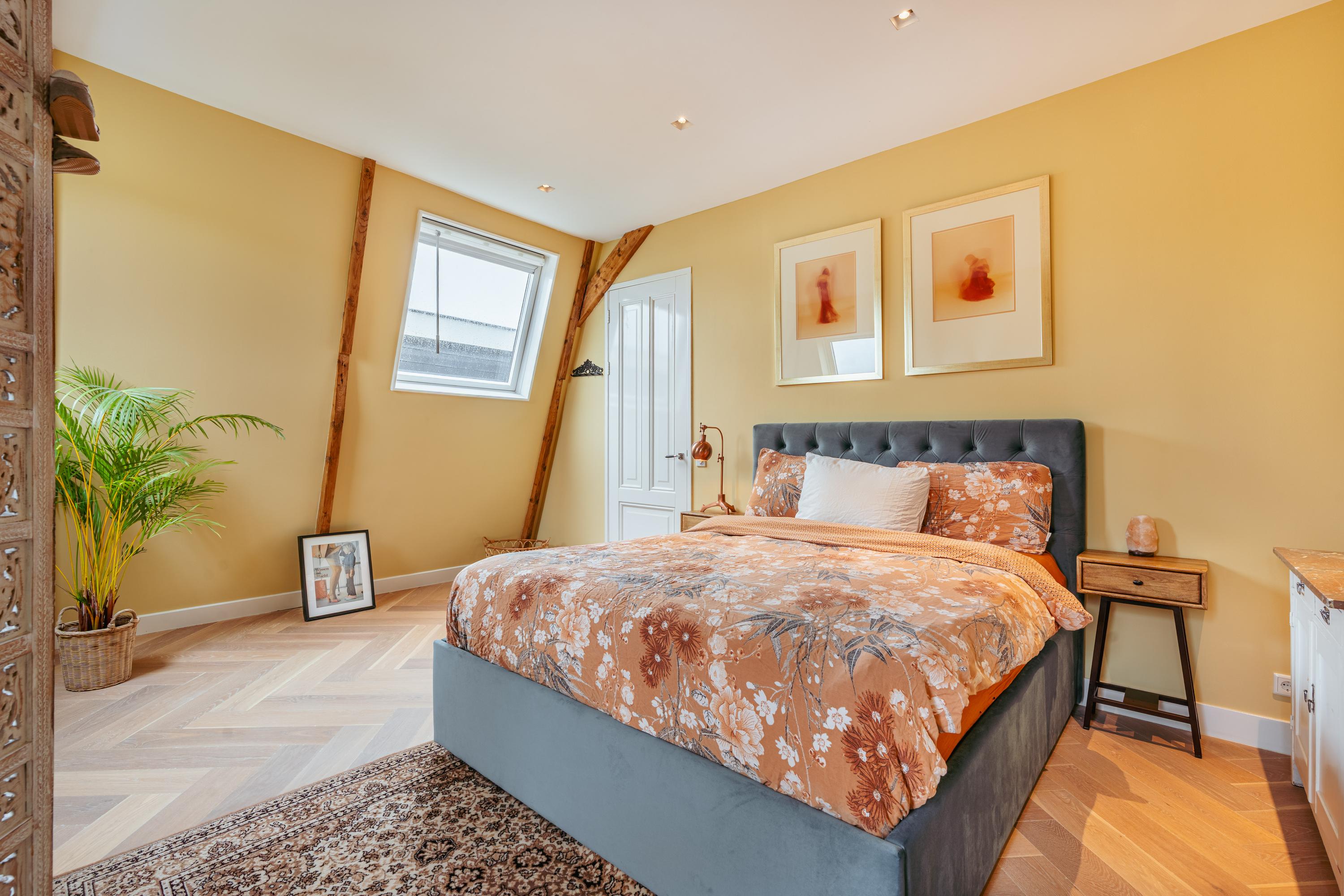 Im oberen Stockwerk bieten drei Schlafzimmer und ein luxuriöses Badezimmer Privatsphäre und Flexibilität. Das Hauptschlafzimmer beeindruckt mit freiliegenden Balken und einem Bogenfenster mit Blick auf Artis; zwei zusätzliche Schlafzimmer profitieren von reichlich Tageslicht. Das Badezimmer bietet eine Whirlpool-Badewanne, eine begehbare Regendusche, ein Waschbecken mit großzügigem Stauraum sowie Fußbodenheizung; alles in sorgfältig ausgewählten Materialien. Weiterer Stauraum ist geschickt in die gesamte Wohnung integriert.