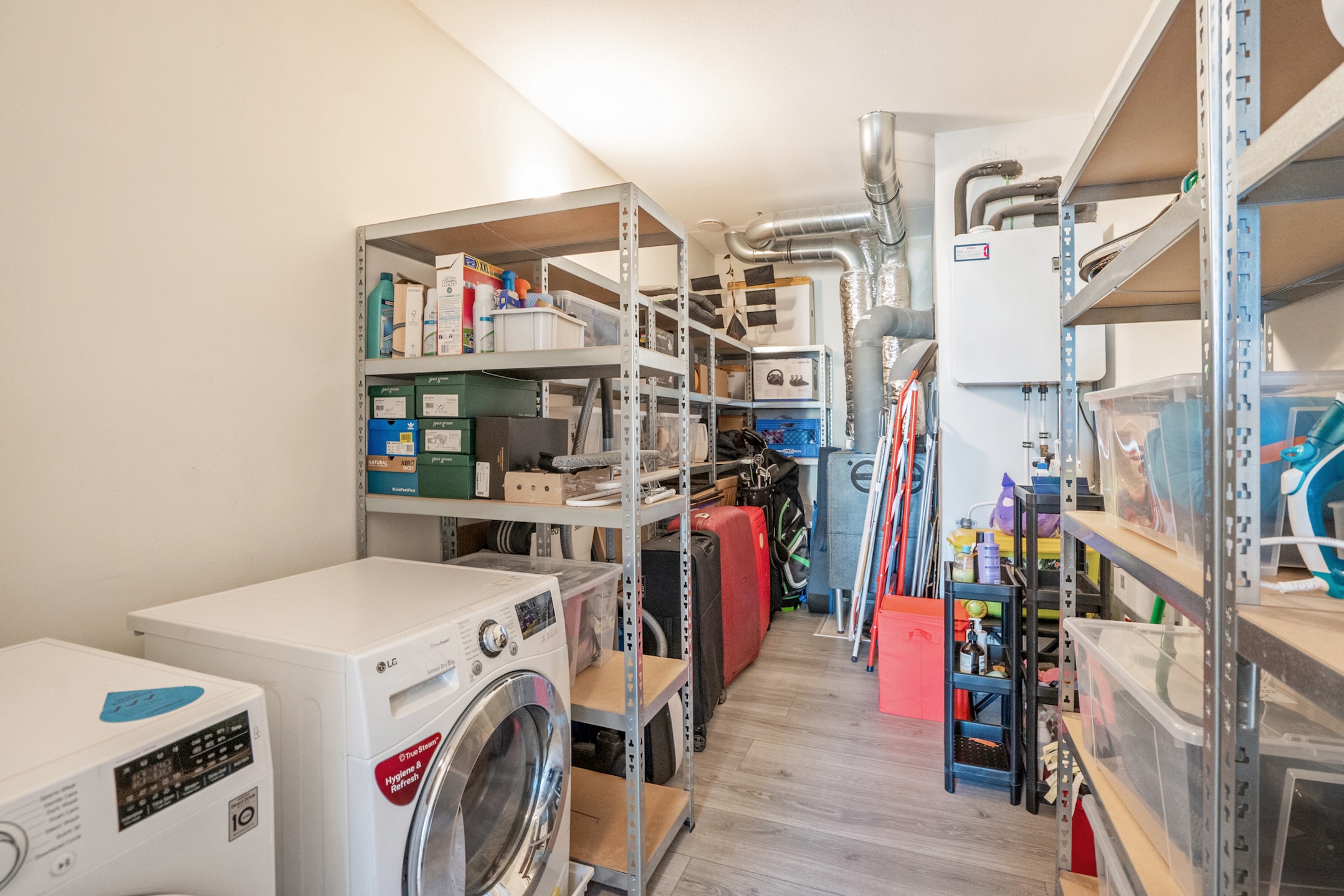 Indoor storage/utility room including washing machine/dryer connection
