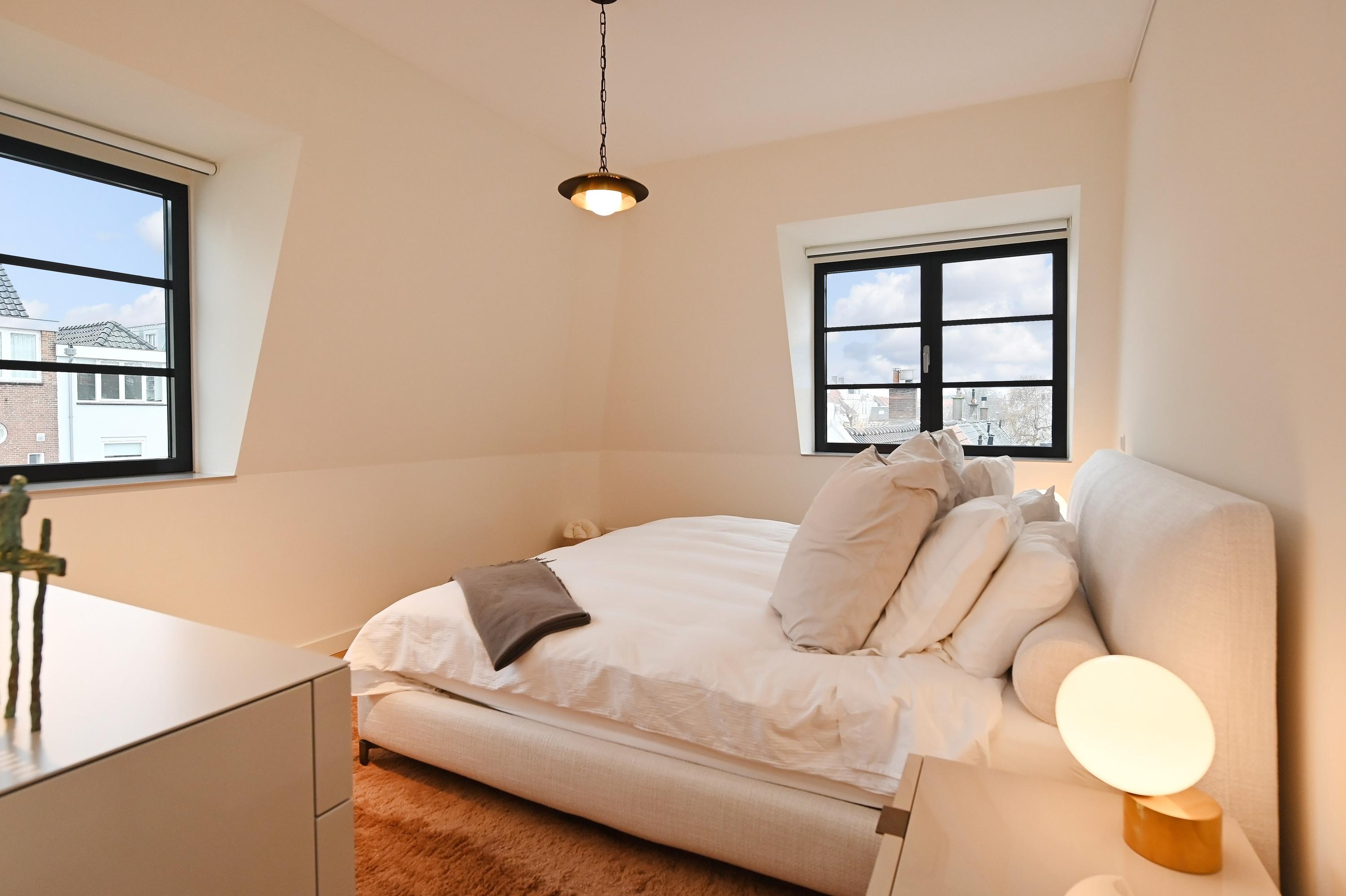 Staircase with elevator, central hall, spacious and bright living room with an L-shaped Poggenpohl kitchen featuring modern built-in appliances (such as an induction hob, oven, and Quooker) and an adjoining seating bar. Through a double sliding door, the living room provides access to the spacious terrace (approx. 13.5 m²) with afternoon and evening sun, unobstructed views, and modern finishes. Spacious master bedroom with an en-suite bathroom featuring a rain shower, toilet, and double sink. 2nd spacious bedroom with built-in wardrobe and 3rd bedroom with built-in wardrobes. Both of these bedrooms can also be used as office or hobby spaces. Modern and spacious bathroom with rain shower, double sinks, and mirror lighting. Separate toilet in the hallway.
