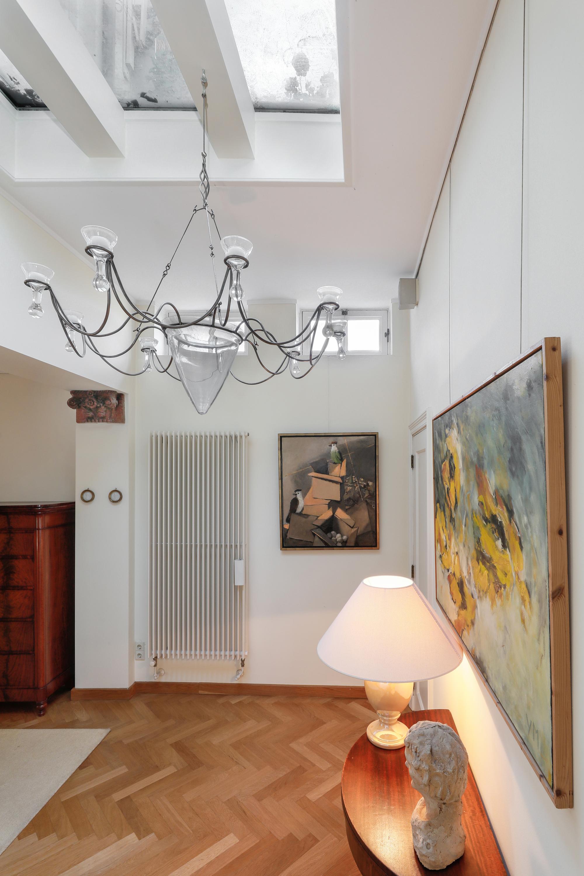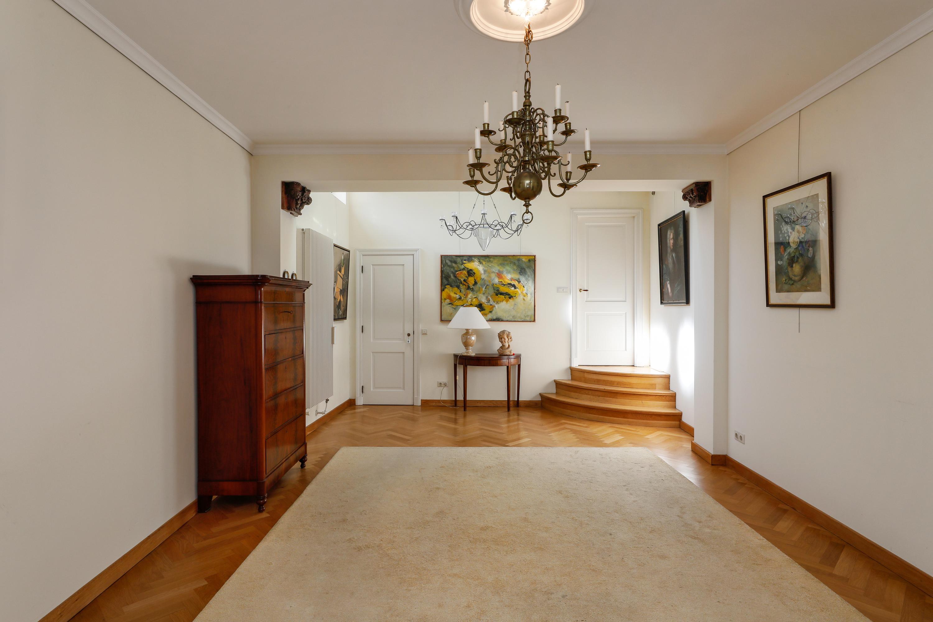 Spacious living area with herringbone flooring and smooth plastered walls. This floor can be configured flexibly, for example, as a second living room, workspace, or home office. From here, you can access the first roof terrace, the toilet, and the garage.