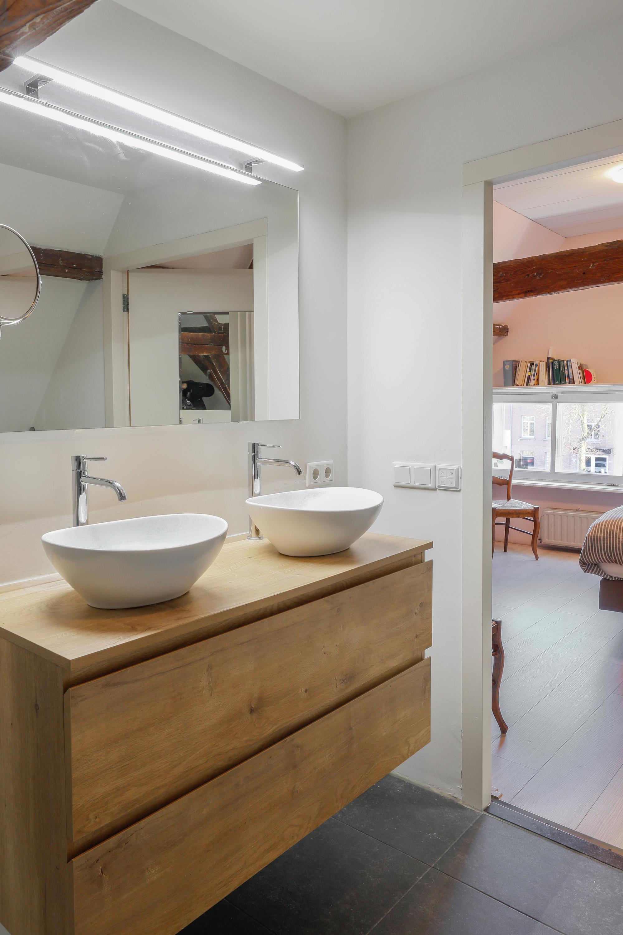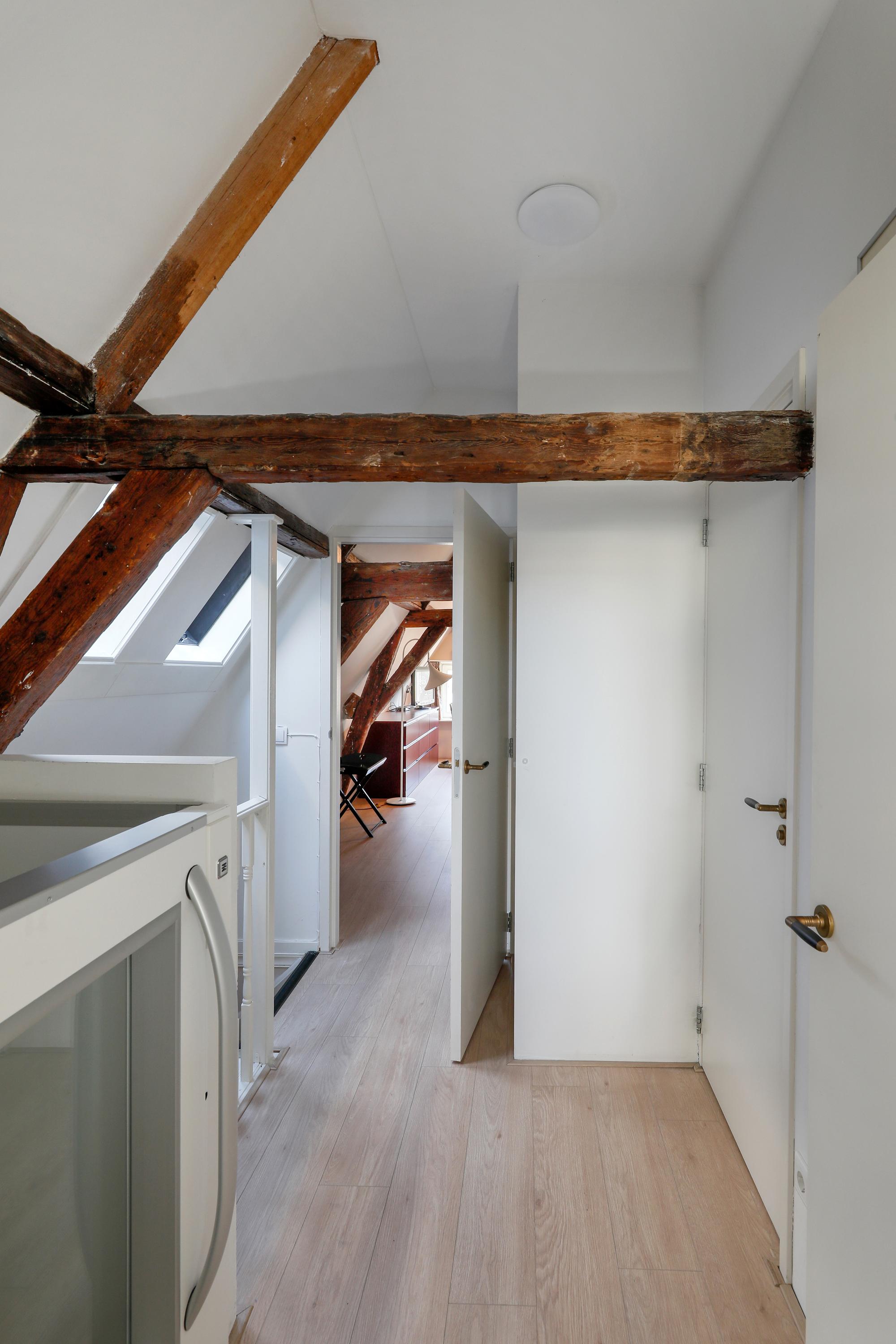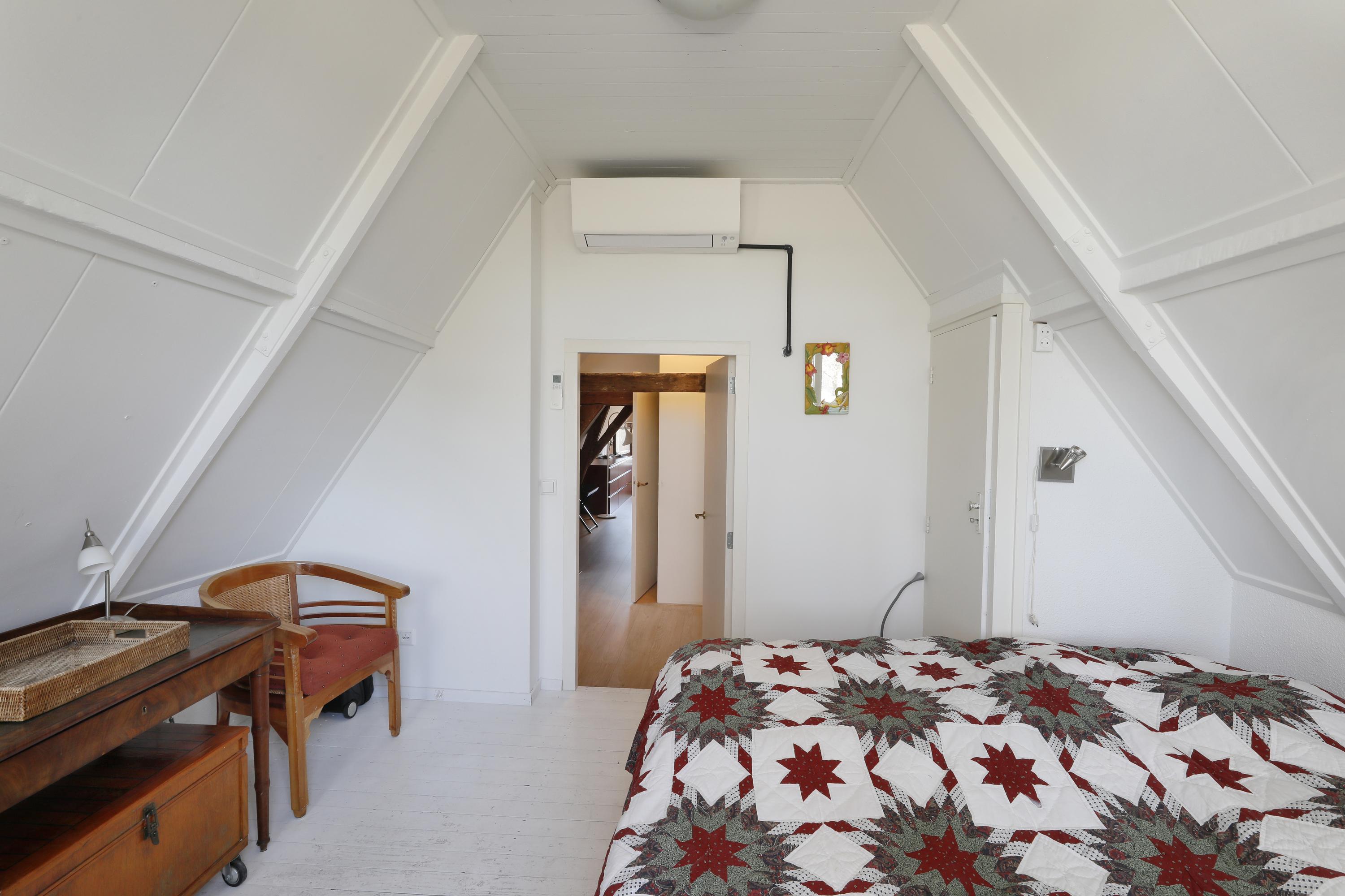 Two bedrooms under the characteristic roof eaves, one with a water view and one with a private loggia that catches the afternoon and evening sun. The bathroom features a walk-in shower, vanity, and toilet. This floor is accessible by stairs and elevator.