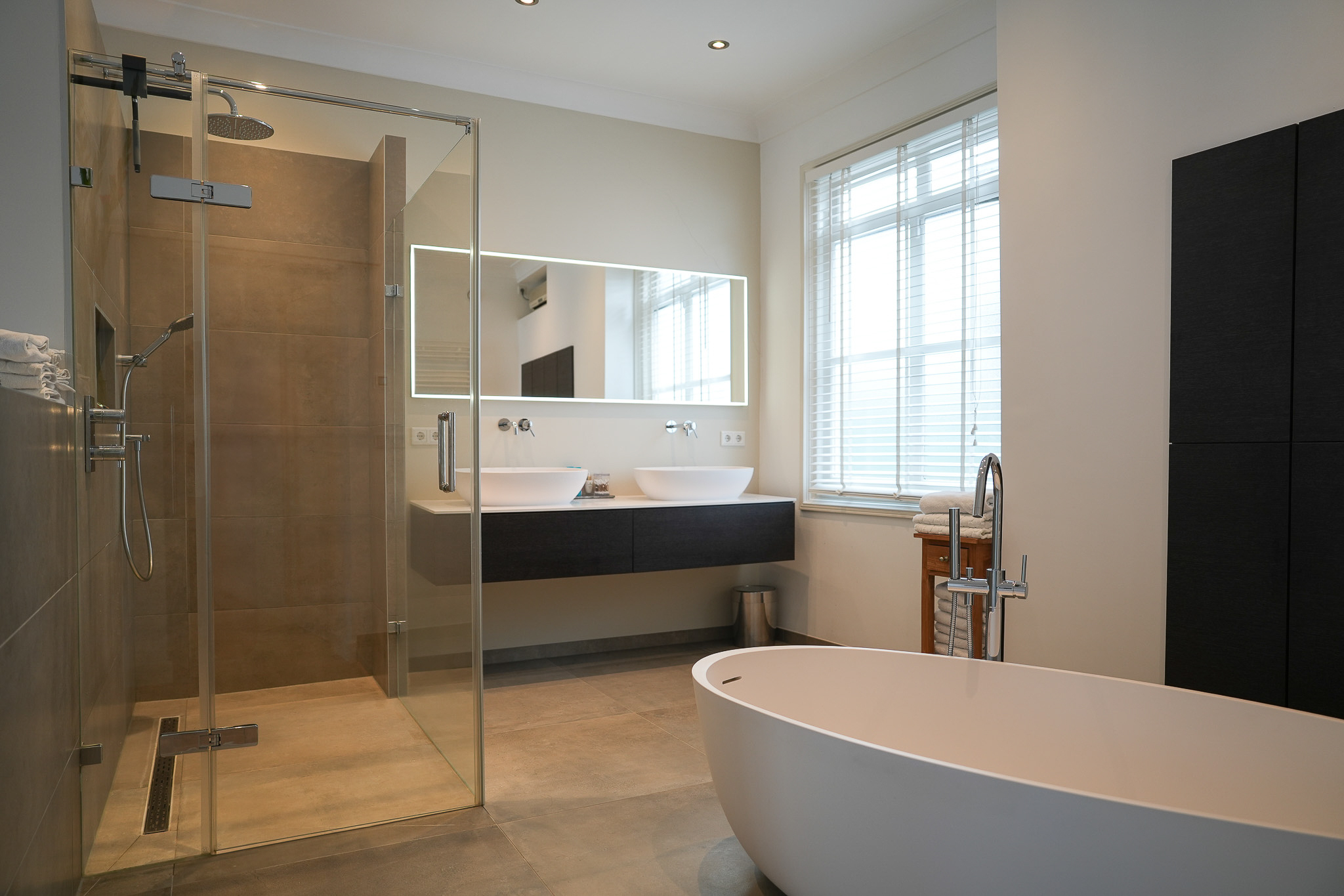 De eerste verdieping heeft desgewenst wederom een woonkamer met schouw, een grote slaapkamer met luxe badkamer en suite, een kastenkamer en een royale daktuin.