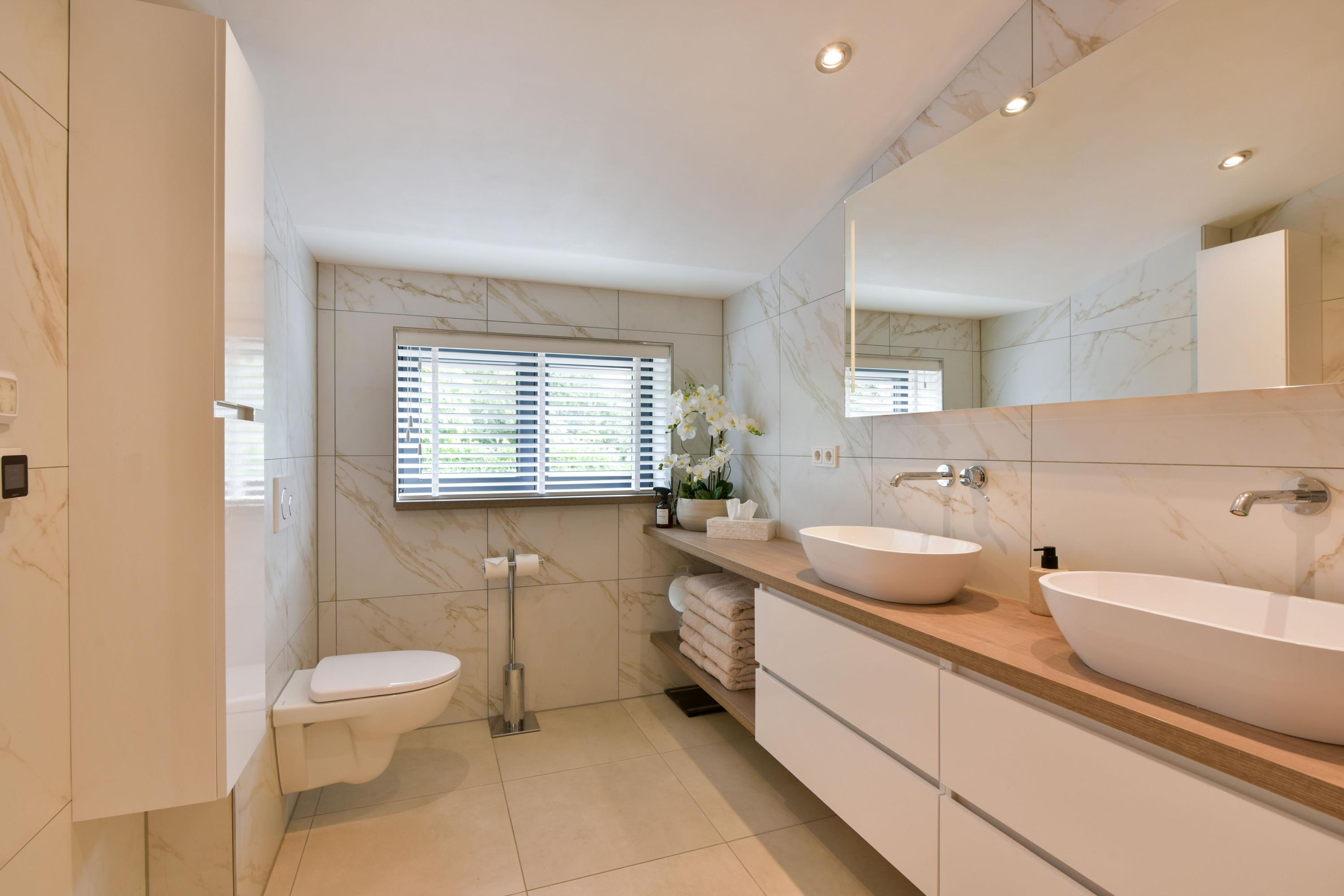 Back in the hallway, a door leads to the first bedroom — a calm and comfortable space. With air conditioning, it’s pleasant all year round. There’s room for a generous double bed and additional storage. The adjoining en-suite bathroom, renovated in 2024, was designed with luxury and comfort in mind: a spacious walk-in shower with a thoughtfully placed showerhead, modern toilet, and a wide vanity with twin basins and an illuminated mirror complete the room.