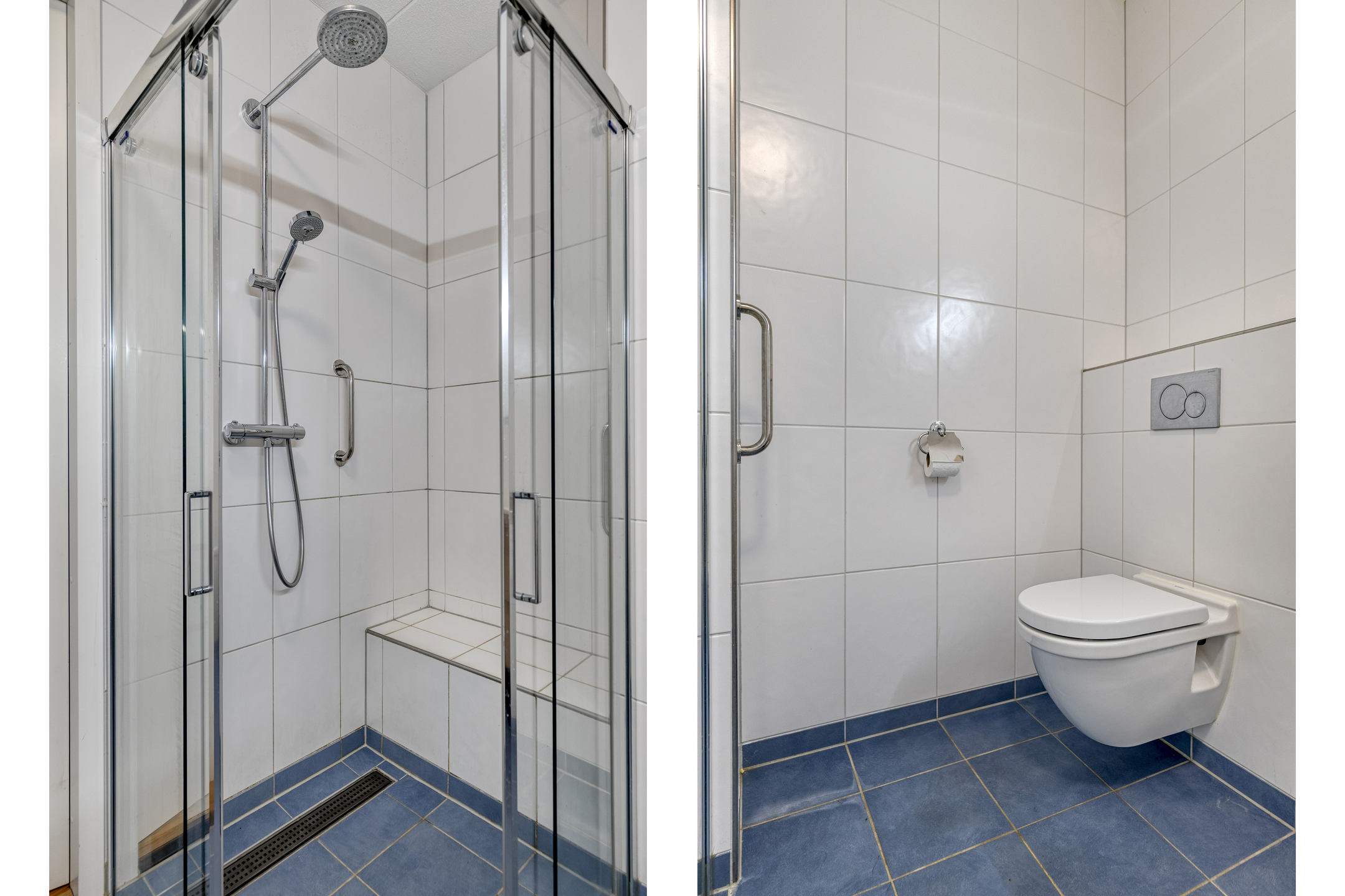 Next to the technical room is the spacious bathroom, fitted with a bathtub, walk-in shower, washbasin with vanity unit and a second toilet. The tiled floor is finished with an anti-slip coating, providing extra safety.