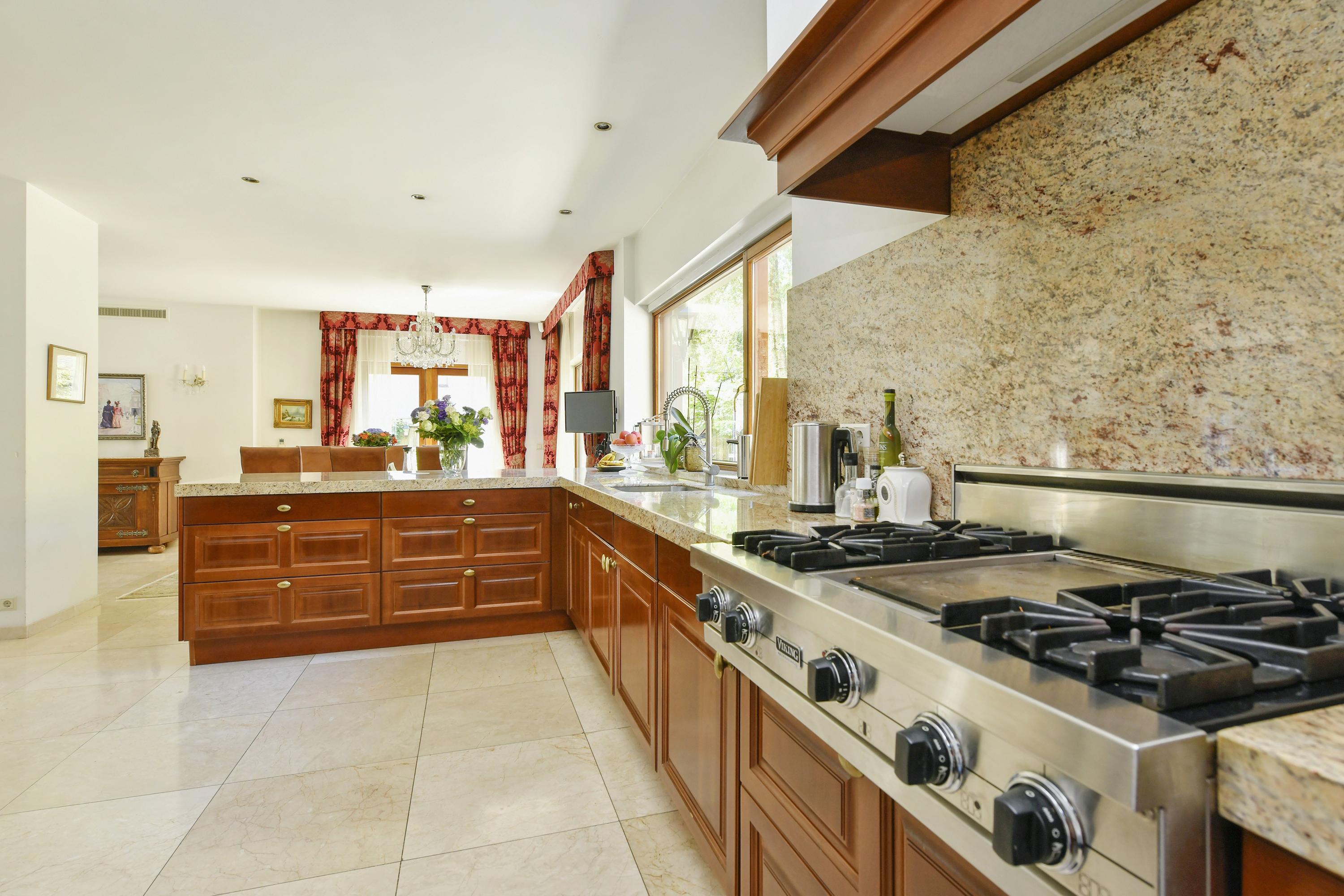 The open kitchen is equipped with built-in appliances. Its spacious and open design creates an inviting living area where cooking, dining and spending time together blend seamlessly.