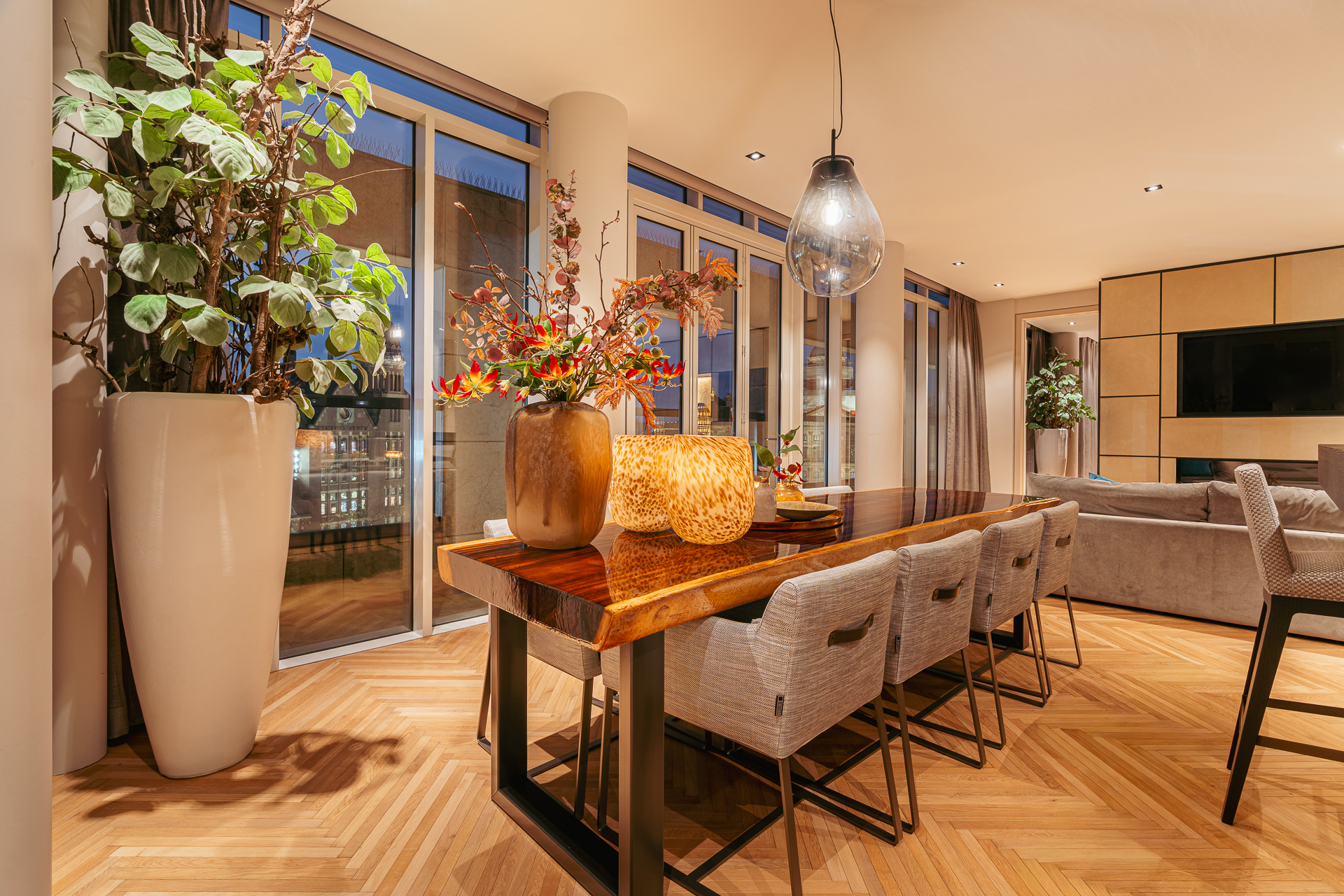 The large glass façades allow you to fully embrace the vibrant city life outside or close it off entirely to enjoy privacy and tranquility. The high-quality materials and finishes ensure a refined and comfortable living experience. The interior has been designed under the supervision of internationally renowned interior architect Pieter Laureys and finished to the highest standards. The apartment is offered including new, carefully selected bespoke furniture.