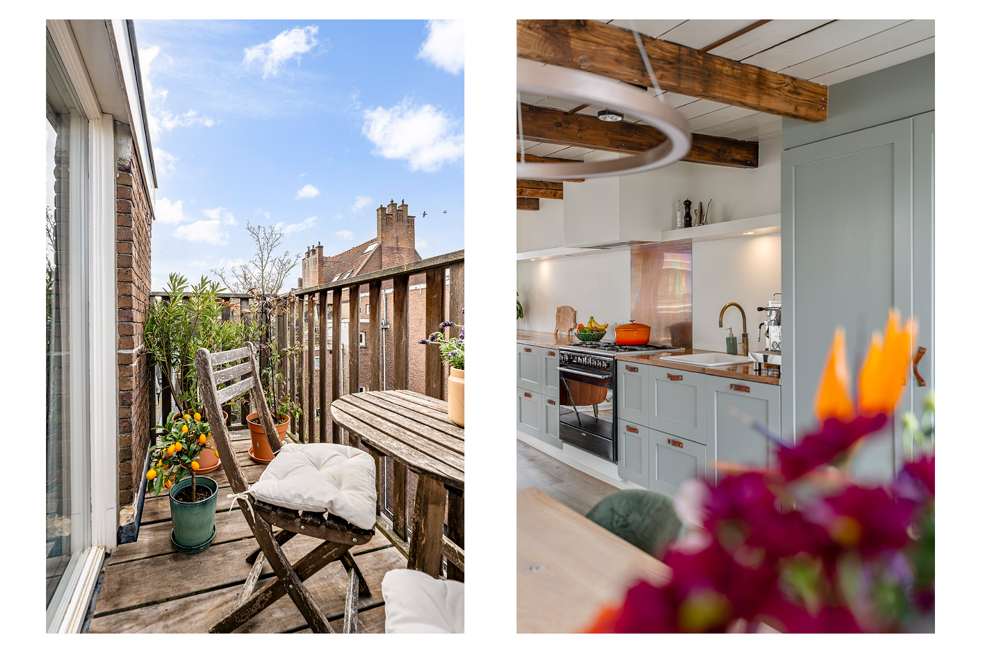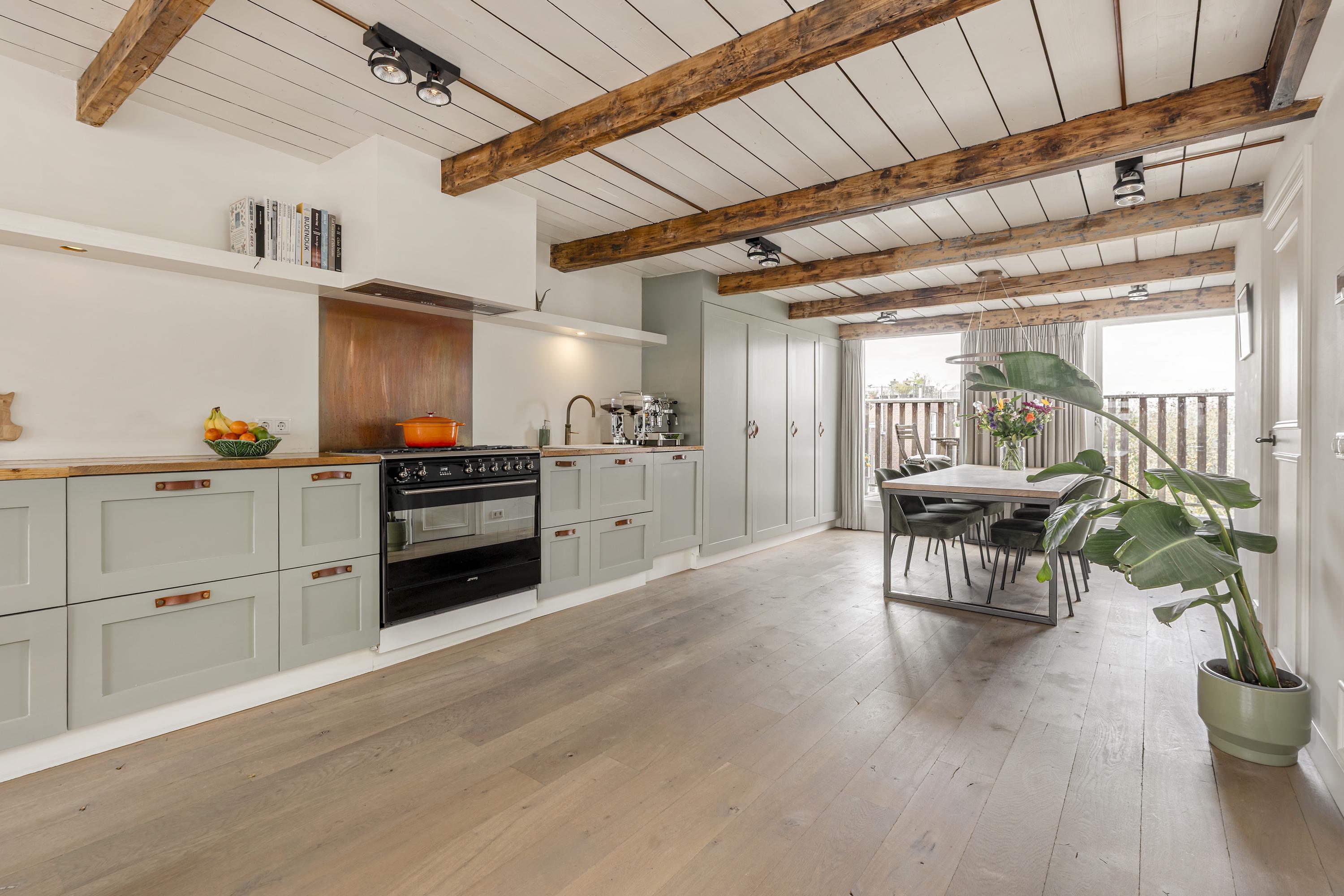 The living floor, situated on the fourth level, features a spacious and bright living room with an open-plan kitchen. The space is characterized by charming wooden beams, adding warmth and character. Large windows at both the front and rear, combined with natural light from the rooftop terrace, ensure a pleasant flow of daylight throughout the day. The open kitchen spans the full width of the wall and offers ample storage space. It is equipped with a six-burner gas stove, extractor hood, oven, dishwasher, sink with Quooker, refrigerator, freezer, and a wine climate cabinet. This floor also includes a separate toilet with double doors. From the living room, there is direct access to the west-facing balcony at the rear. A fixed staircase leads to the stunning rooftop terrace. This generous outdoor space offers complete privacy and enjoys 360-degree sun exposure, making it the perfect place to relax throughout the day. With ample room for multiple seating and lounge areas, the terrace is a true highlight of the property.
