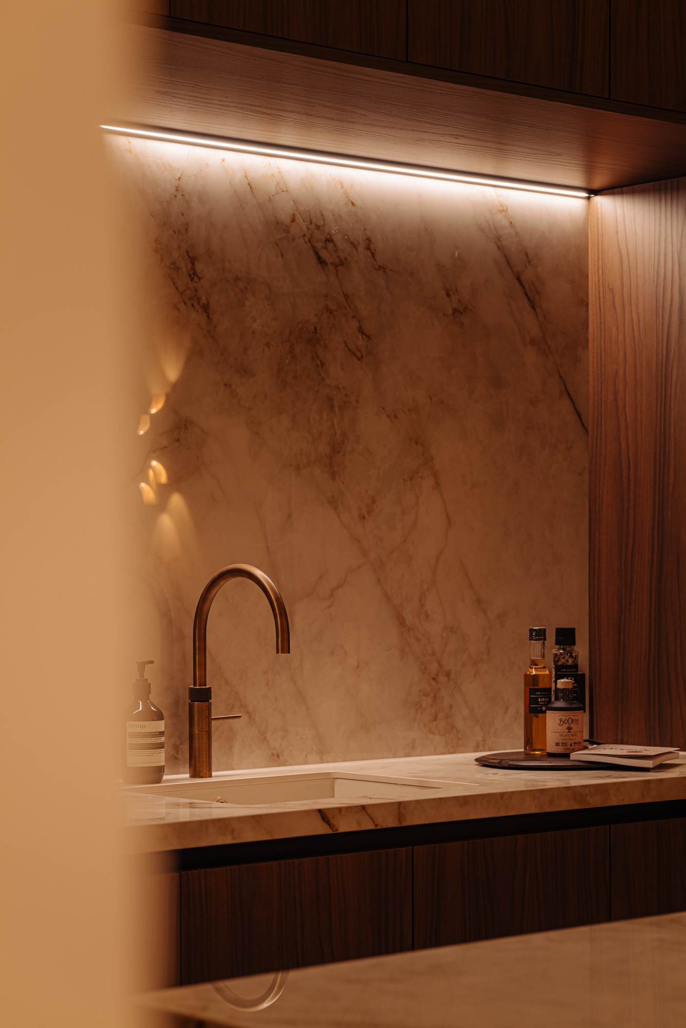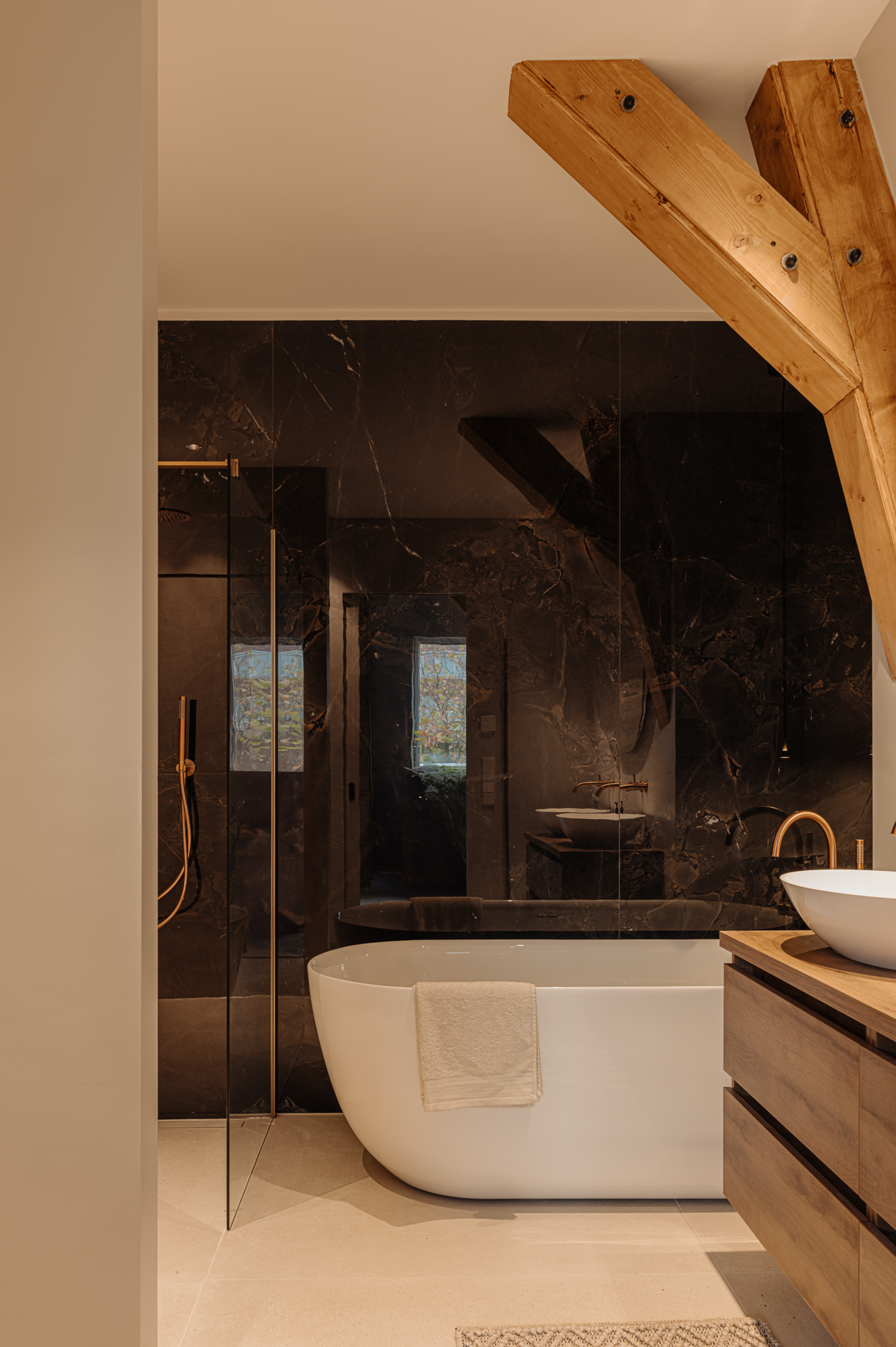 The front door to the apartment opens into a landing that gives access to storage space, a separate guest toilet and all the apartment’s other rooms. There is a large, bright living room (approx. 53 m2) and an open-plan kitchen of Italian design with a cooking island at the front of this floor. The luxury kitchen is equipped with a comprehensive range of built-in appliances and balances style and functionality perfectly. The sophisticated combination of white units with marble worktops and large units with the warm shade of walnut give the space a beautiful, atmospheric feel. A number of double doors open out onto the apartment’s sunny roof terrace.
