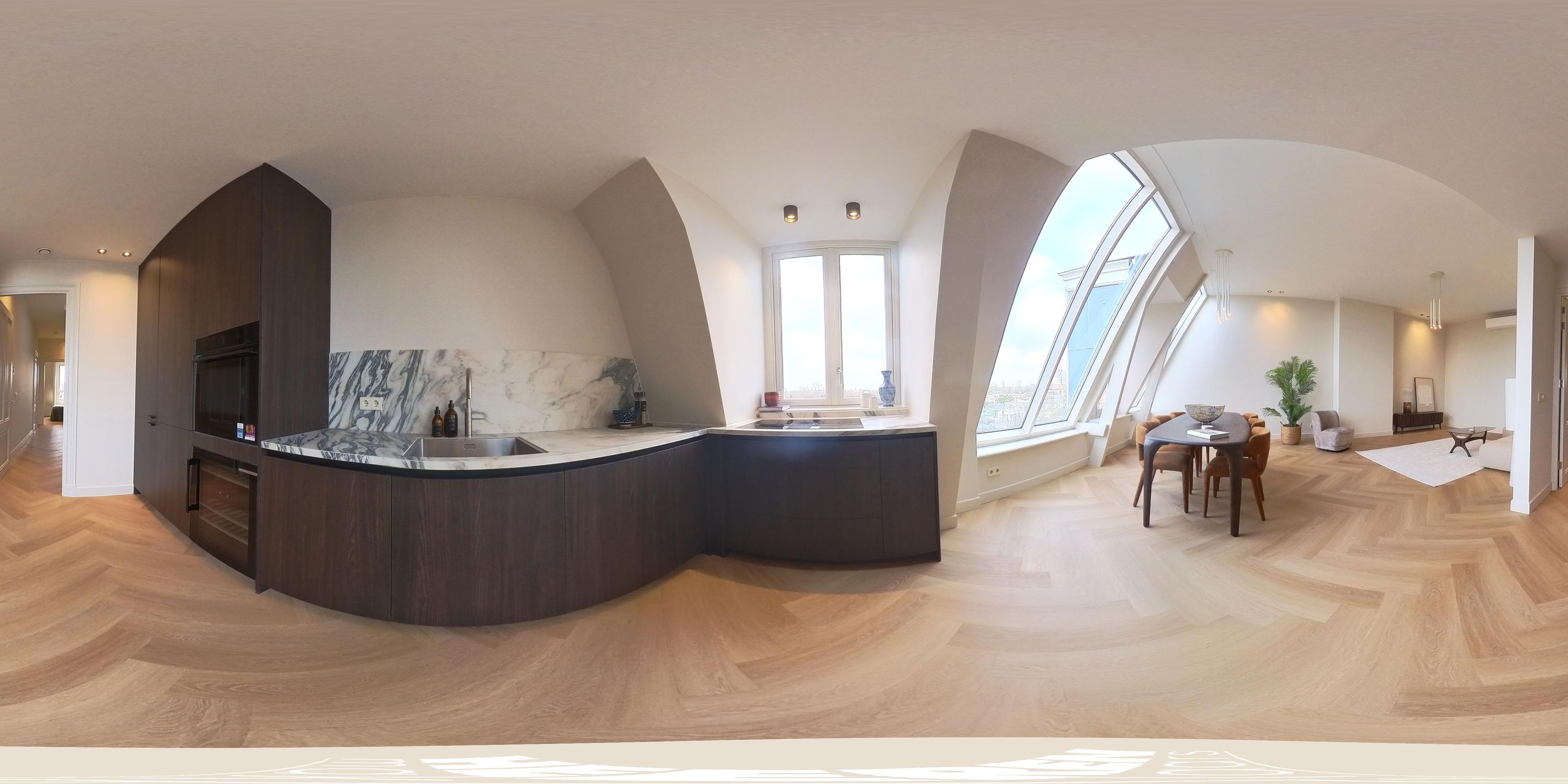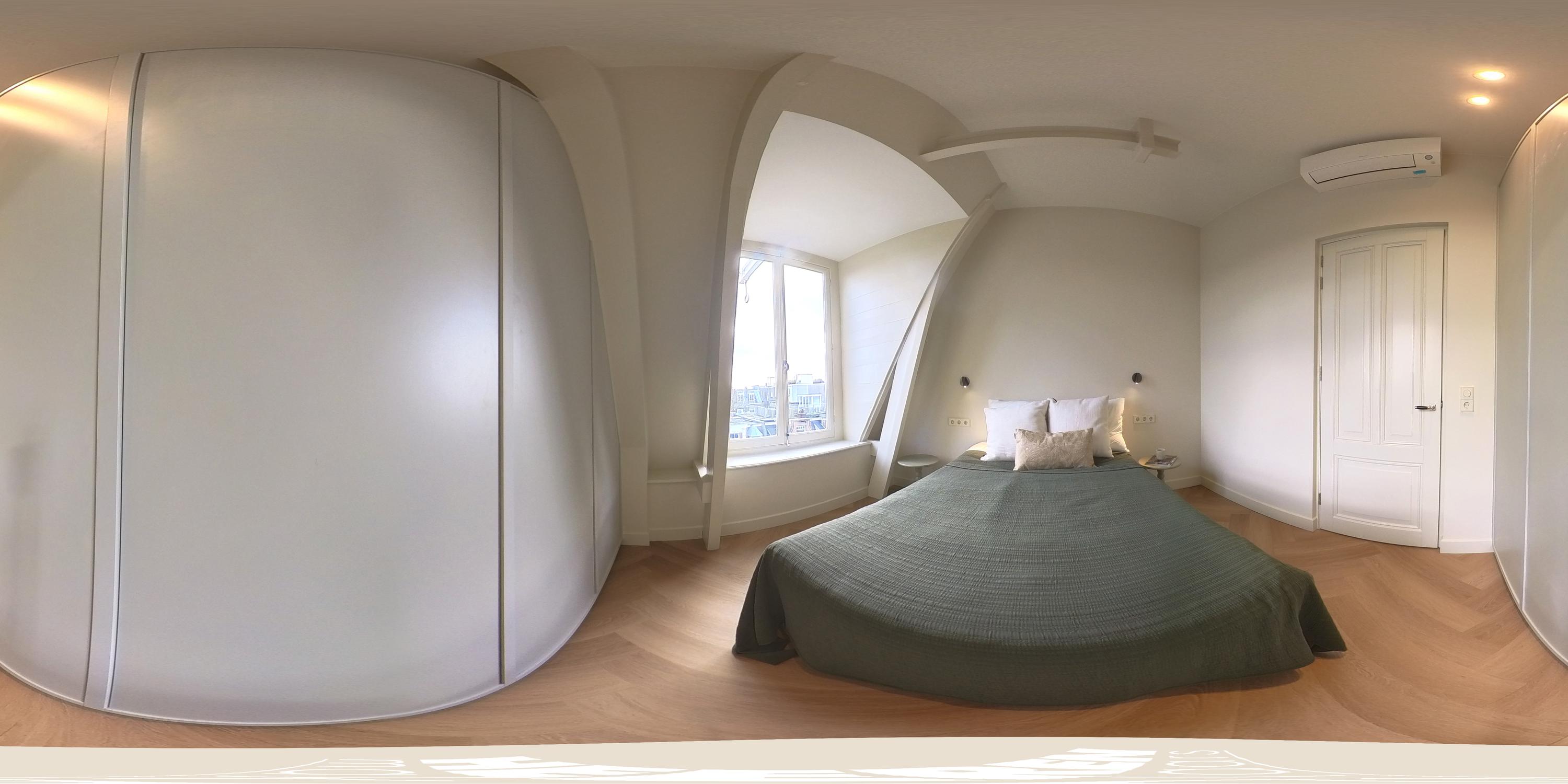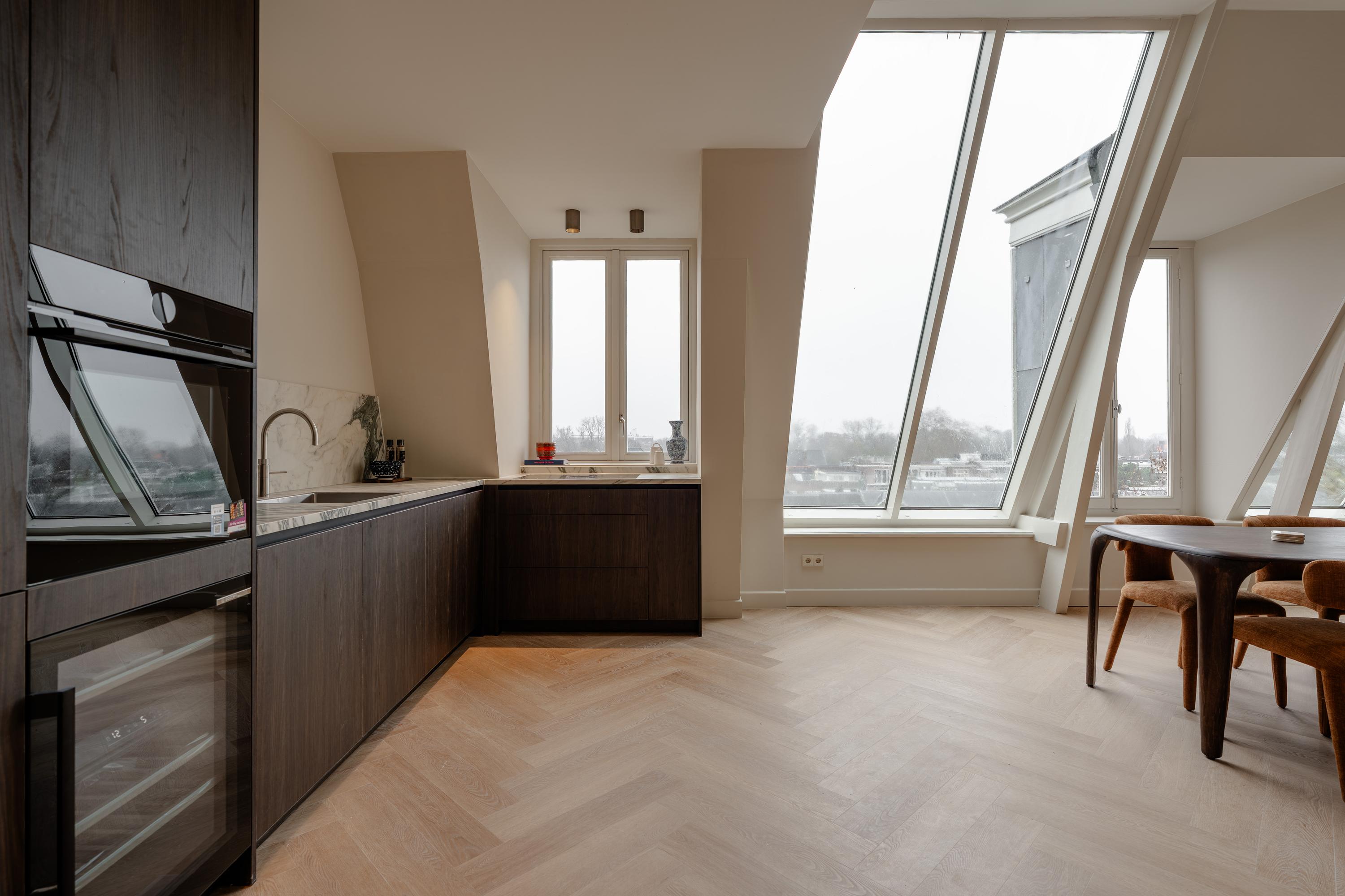 This luxurious apartment is located on the fourth floor and is characterised by a spacious and light-filled design, featuring high ceilings and striking, angled skylights at the rear. These large windows give the apartment a distinctive character and provide exceptional natural light throughout the day, along with open, green views across the city. The living room and kitchen are situated at the rear of the apartment and together form one generous living space. The unique roof structure, combined with the large skylights, creates an open and architecturally interesting atmosphere with abundant daylight and attractive sightlines. There is ample space for both a comfortable seating area and a large dining table. The luxurious kitchen is finished in a sleek and timeless design and integrates seamlessly with the living area. It is equipped with an induction hob, sink with Quooker, combi oven, climate cabinet, dishwasher, separate refrigerator and freezer, and offers generous workspace and storage capacity. At the front of the apartment are two well-proportioned and quietly located bedrooms. The master bedroom features an en-suite bathroom fitted with a walk-in shower and a double washbasin with vanity unit. Centrally located on the landing is the second bathroom, also equipped with a walk-in shower and a washbasin with vanity unit. In addition, there is a separate toilet and practical built-in storage. The roof terrace is accessible via an internal staircase. This spacious terrace offers a high level of privacy and has been structurally prepared for the installation of a jacuzzi, including a double electrical group. Provisions have also been made for an outdoor shower (water connection) and for the installation of an outdoor kitchen (water and electricity connections), making this outdoor space a valuable extension of the living comfort.
