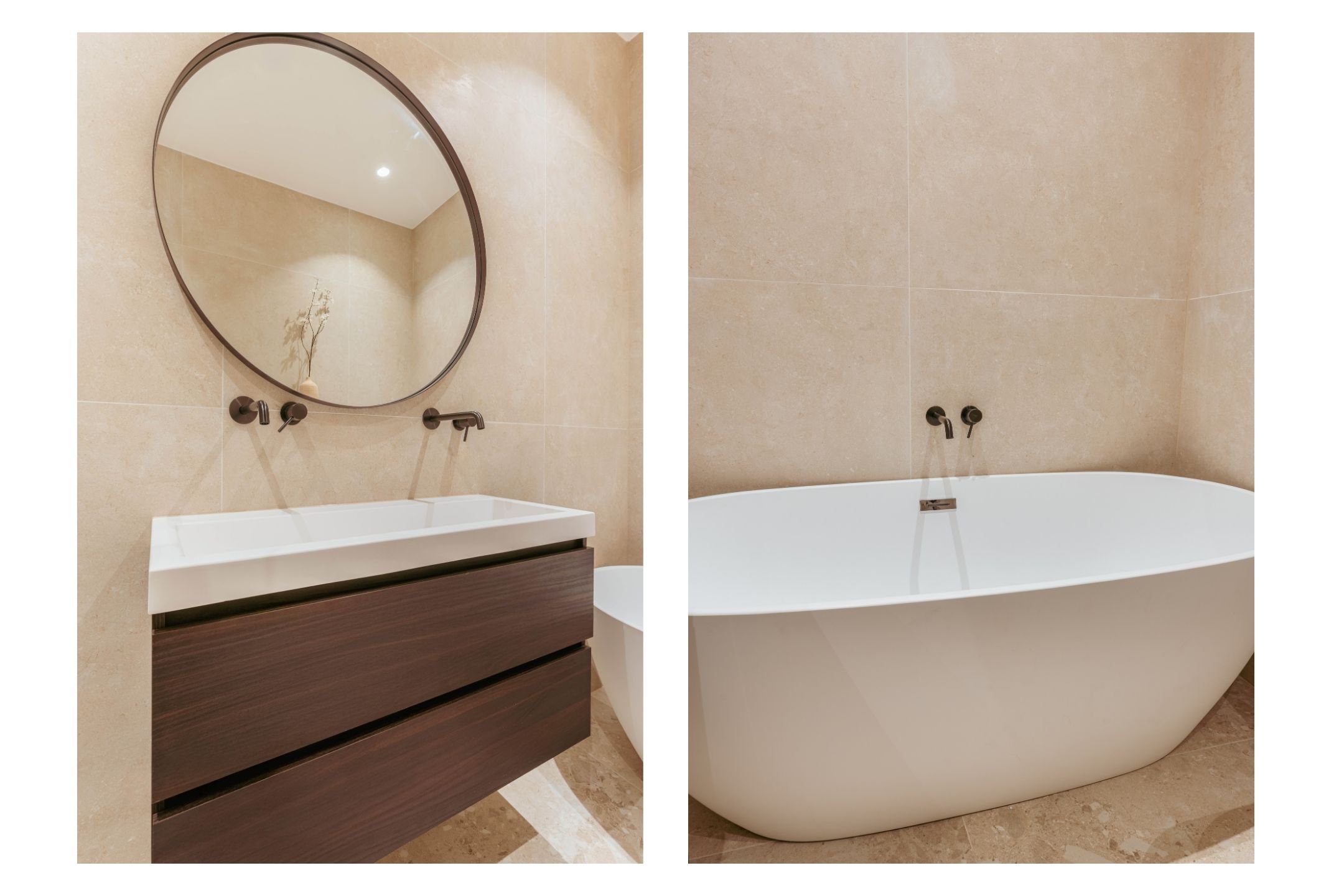 The open-plan kitchen with cooking island and bar forms an elegant whole with the living area and is equipped with all modern conveniences, including a combination oven, dishwasher, fridge-freezer, Quooker and an induction hob with integrated extraction. The island offers space for four to five bar stools, allowing you to cook with pleasure while enjoying views over the greenery and the water. A rare outlook in the city.