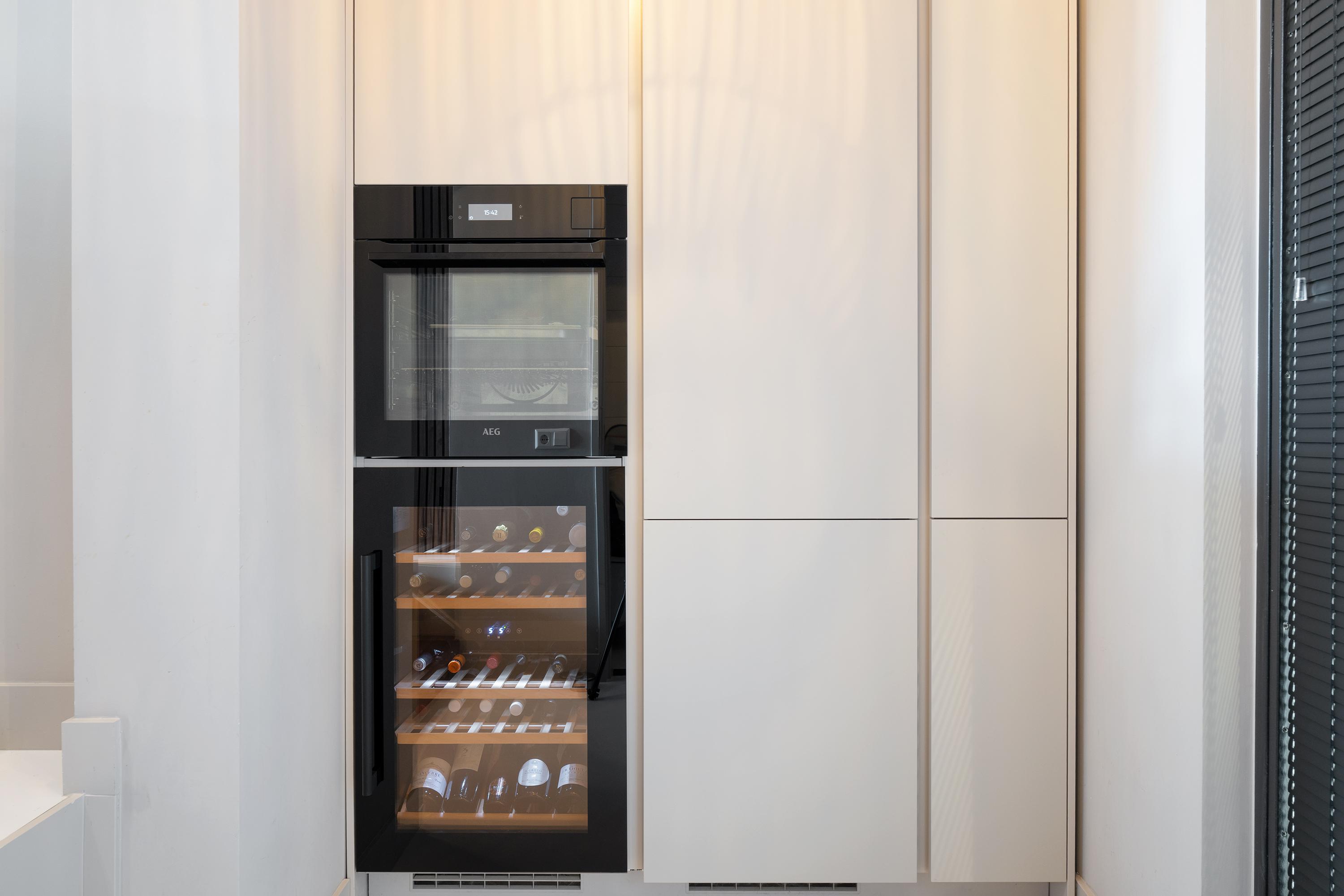 The kitchen offers far more than just a wine cooler. Custom-built wooden cabinetry frames the sleek kitchen equipped with a Quooker tap, BORA induction cooktop, and premium AEG appliances including a combination steam oven, fridge-freezer, and dishwasher. The timeless marble countertop adds a touch of elegance. The kitchen flows seamlessly into the living area, with the poured concrete floor — complete with underfloor heating and cooling — continuing throughout. The custom staircase, featuring a cinewall and electric fireplace, acts as a central design feature.