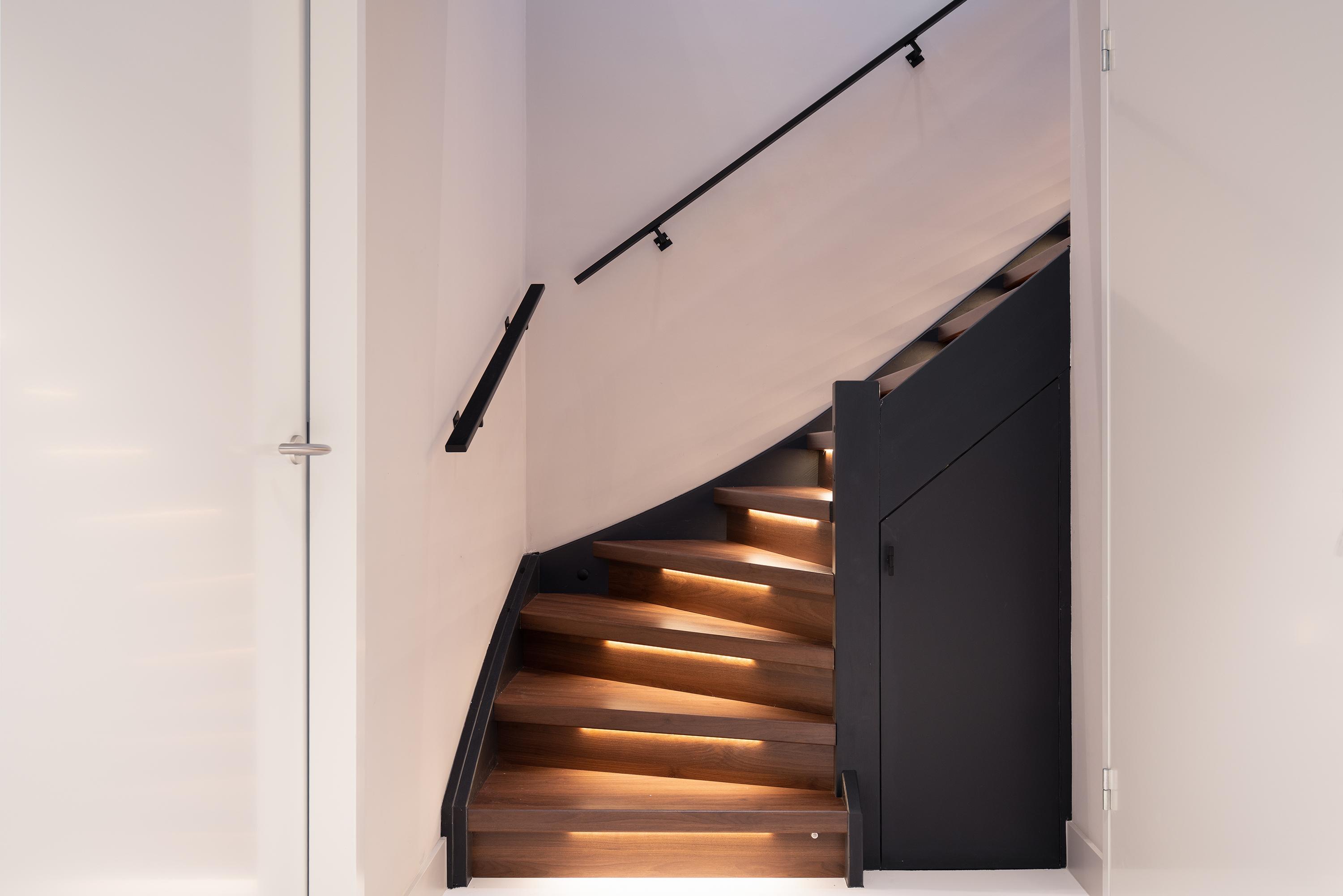 Entrance hall, guest toilet, high-end kitchen with built-in appliances, waterfront living area with access to the terrace, jetty, and mooring. The entire floor features built-in lighting based on a well-designed lighting plan. From the living room, stairs lead to the lower level.