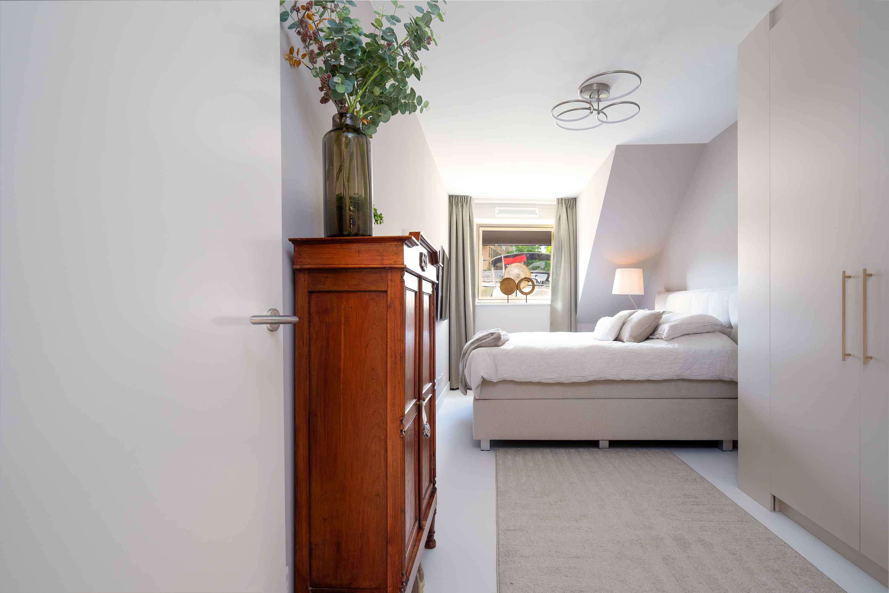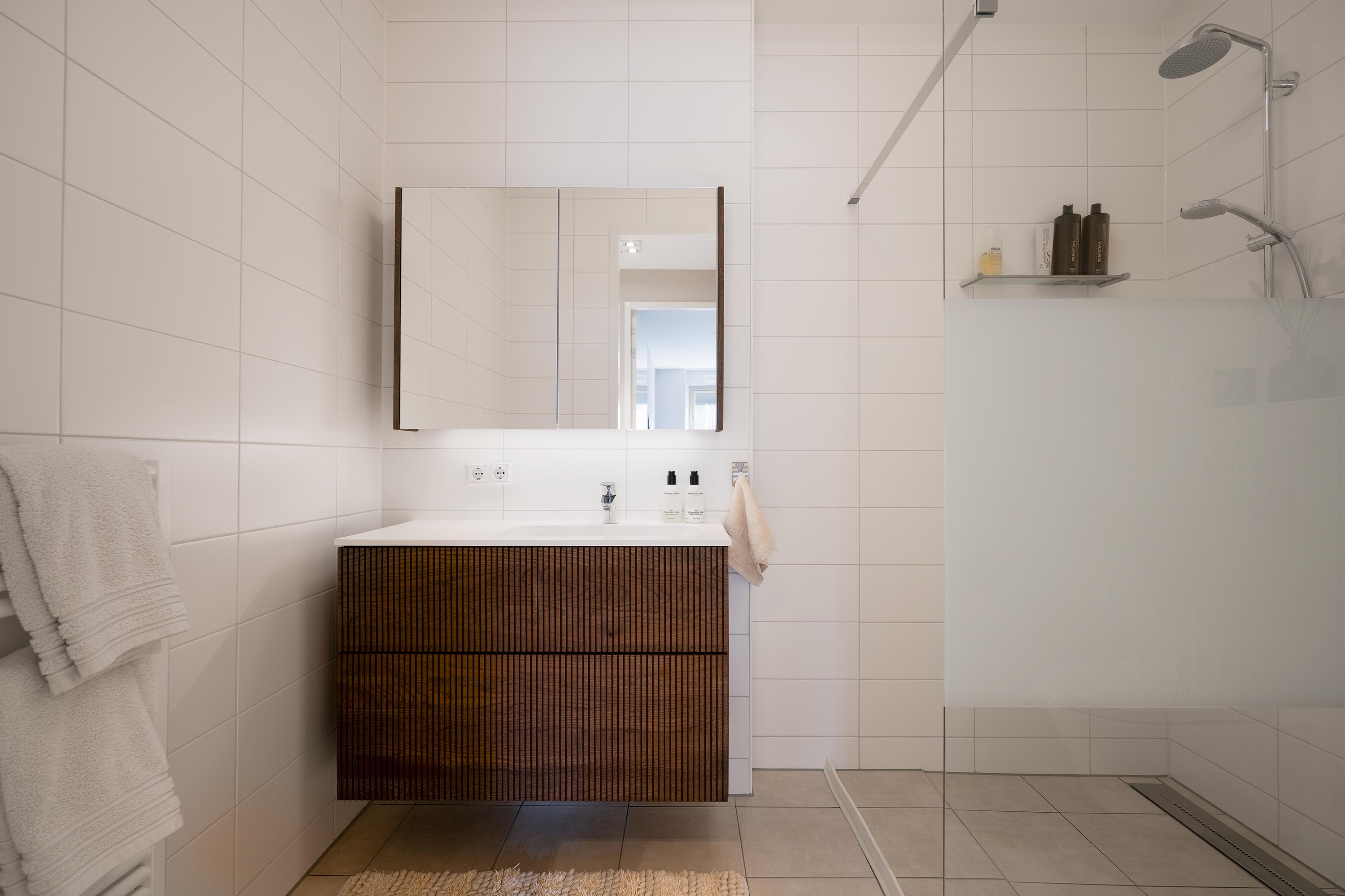 Spacious central hallway, utility room with washer/dryer setup in custom-built cabinetry (both AEG machines available for takeover), master bedroom with a high-end custom wardrobe by De Maatfabriek, second bedroom/guest room, modern bathroom with walk-in shower, second toilet, and washbasin. This level is ideal for sleeping or working, with ample natural light and windows that open in both bedrooms.