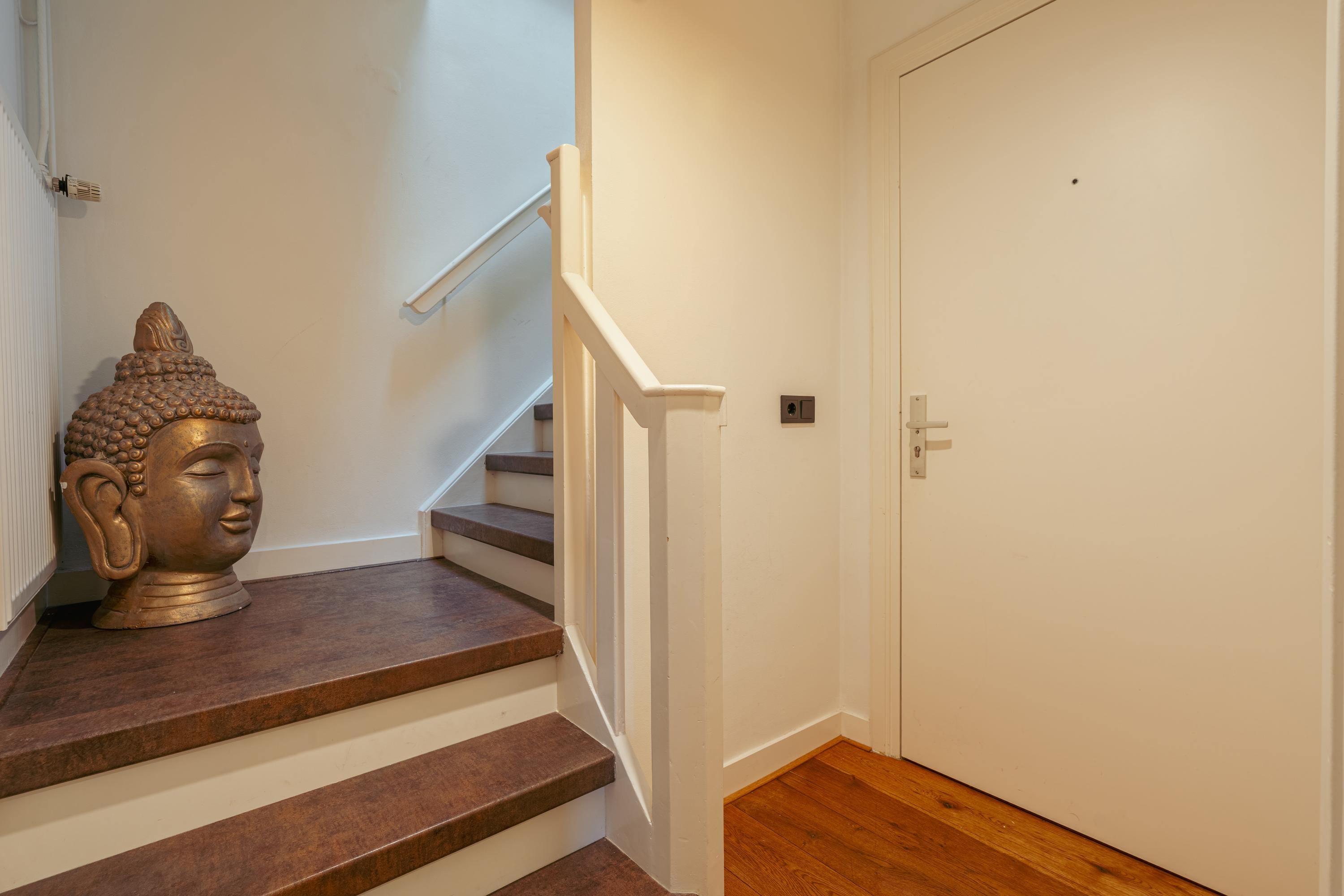 A staircase in the hallway leads to the fourth floor, the second living level. The landing features a large built-in wardrobe providing ample storage and a clean, organized appearance. A skylight allows pleasant daylight to enter.