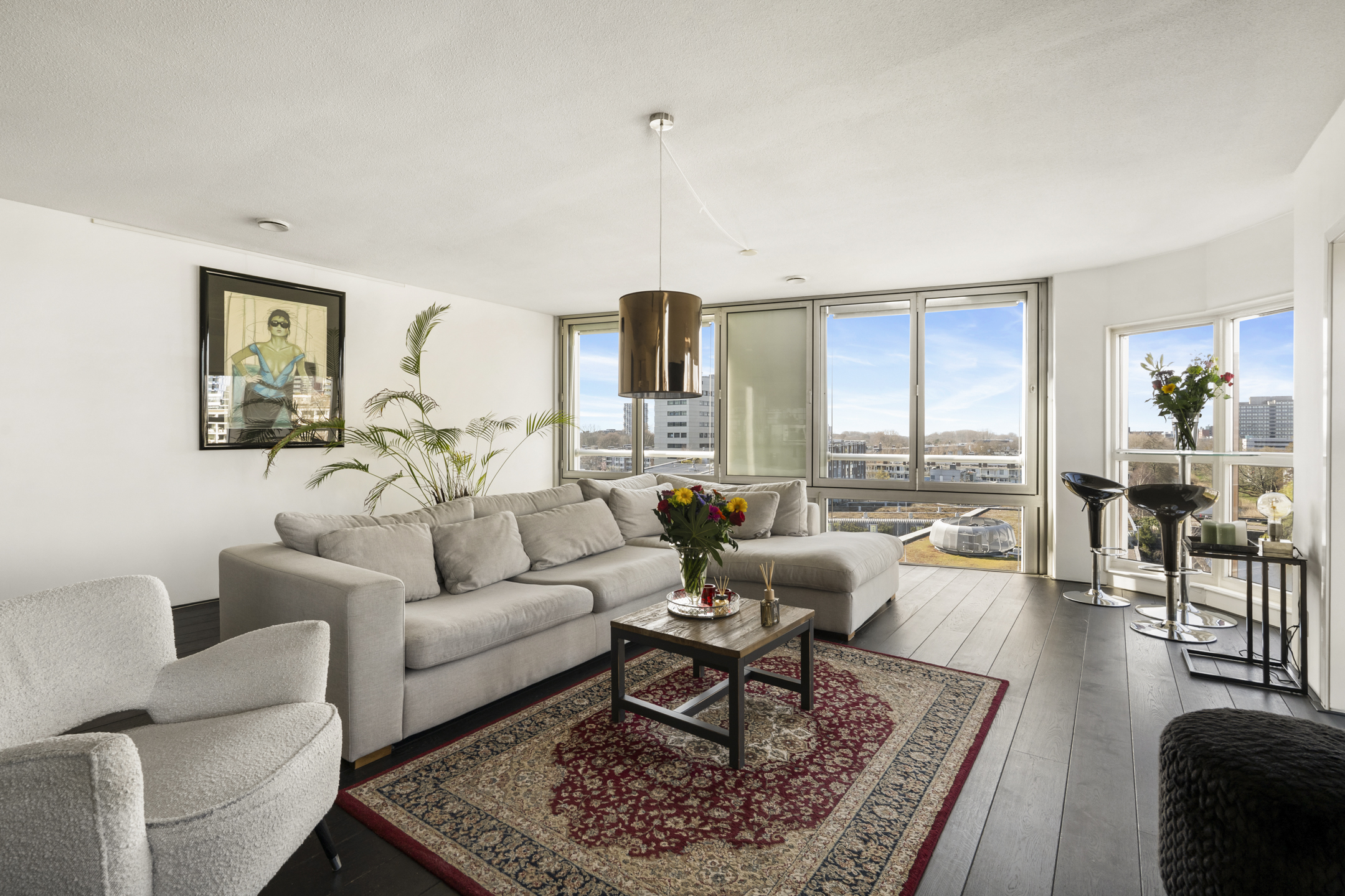 Apartment Amsterdam on the seventh floor of the Gelderhof complex offers 117 m² of refined living space and panoramic views over the water and the Zuidas skyline. This corner residence is designed for abundant natural light, with southwest and north-facing floor-to-ceiling windows that frame the city and waterfront vistas. The property features two spacious bedrooms, currently configured as a main suite with walk-in closet, a luminous living area with glass walls and fold-away façade, and a high-spec kitchen with island, solid oak parquet, and built-in appliances, all executed with clarity and purpose.