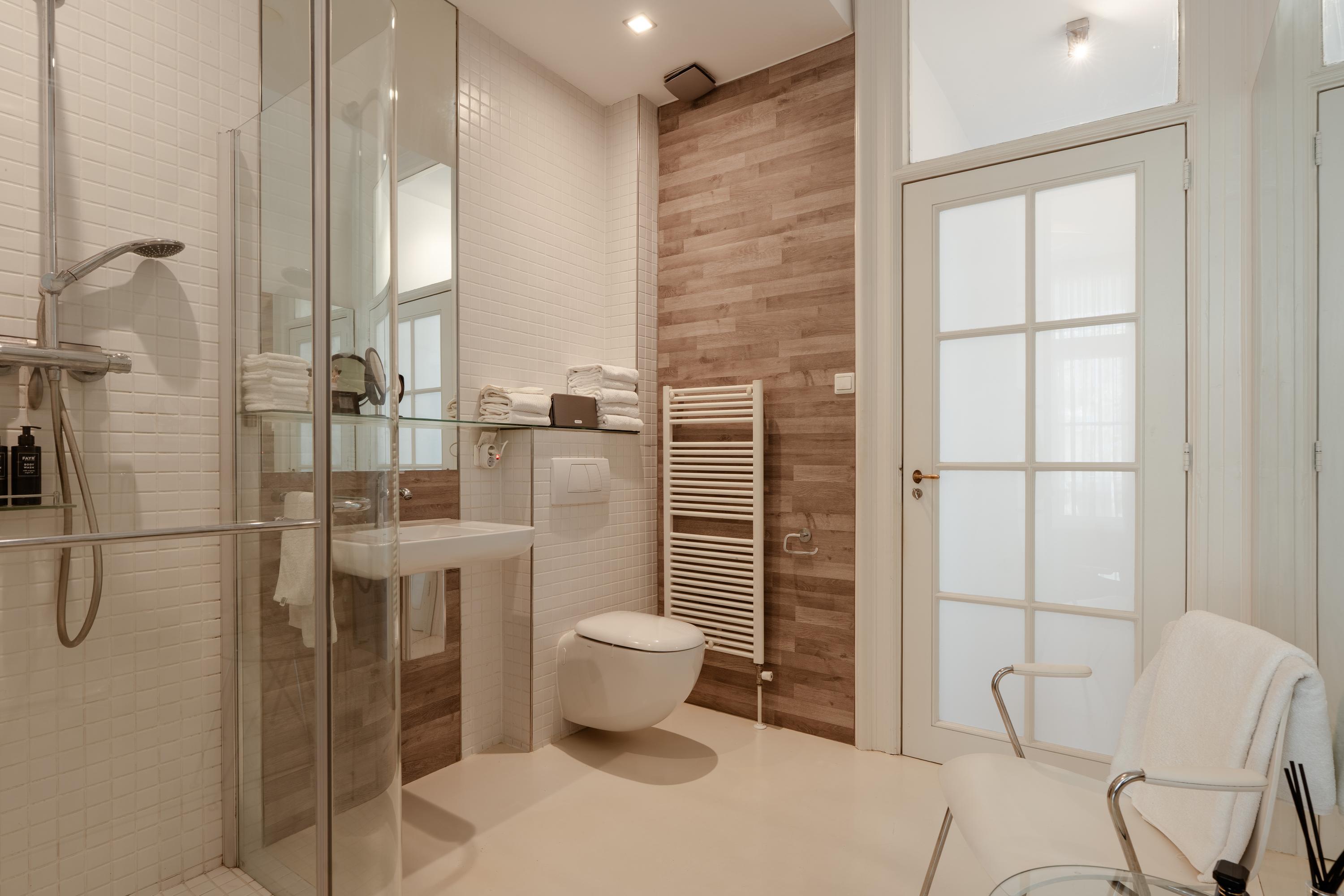 Aangrenzend aan de slaapkamer bevindt zich de en-suite badkamer, bereikbaar via een schuifwand en uitgerust met een inloopdouche, wastafel, toilet en designradiator.