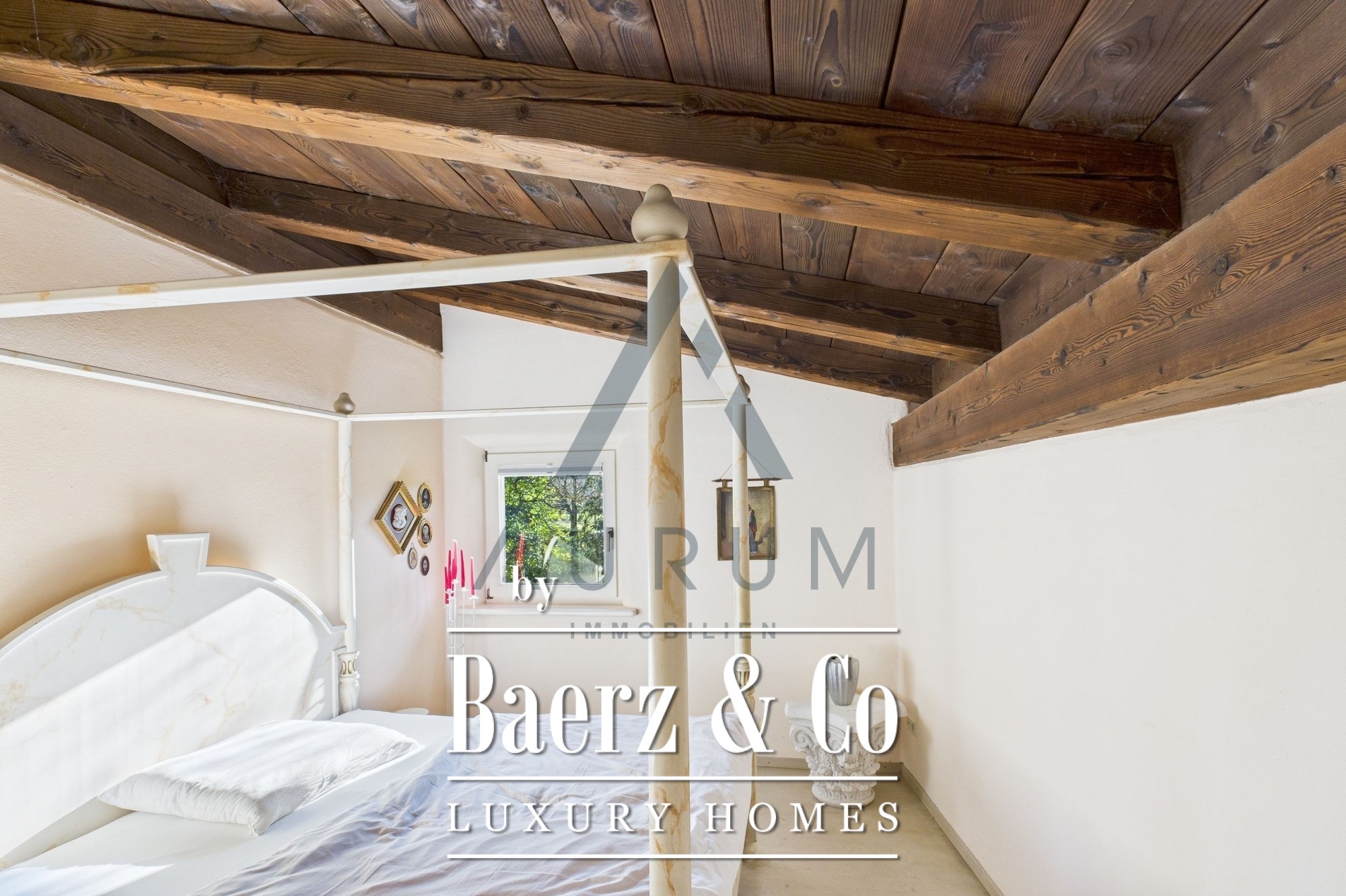 The heart of the house unfolds upstairs, where exposed roof beams, a tiled stove, and Italian floor tiles frame the 50 m² living room. Daylight moves through a large sliding door onto the southwest-facing terrace, connecting seamlessly to the meticulously kept garden. A traditional eat-in kitchen, complete with paneling, a dining area, additional oven, and pantry, creates space for convivial meals. This floor is completed by a bedroom, a dressing room, and a bathroom. Downstairs, two more bedrooms open directly to the garden, joined by a second bathroom with a bathtub.