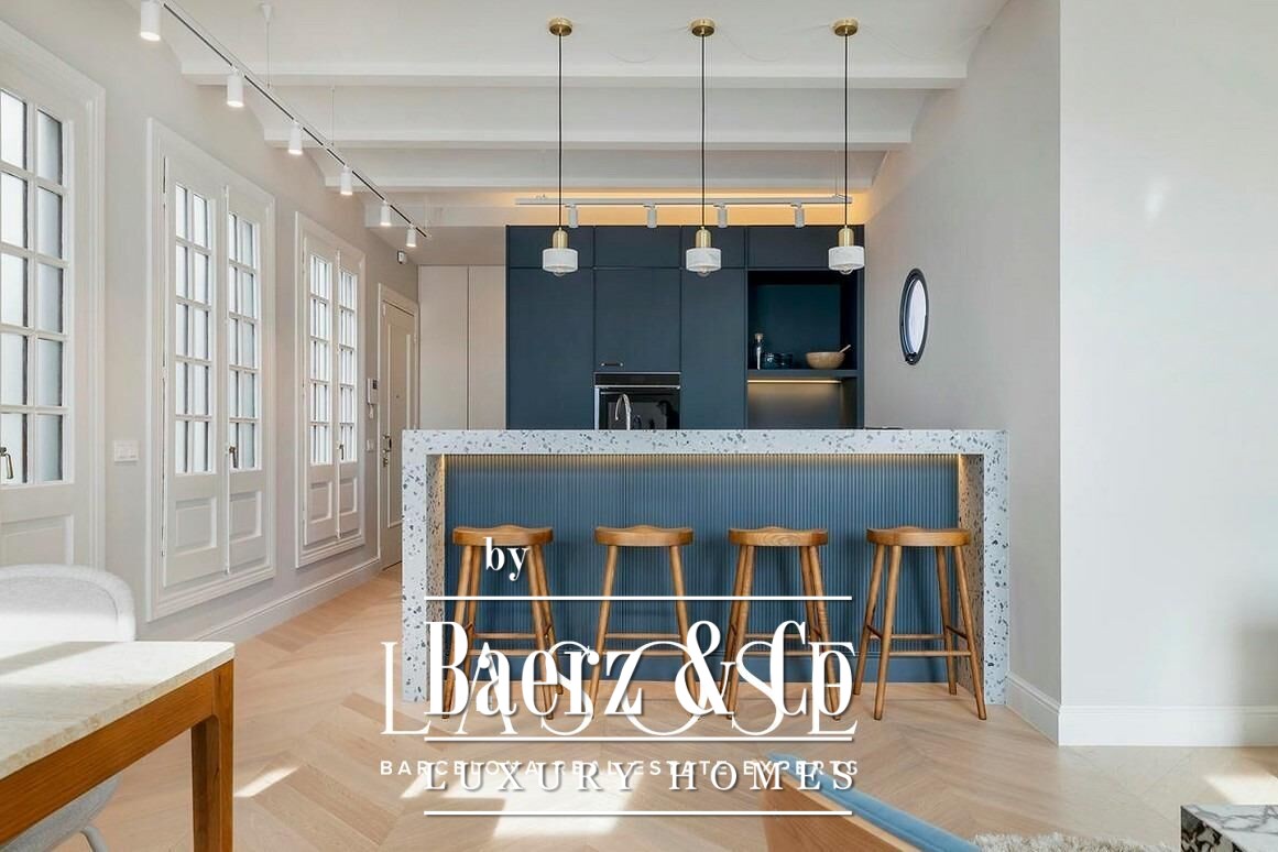 The top floor, occupying the sixth and final level, is dedicated to light-filled day spaces. A bright living and dining area unfolds into a fully fitted open-plan kitchen, opening further onto a 22 m² south-facing terrace where panoramic city views balance tranquillity and energy. The architectural details — from the grand entrance hall to original elevators — preserve the timeless essence of the building.