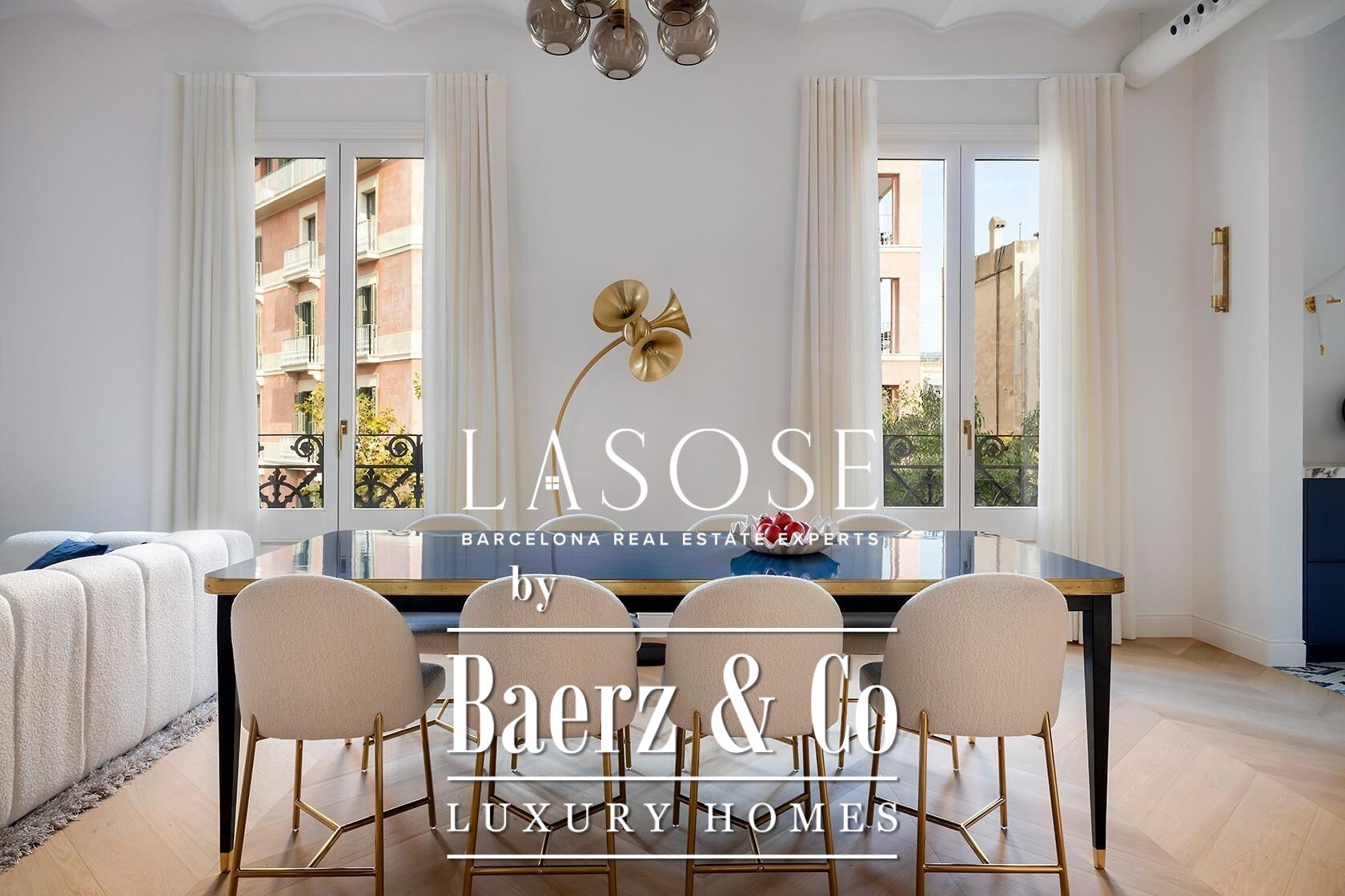 Apartment Barcelona stands as an invitation to refined urban living. This 199 m² residence on the third floor is newly renovated and thoughtfully designed to embrace natural light, with four balcony doors opening over Calle Girona and expansive windows enhancing the luminous atmosphere. The layout flows seamlessly from the open-plan kitchen and dining area to a living room anchored by a bespoke bar and pantry with two wine fridges and a second dishwasher.
