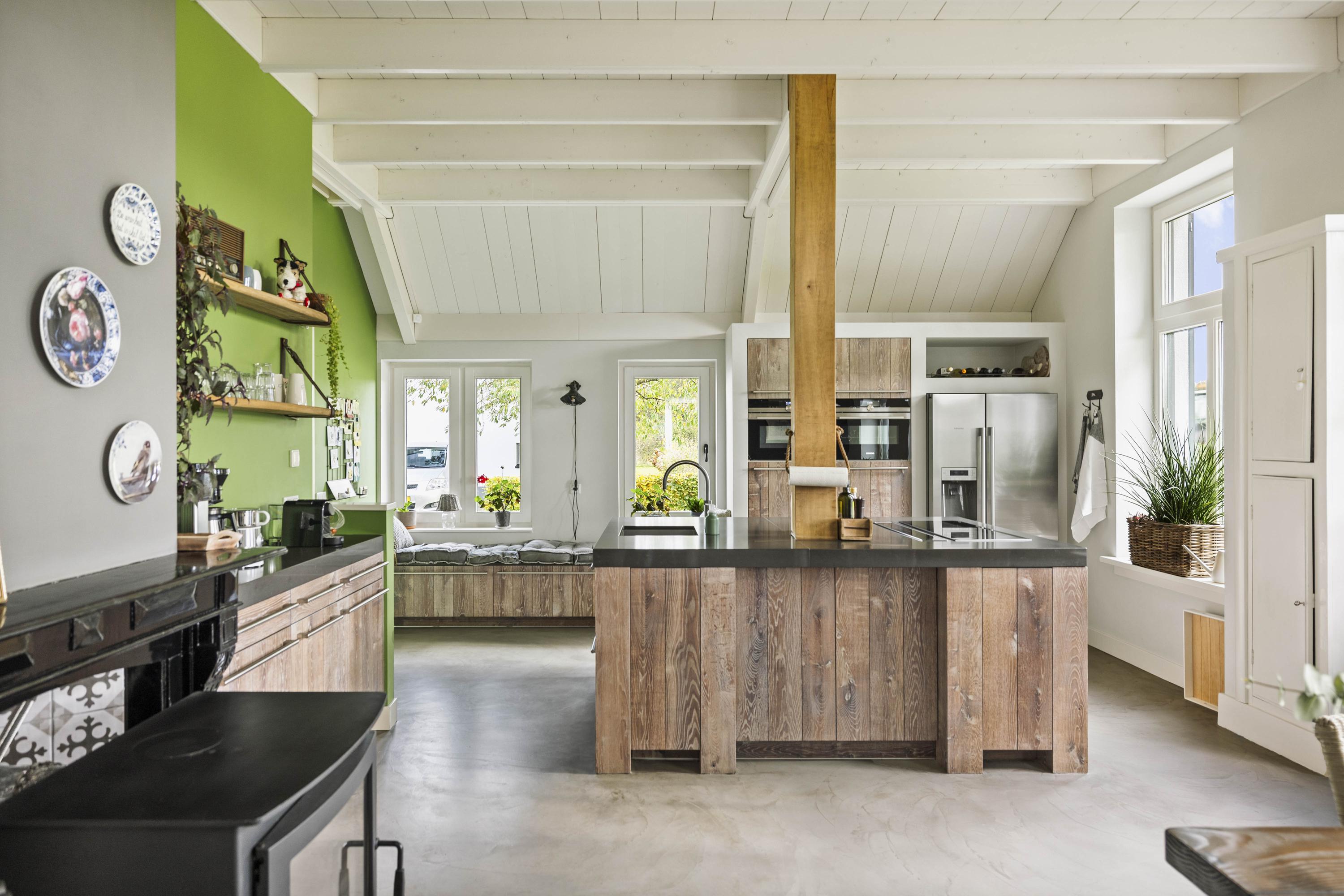 De keuken is maatwerk van Scheffer Keukens Zelhem en is ronduit indrukwekkend; met een dik, composiet werkblad, robuuste massief eiken fronten en alle moderne inbouwapparatuur – van inductieplaat tot Quooker - is het een heerlijke plek om je als chef-kok uit te leven. In de oude schouw staat nog een stoere Nordic Fire houtkachel, die de keuken voorziet van extra sfeer en warmte.