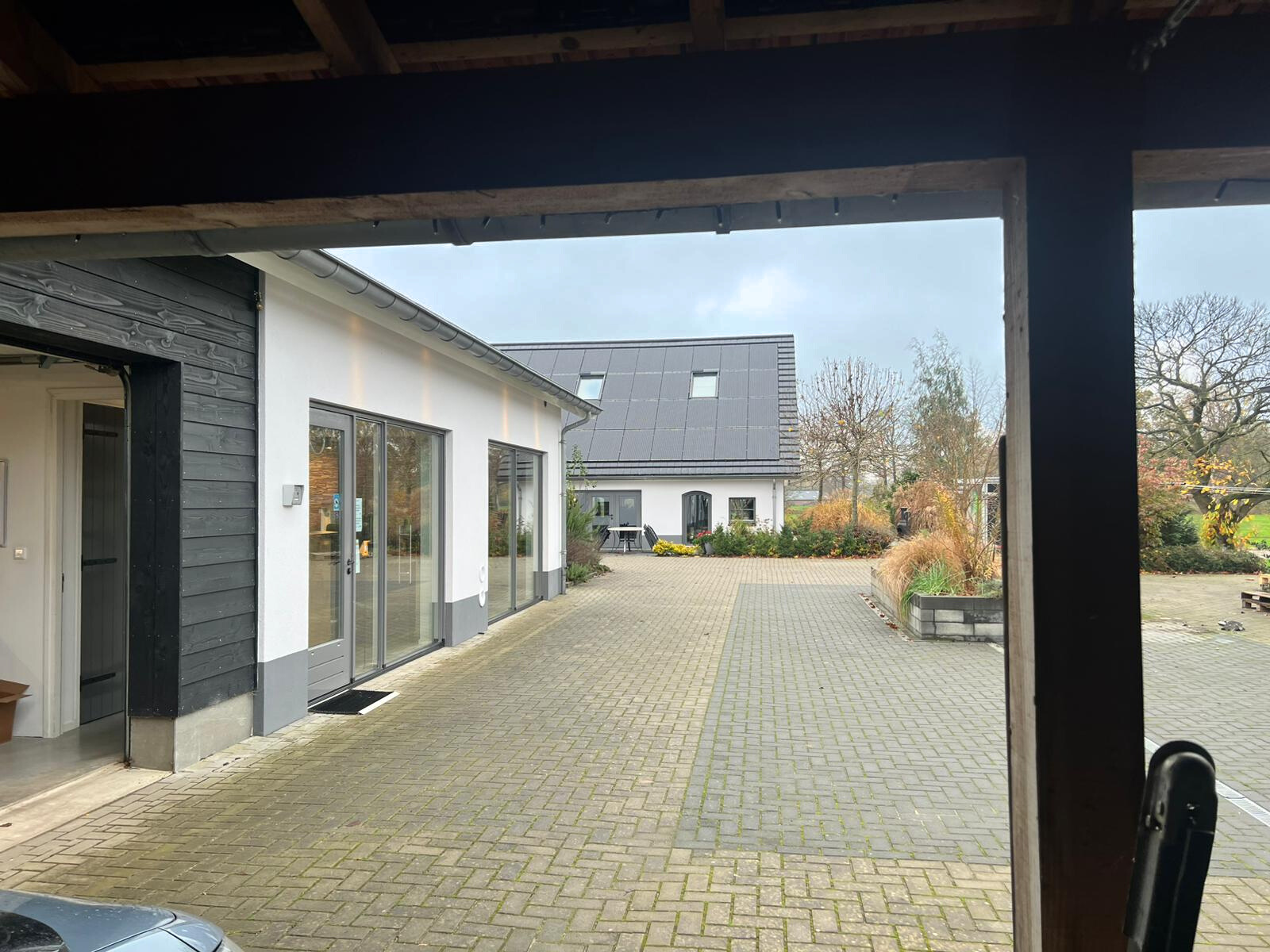 Aansluitend bevindt zich een wagenloods/carport (12m bij 5m). Daarnaast wordt de U-vorm gevuld met een dubbele afsluitbare garage (46 m²) en aansluitende tweede grote opslag-/stallingsruimte (ca. 62 m²). Op het bestrate buitenterrein is er parkeerruimte voorzien ten behoeve van minstens zes auto’s met een oplaadpaal 22kW (nu openbaar beschikbaar).