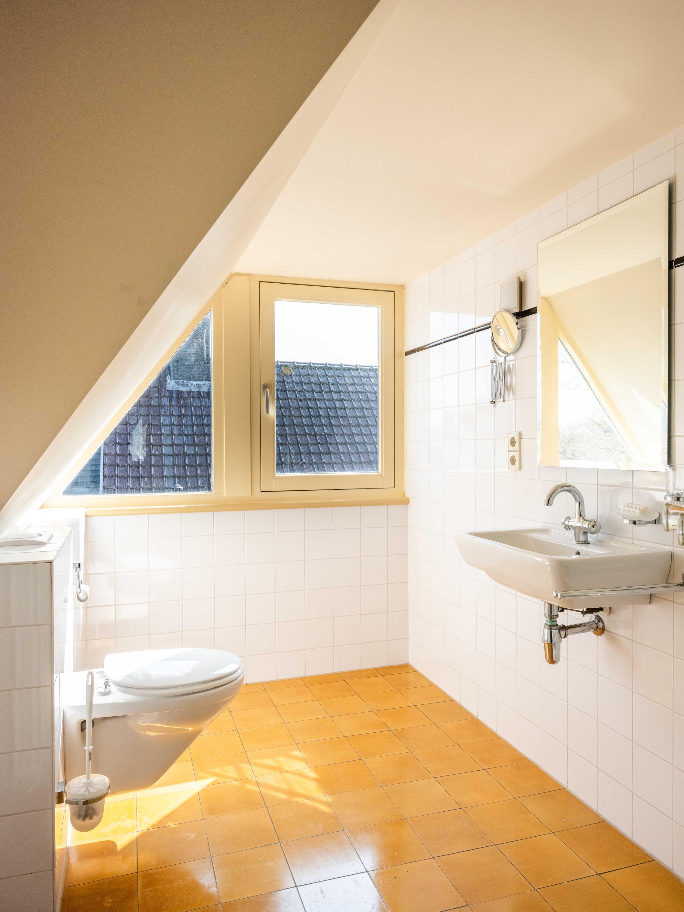 Upstairs you will find 3 bedrooms, one of which has a washbasin. The rear bedroom also has access to the bathroom. The bathroom has a double sink, a bathtub and walk-in shower. A separate toilet is located on the landing.