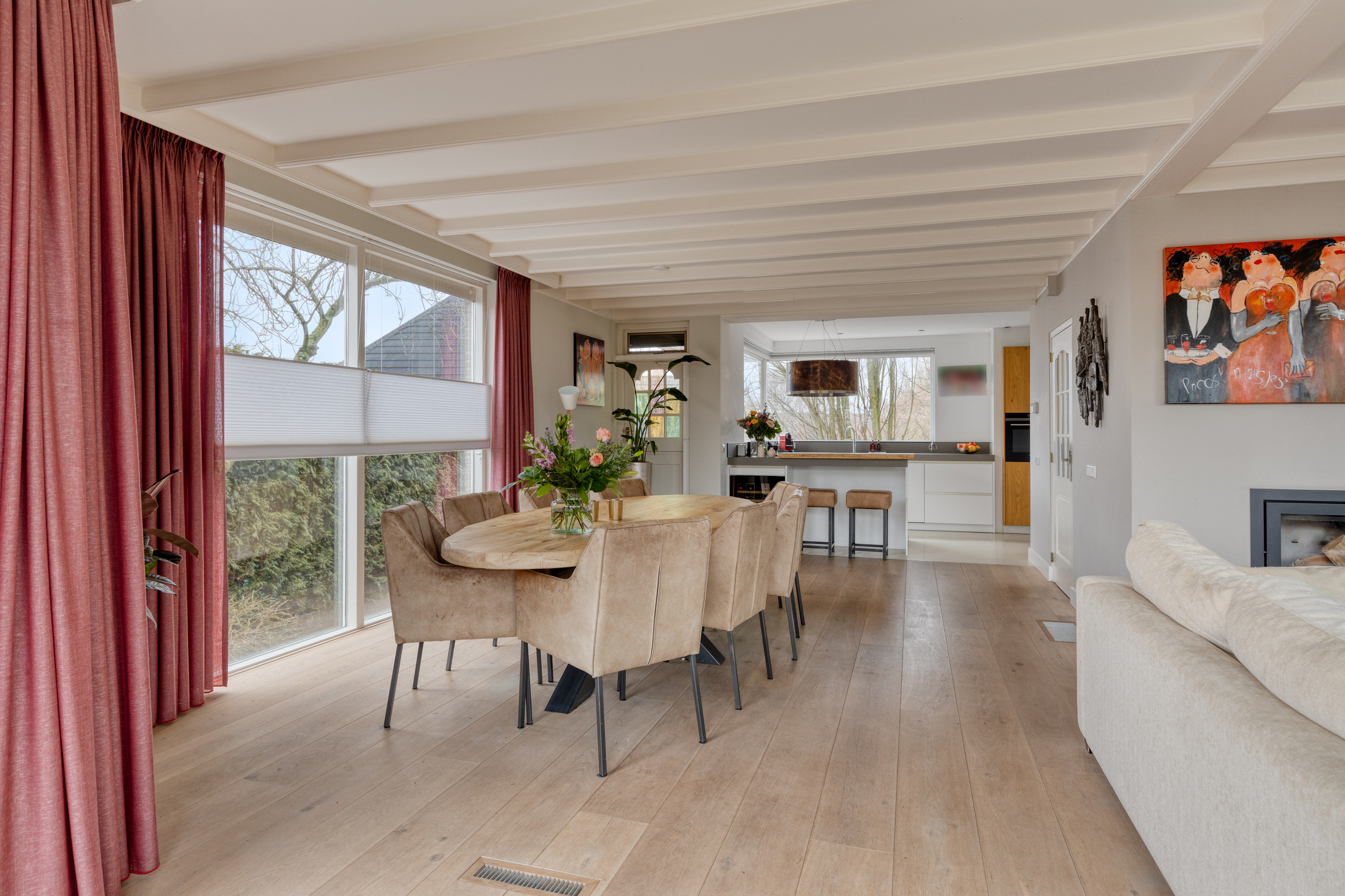 A large driveway with electric charging point introduces the property, complemented by a private garage. Expanses of glass and a serene conservatory suffuse the main living area with light, where a wooden floor and open fireplace create a welcoming atmosphere. The kitchen, with its modern island and extensive built in appliances, includes features such as a climate cabinet, Quooker and steam oven. Adjacent balconies and gardens offer seamless transitions between indoor and outdoor life, with sun throughout the day and practical roll down shutters, sun awnings and twenty solar panels ensuring both comfort and efficiency.