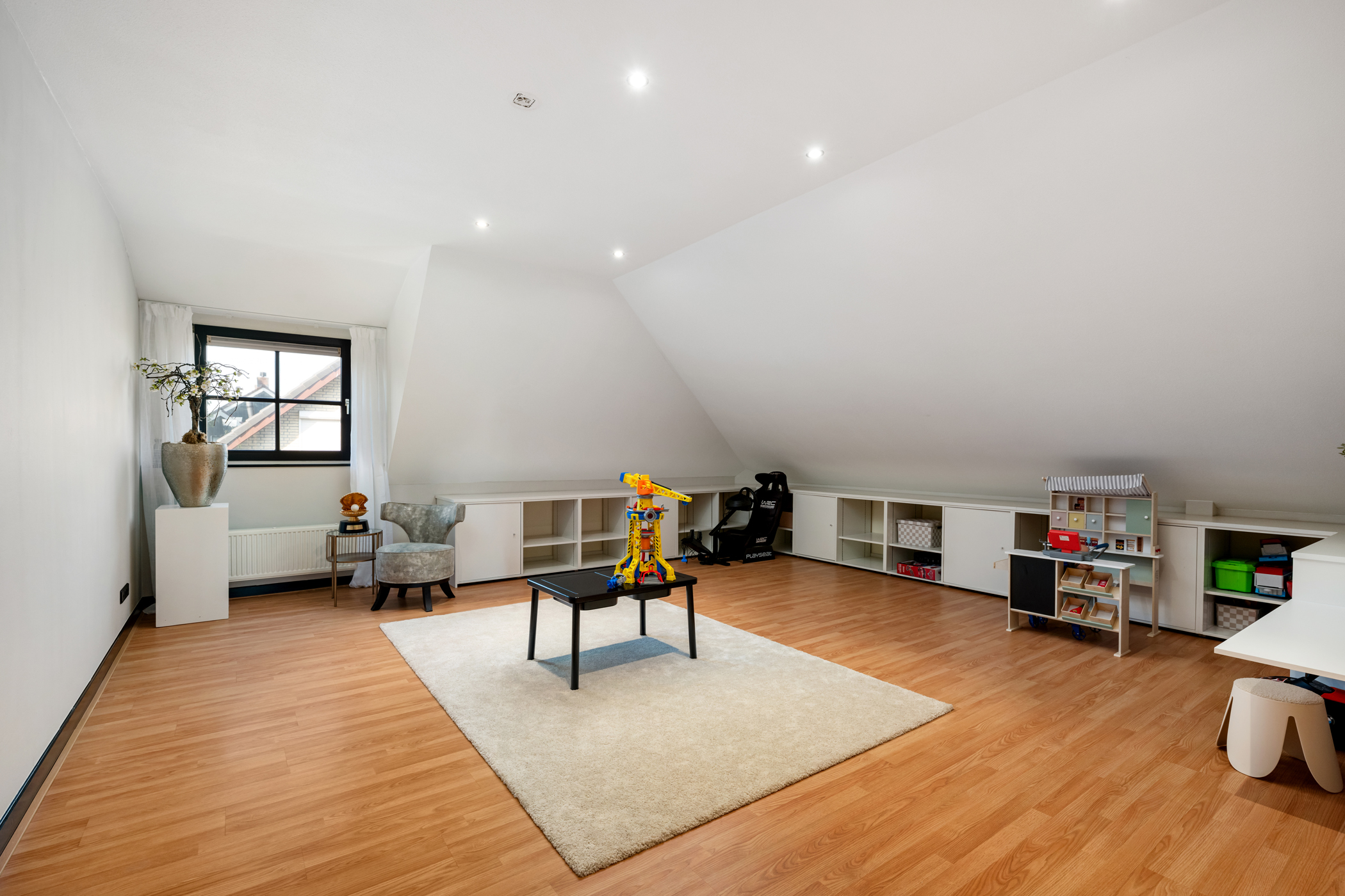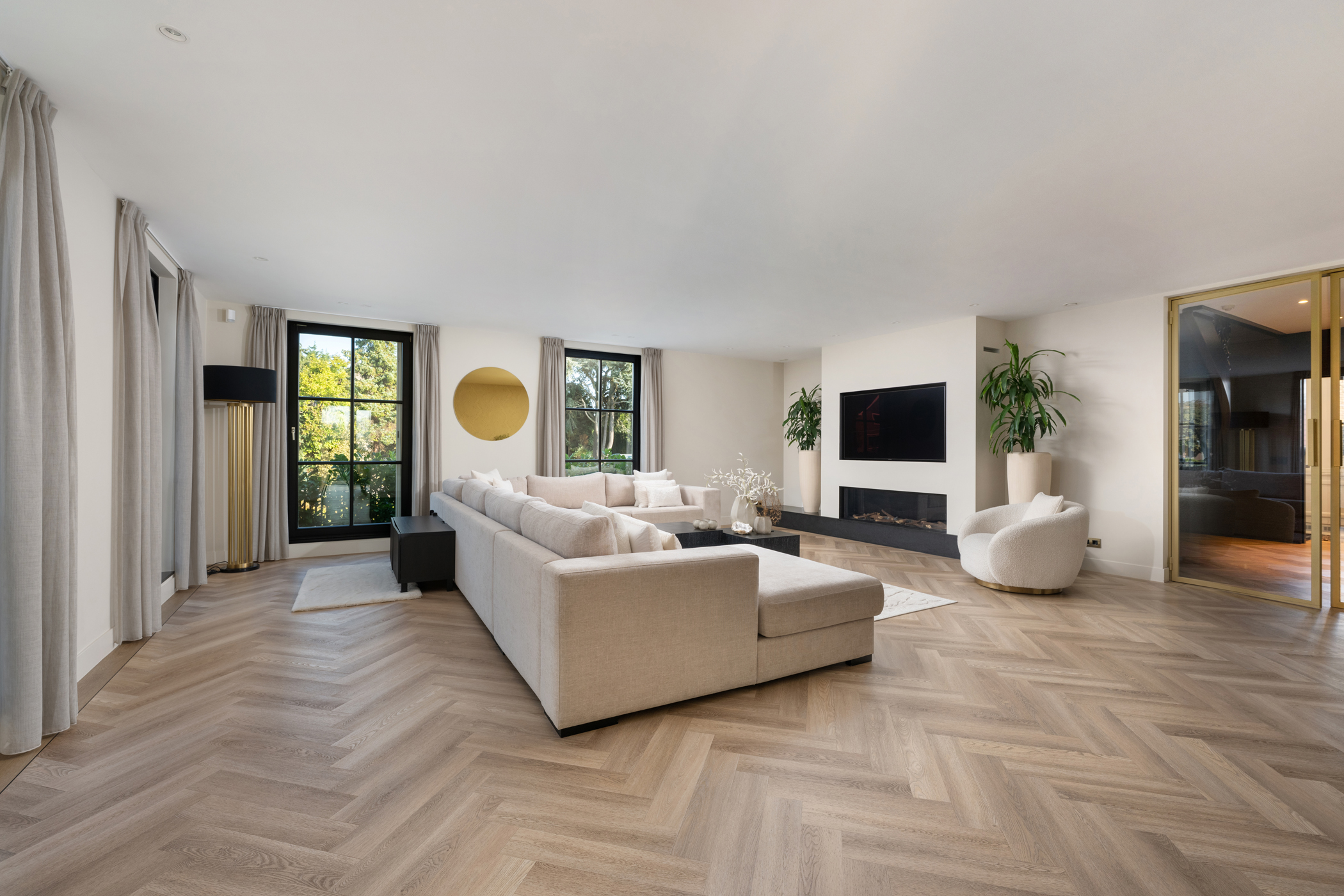 The generous living room features a modern electric fireplace, screens, roller shutters, and air conditioning, as well as a PVC herringbone floor with underfloor heating. Large windows ensure the space is filled with natural light and feels bright and airy.