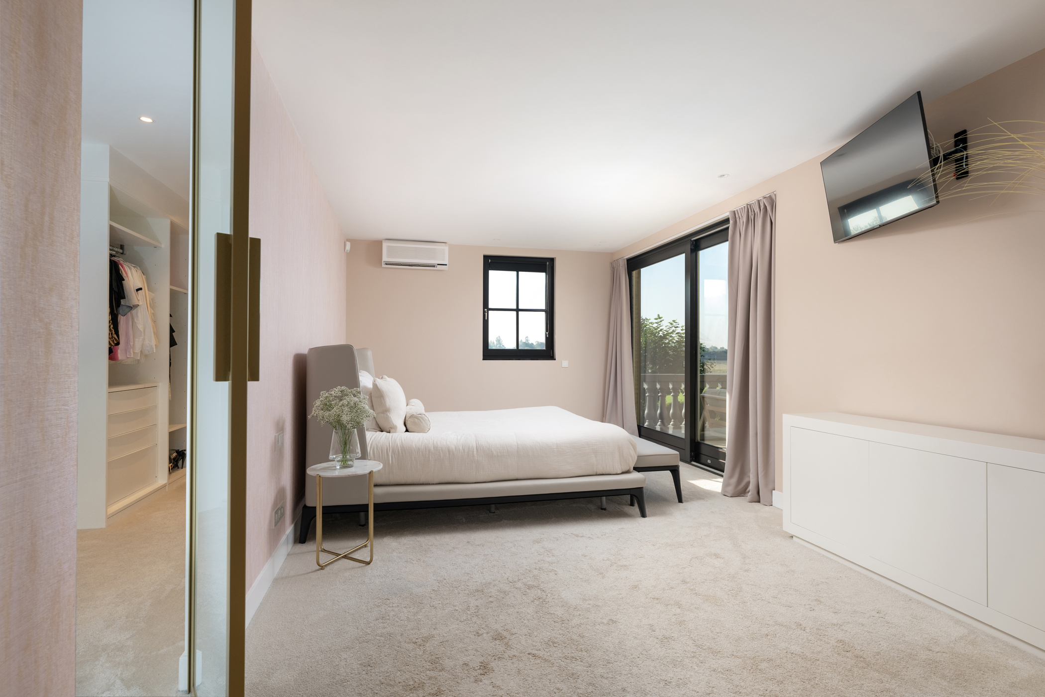 The master bedroom on the ground floor features a modern ensuite bathroom with bathtub, double washbasin, shower, and toilet. The bedroom is equipped with air conditioning, carpet flooring, and a walk-in closet, and also provides direct access to the terrace through sliding doors.