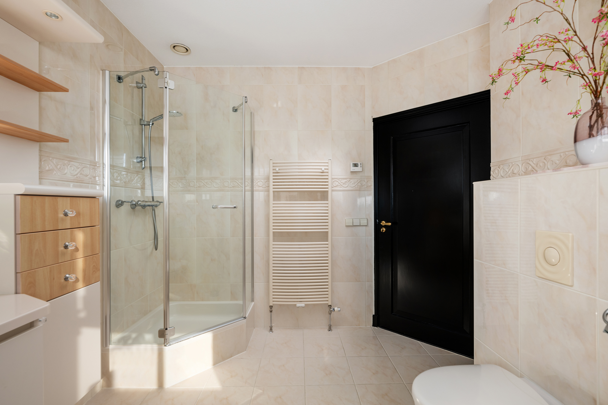At the end of the landing is the second bathroom, fitted with a toilet, washbasin, and shower cabin.