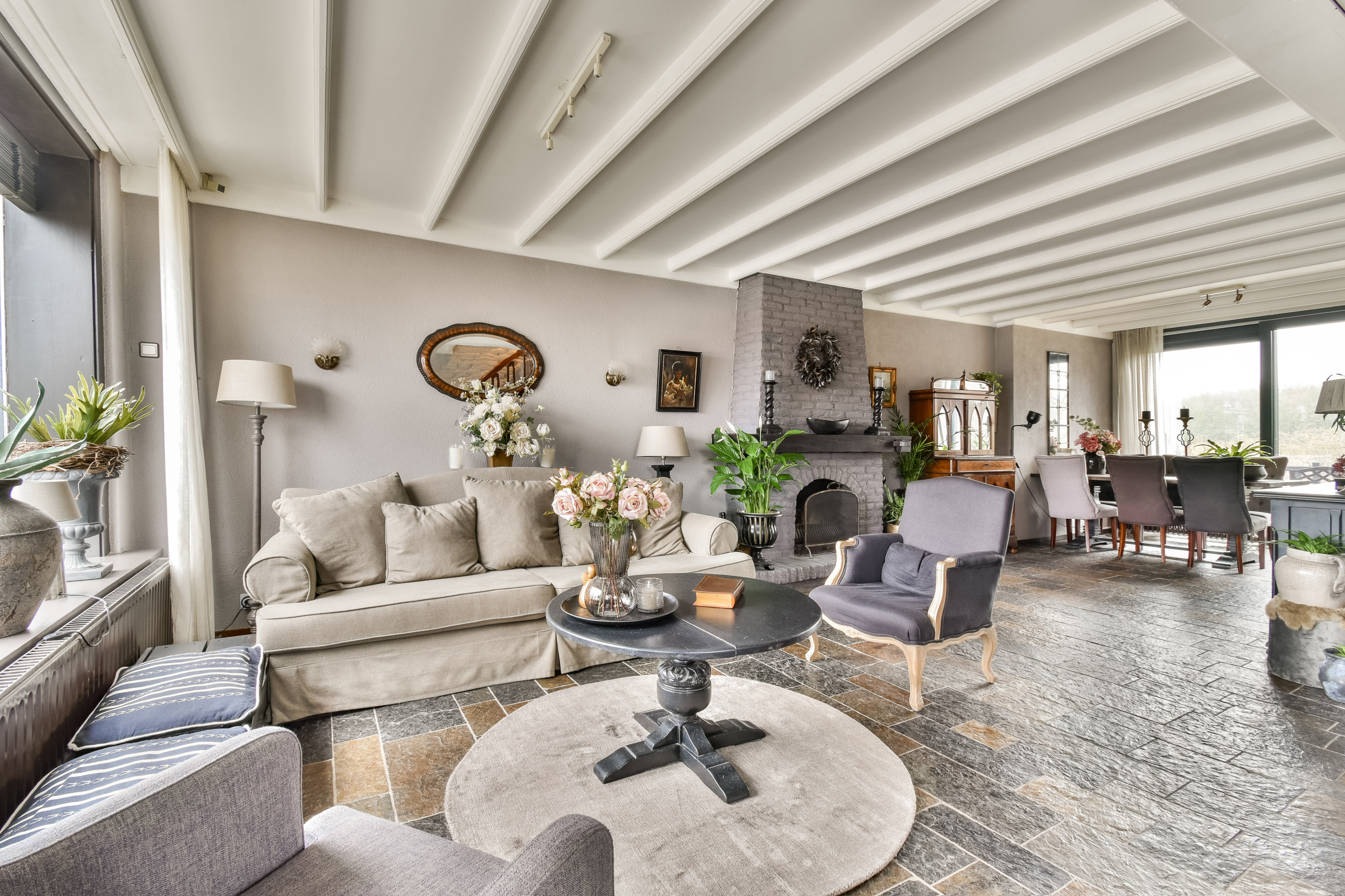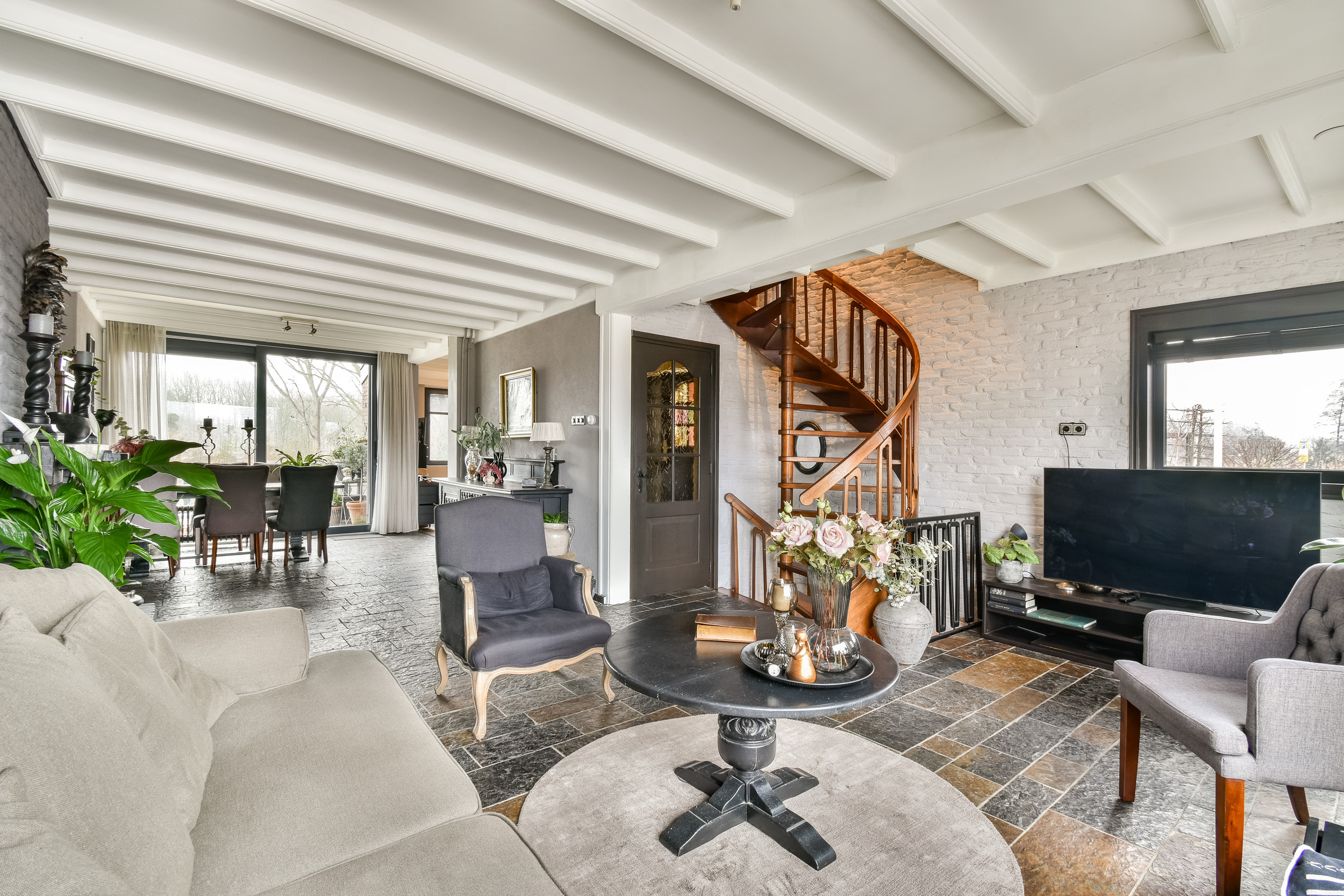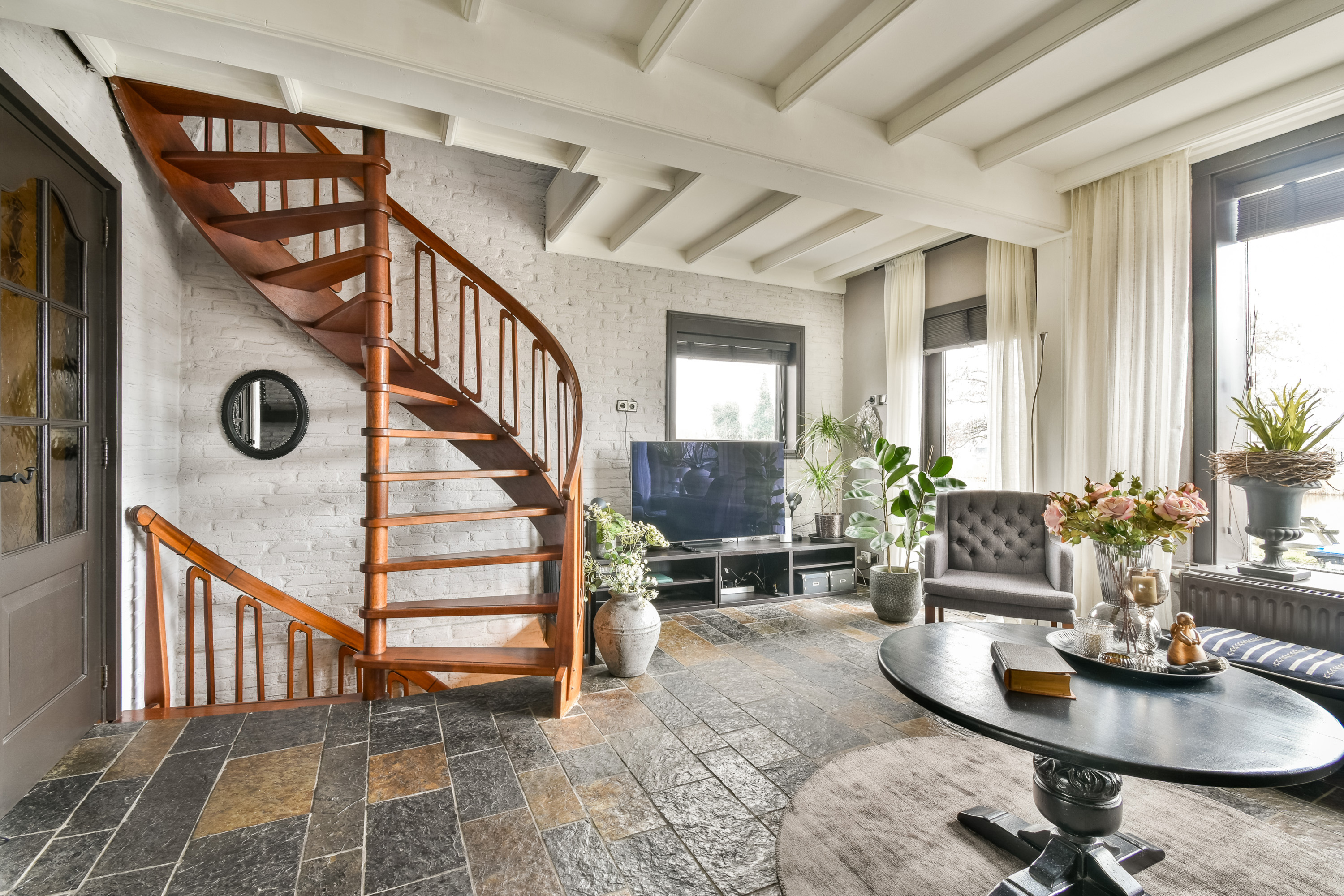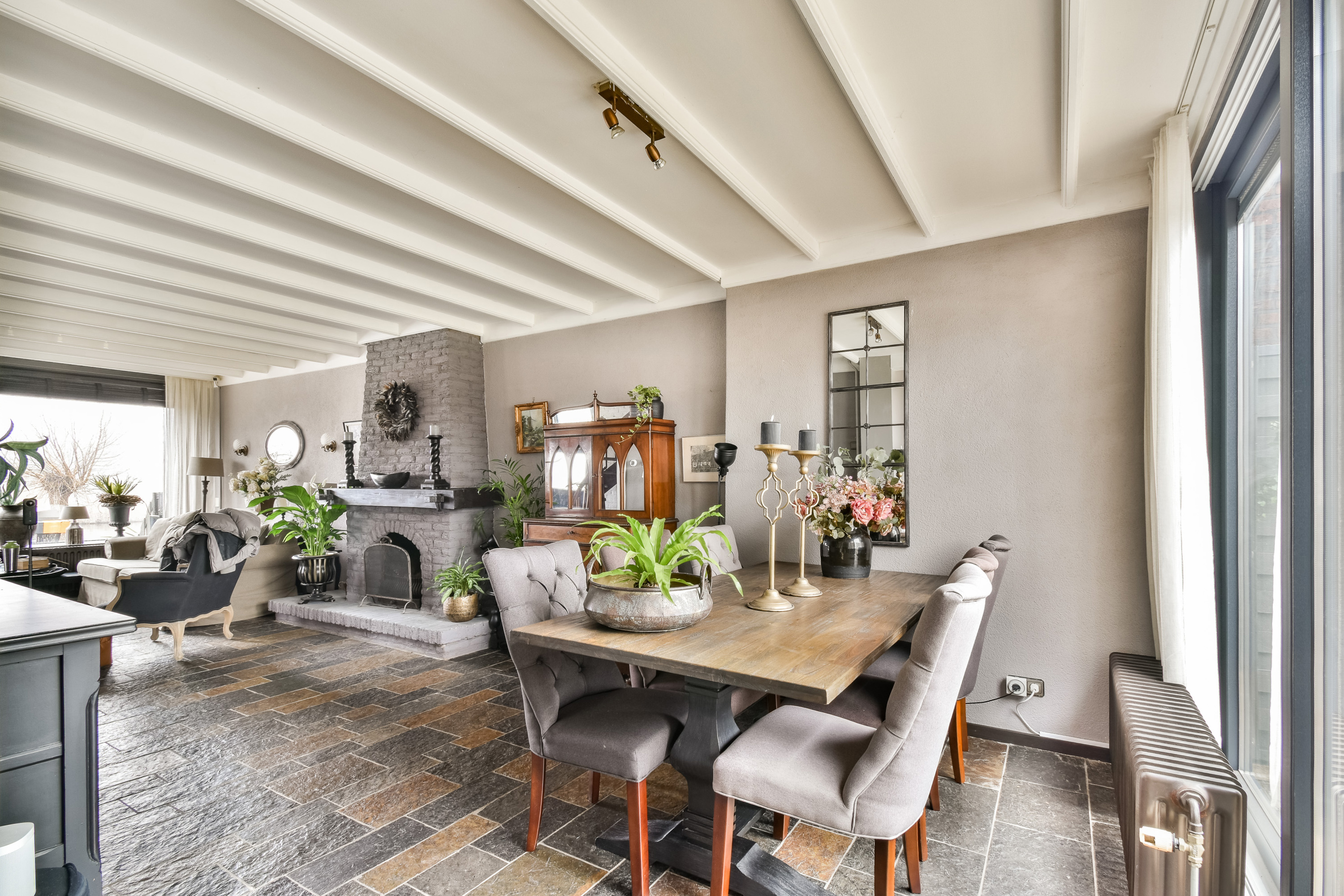 The charming living room at the front is wonderfully bright thanks to the large windows and features a cozy fireplace and underfloor heating. From the sitting area, you have beautiful views over the Rotte.