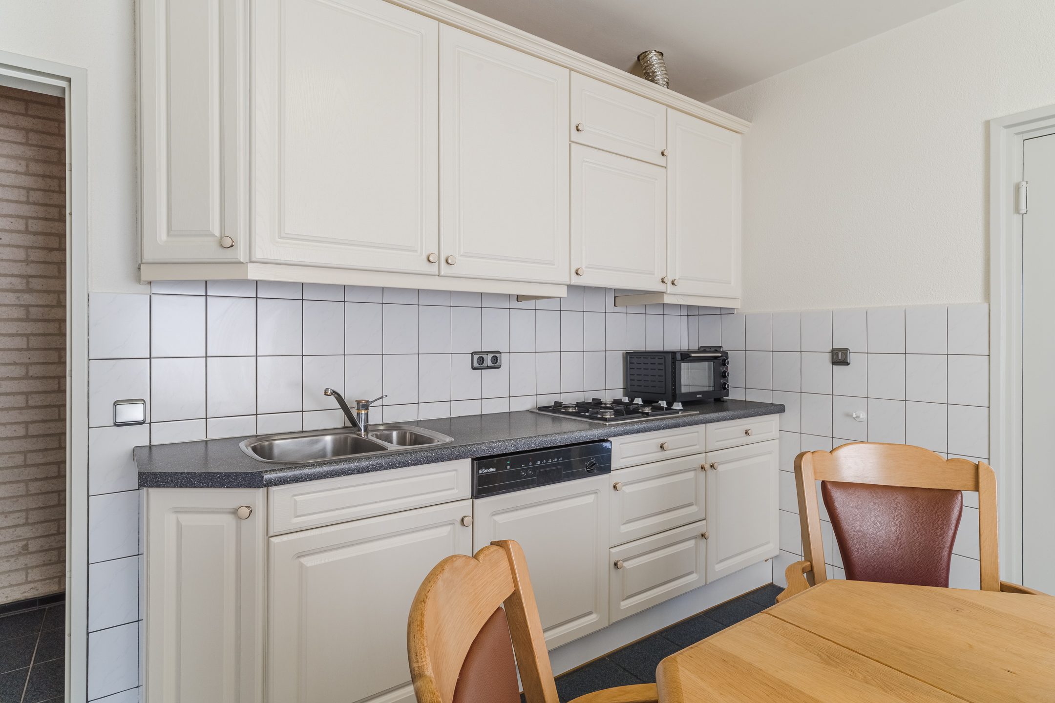 Approx. 15.5 m², tiled flooring with underfloor heating, partly tiled walls, plastered ceiling, and two parallel kitchen units equipped with a 4-burner gas hob, extractor hood, 1.5 sink, refrigerator, combination microwave, dishwasher, and deep pantry under the stairs.