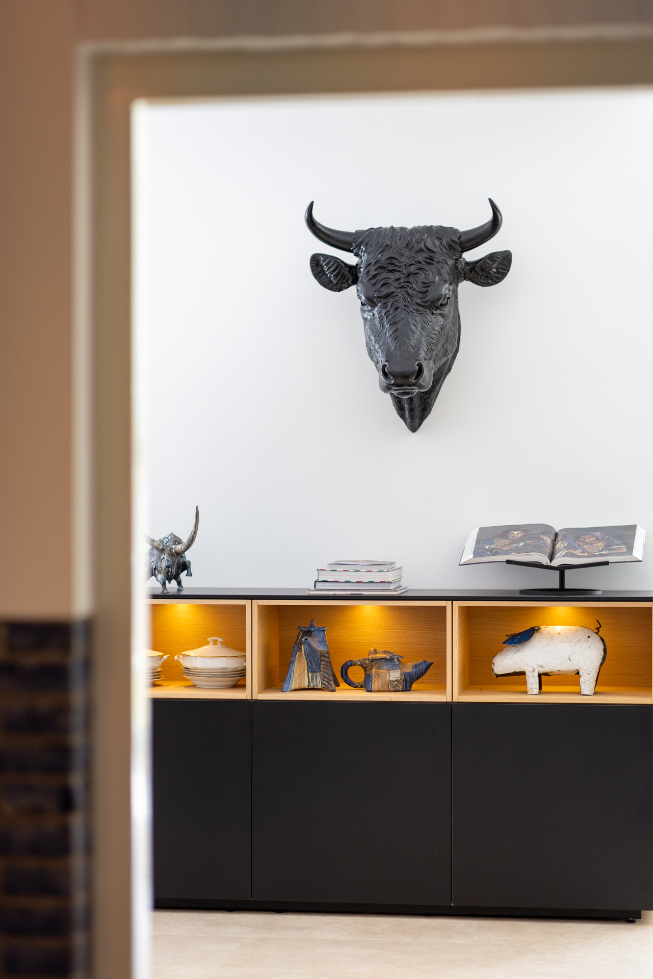 The living room was expanded in 2005. The extension connects nicely to the thatched roof, making the garden doors extra high and offering a fantastic view of the garden. With the windows all around, the living room has a beautiful light. From the living room you have access to the second office / fitness room and through a beautiful sliding door to the kitchen.