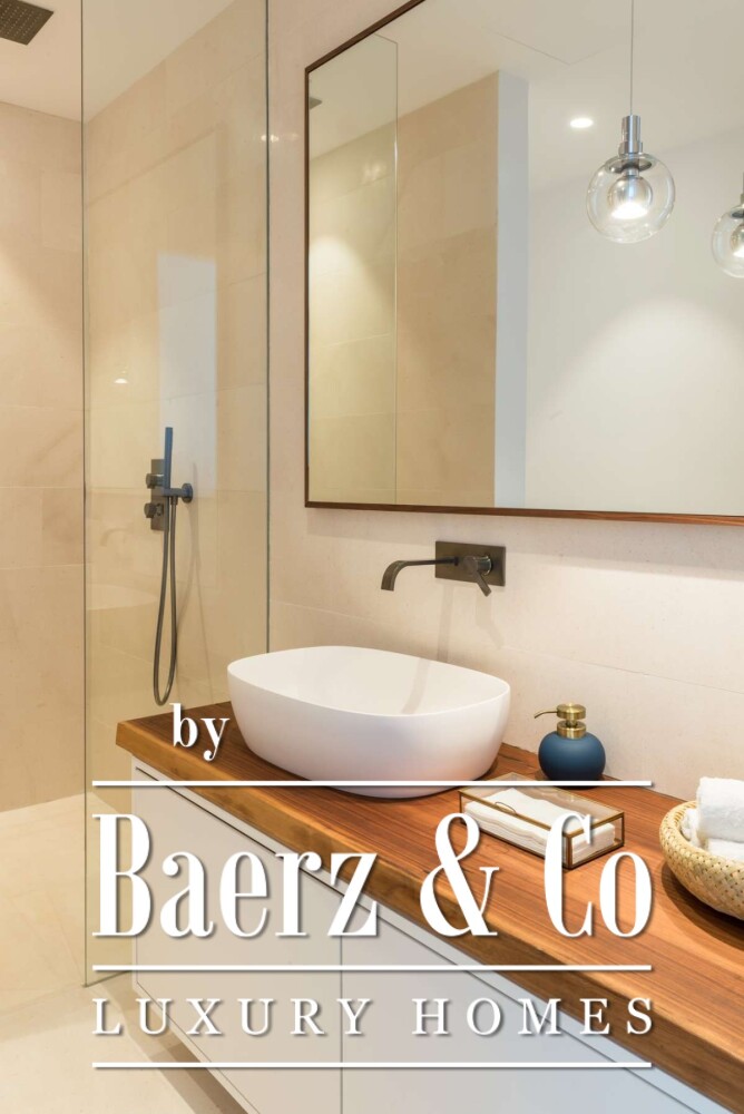 The upper level is designed for privacy, offering a master suite with dressing room, double shower, and a private patio with outdoor bath. Three further bedrooms each have en-suite bathrooms fitted with Antonio Lupi elements. A gym, elegant bodega, guest bathroom, and versatile basement extend the possibilities for well-being and entertaining. The independent guest apartment provides comfort for visitors or staff.