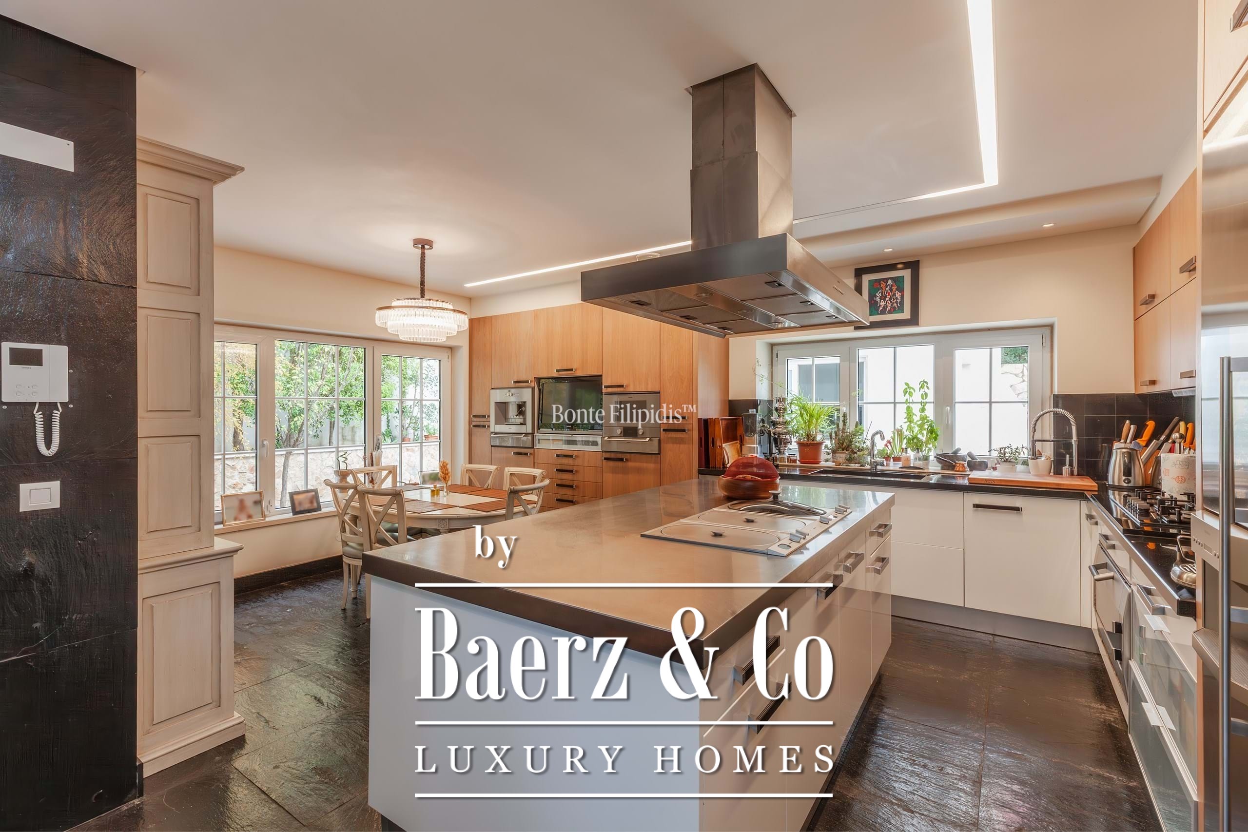 The 448 m² of interior space is distributed across four levels, each accessible by elevator. Five bedrooms, including a master suite, and six bathrooms offer ample accommodation, while luminous social spaces open directly to terraces beneath a bioclimatic pergola that adapts to light and airflow. The kitchen, fitted with advanced technology, quietly supports daily rituals and entertaining alike.