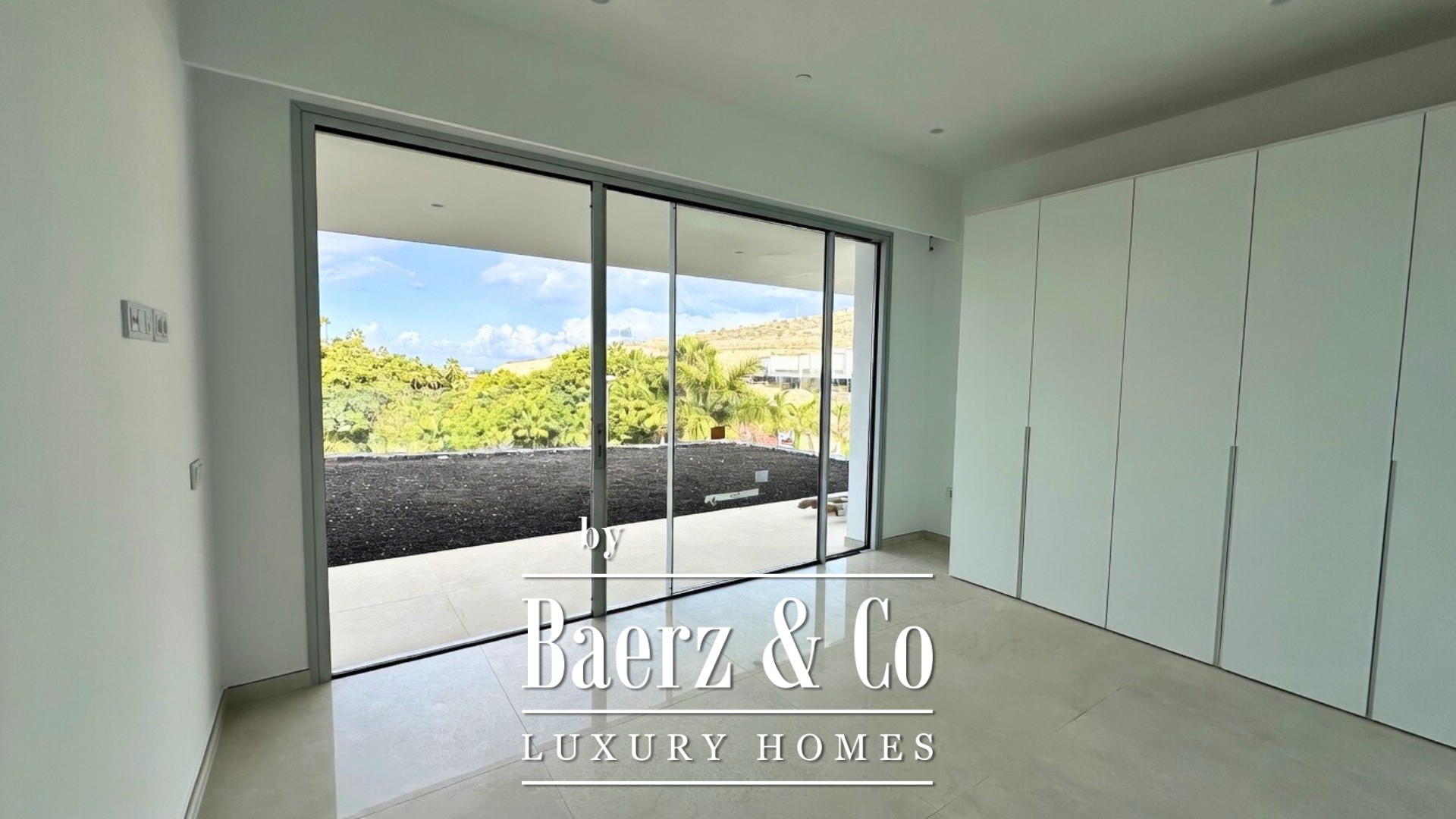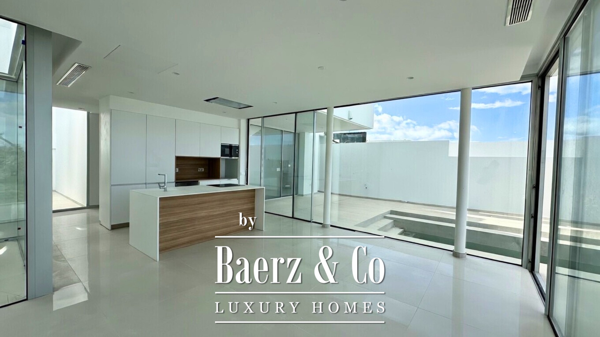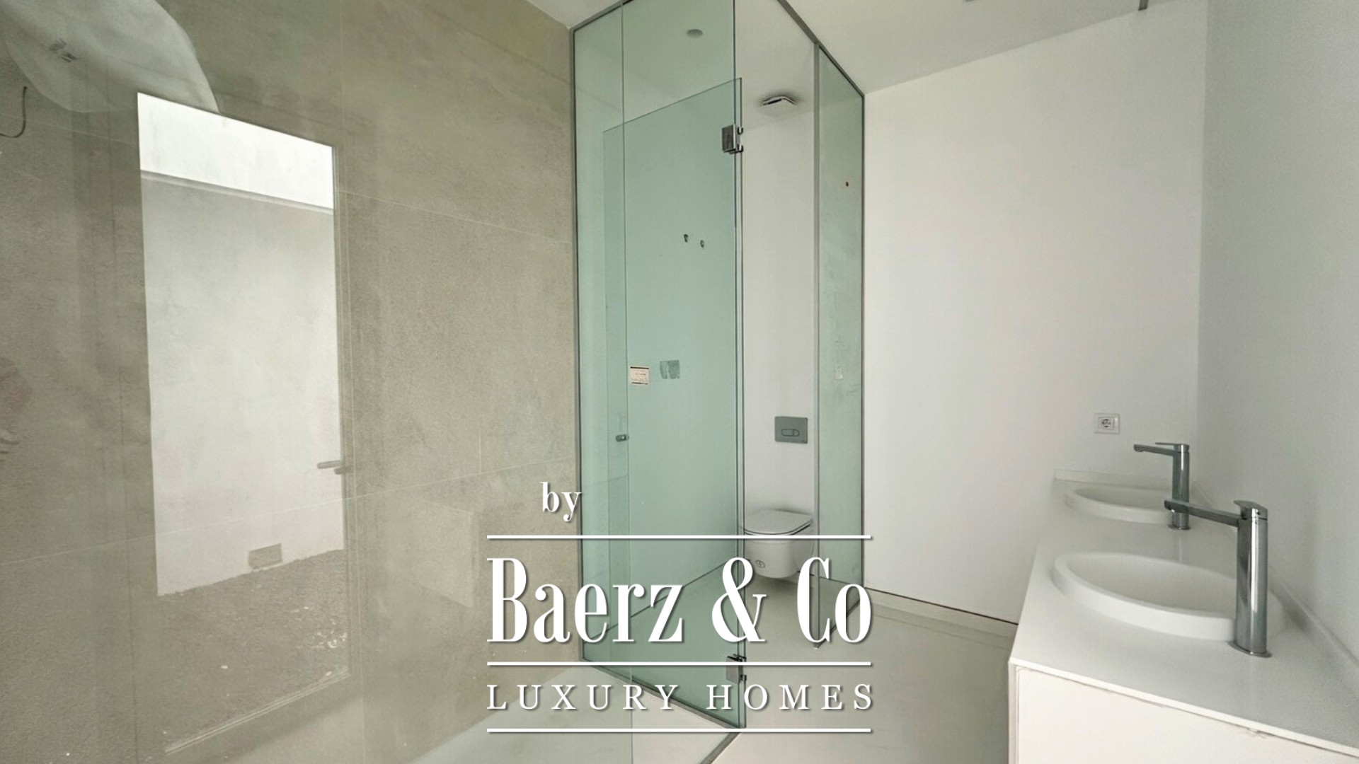 A private swimming pool of 7.5 x 3 metres, outdoor shower, and generous terrace provide an immersive indoor-outdoor experience. On the lower floor, a multi purpose room, two additional bedrooms, two full bathrooms, and a dedicated laundry room offer versatility and comfort. Green areas with exotic plants and palm trees envelope the villa, supporting a tranquil, refined atmosphere.