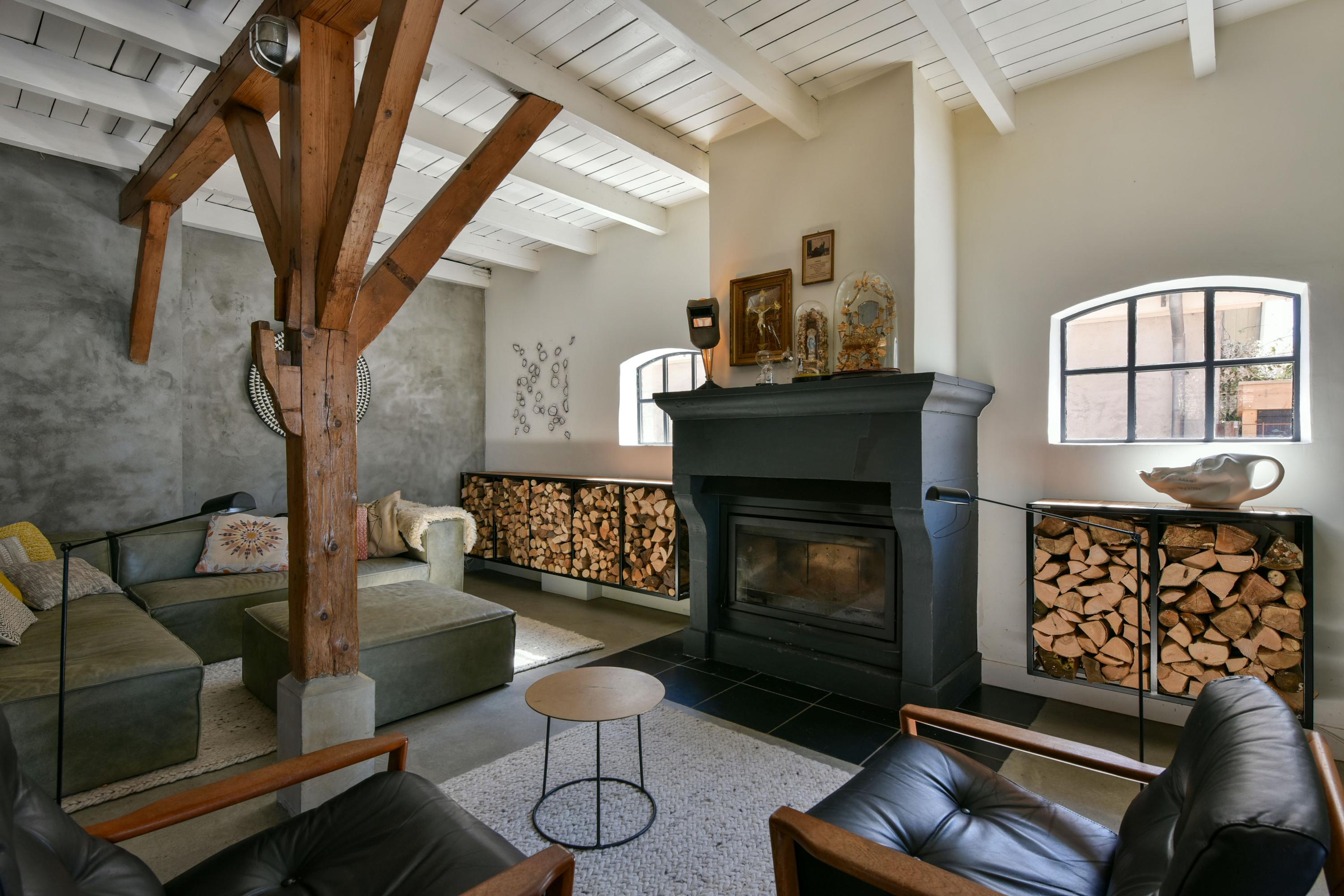 The centerpiece of the living room is the large open fireplace, framed by a custom-made wood storage unit that subtly integrates the television – a bespoke piece by Don Zweedijk of De Mogelijkheidcollectie, blending art and functionality perfectly.