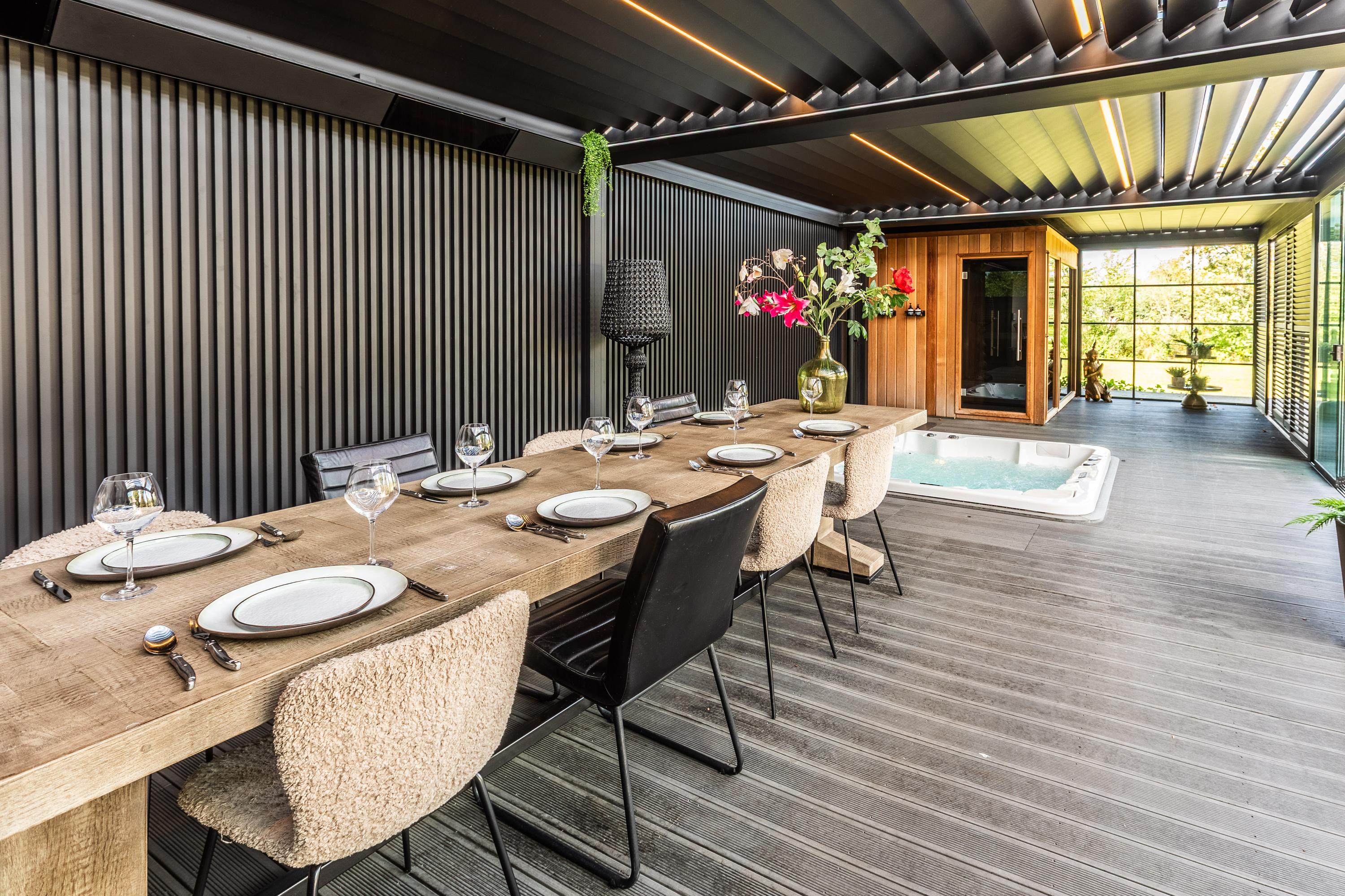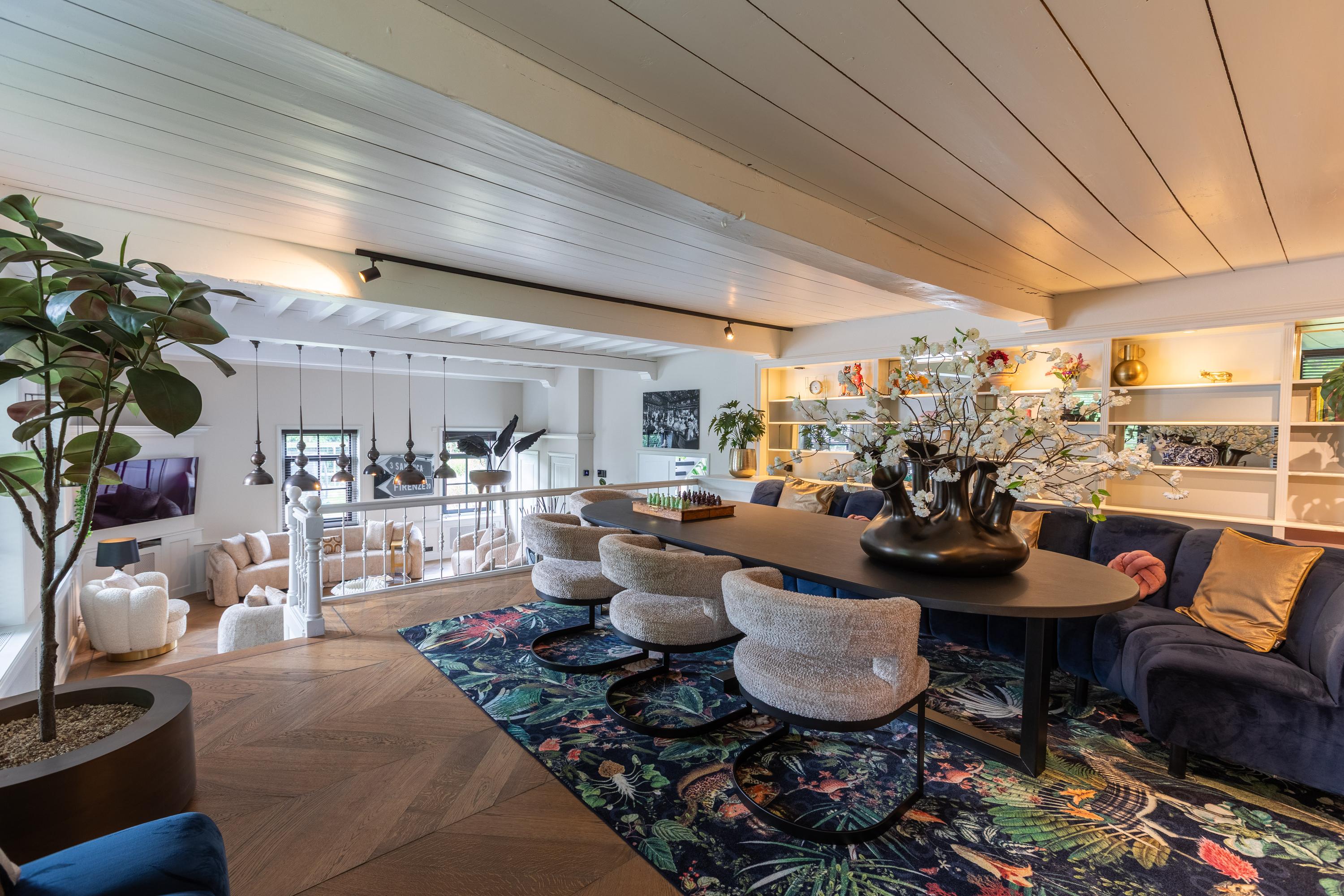 In addition, the ground floor features a second modern kitchen adjacent to the terrace and a multifunctional space of approximately 85 m² in the former stable, equipped with a bar, pantry, toilet, and access to the garages and storage space. On the other side of this space, you enter the spacious extension with wellness facilities, fully equipped with a jacuzzi, Finnish sauna, infrared sauna, and enough space for a large dining table or lounge set—a wonderful place to relax and enjoy each other's company.