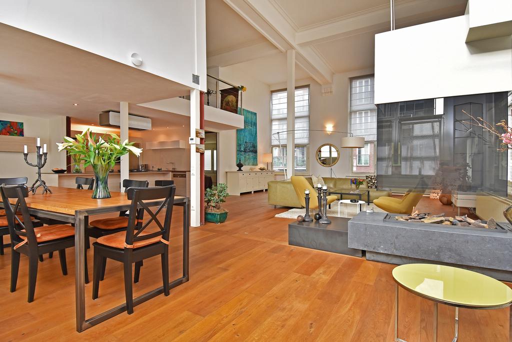 Entree, een brede hal met prachtige zwart/wit betegelde vloer met toilet en binnenberging. Woonkamer van meer dan 100 m2 met een nagenoeg nieuwe open haard (Boley) en een imposante plafondhoogte van ruim 5 meter. Door de vele hoge raampartijen is dit een heerlijke lichte leefruimte. De royale open keuken (Siematic) is recent geplaatst en deze is voorzien van inbouwapparatuur. Ruime slaapkamer met ernaast een moderne badkamer.