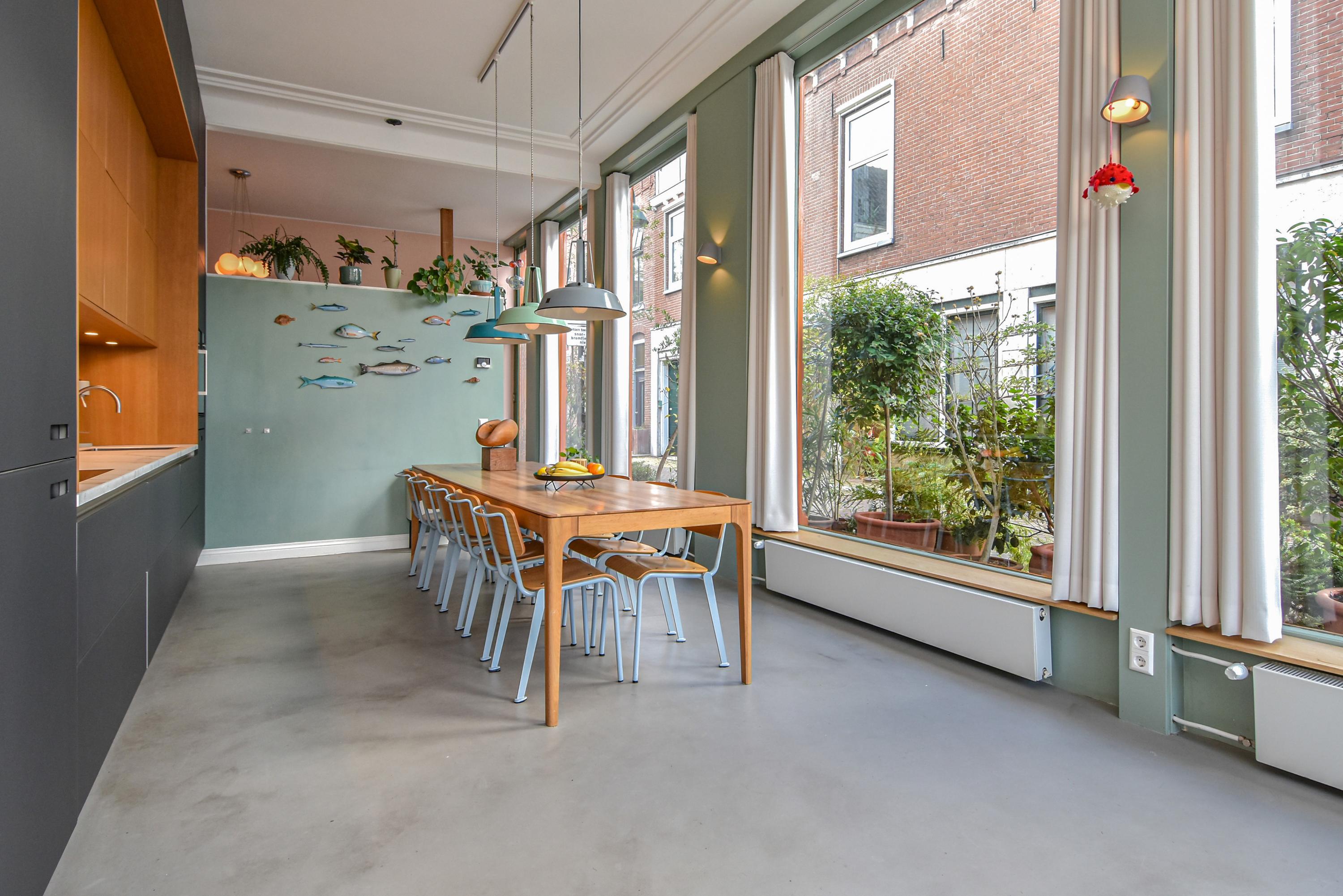On either side of the kitchen are two inviting living areas: on one side a sitting room, and on the other a cozy living room with a comfortable seating area. Adjacent is an integrated studio, also featuring a high ceiling and French doors opening to the street. This room is arranged as a bedroom with its own bathroom, including a walk-in shower, double washbasin, and toilet—ideal as a guest suite, annex apartment, office, or practice space at home. At the rear, there is a large, practical bicycle storage room with attic space, accessible via Broerhuisstraat. From the living room, a straight staircase leads to the first floor.