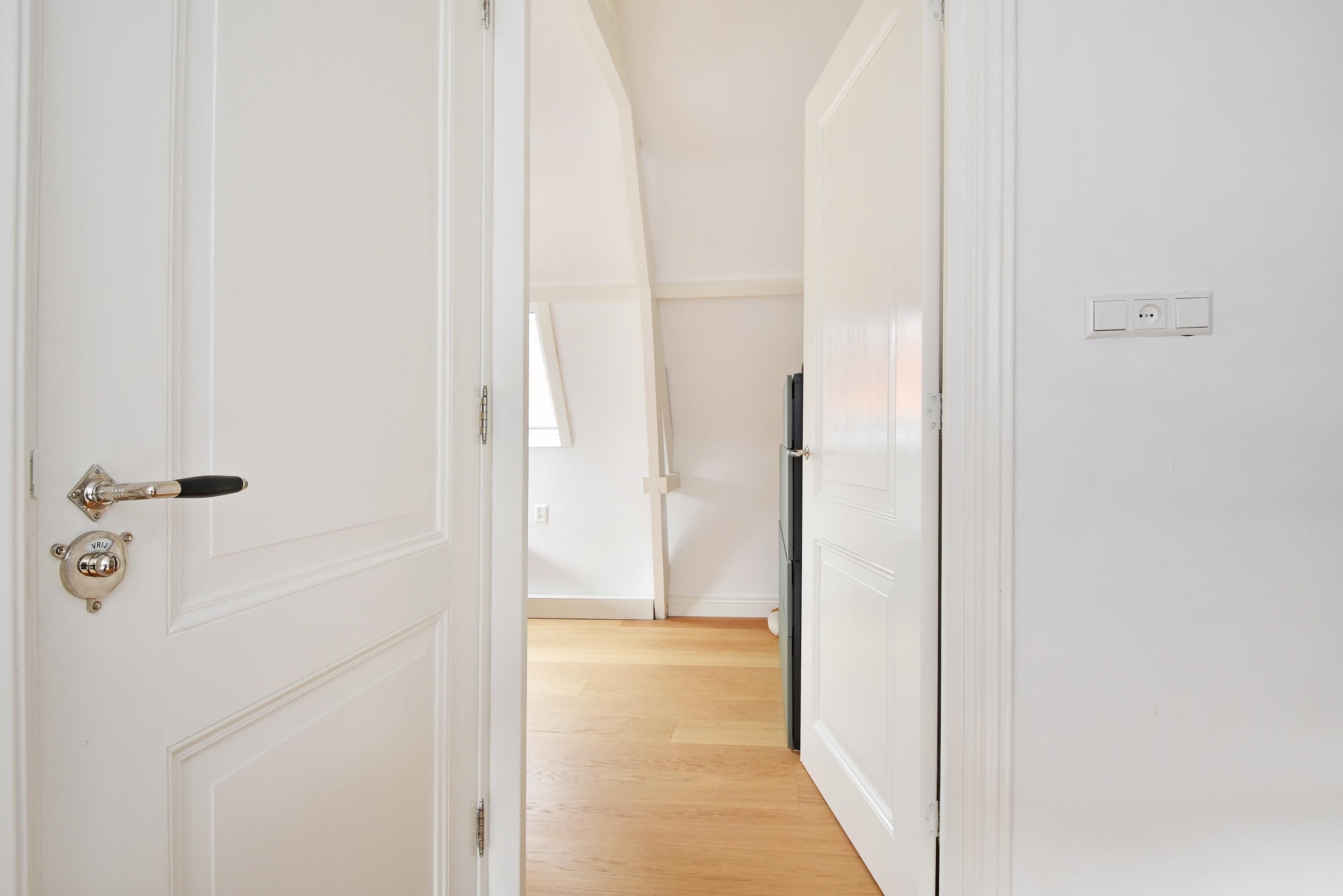 Upon entering, you are immediately impressed by the beautiful living kitchen with its strikingly high glass façades and an impressive ceiling height of no less than 3.55 meters. The original stucco decorative moulding has been preserved. The space is filled with light and offers ample room for a large dining table. The stylishly finished kitchen forms the heart of the home—a wonderful space equipped with luxury built-in appliances, perfect for cooking and entertaining guests.