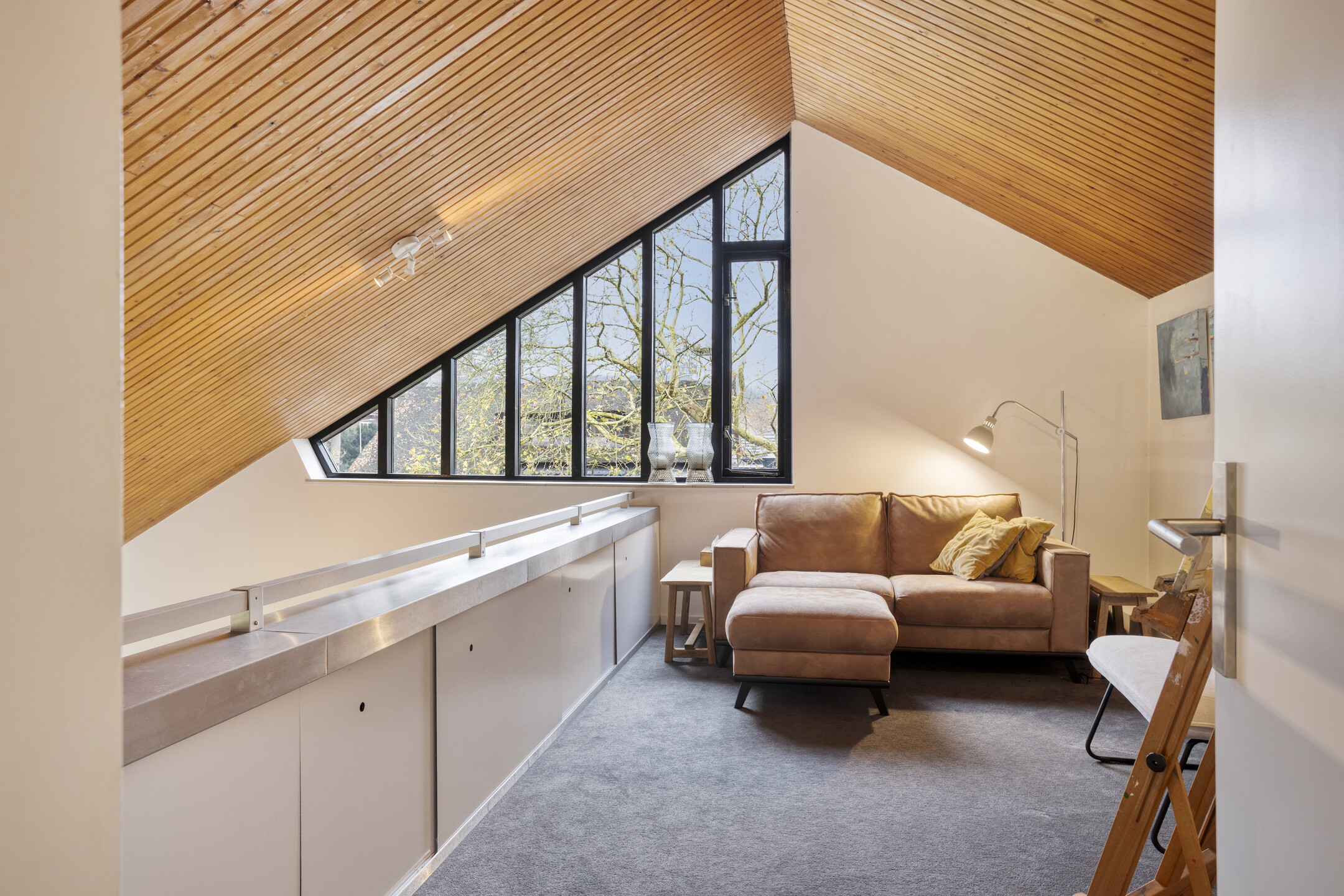 Eerste verdieping: bordes met toegang tot de vide die nu wordt gebruikt als atelier, de berging en de twee hele ruime kamers (30 m²). De berging is voorzien van een wastafel en daar zit tevens de CV-ketel. De ene kamer wordt nu gebruikt als slaapkamer en de ander als extra living. Dit kan uiteraard ook prima gebruikt worden als slaapkamer.