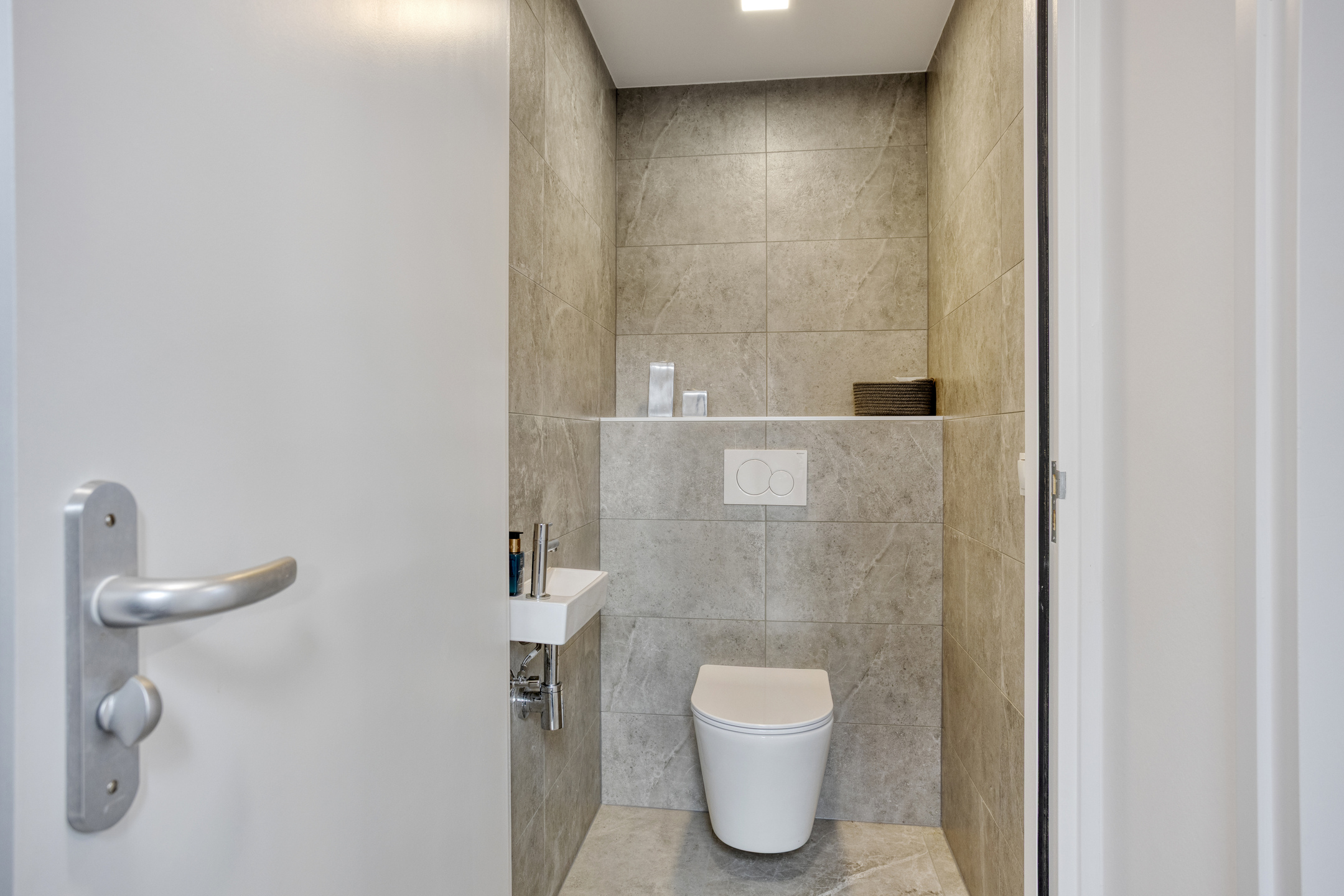 Begane grond: overdekte entree met toegang tot het toilet, de hal en de badkamer. Vanuit de hal bereik je de wasruimte, de berging en de eerste kamer. Deze kamer wordt momenteel gebruikt als salon en is ideaal dankzij de eigen ingang. Vanuit de hal naar de salon zit nog een extra met de toegang naar de kelder.
