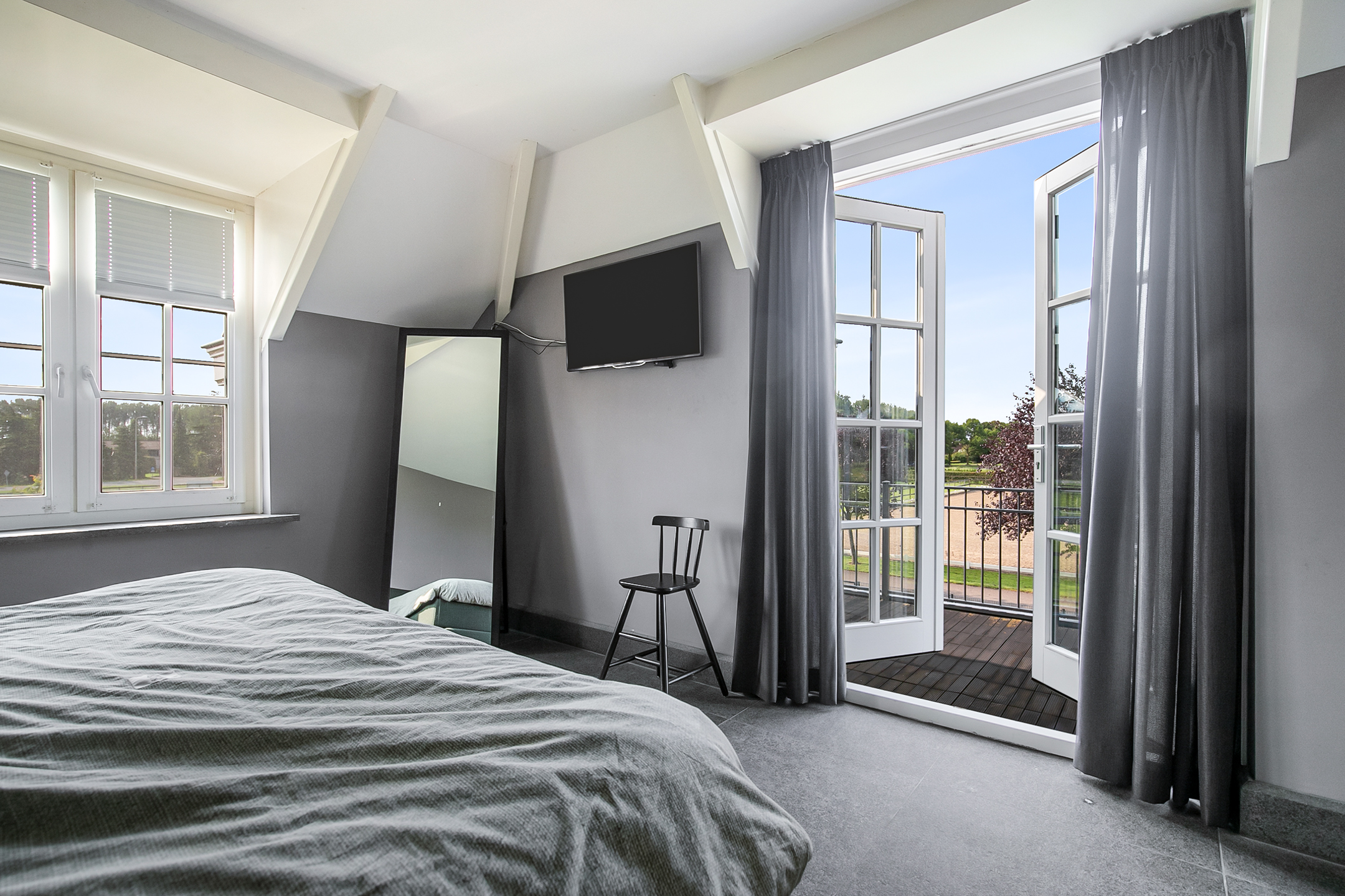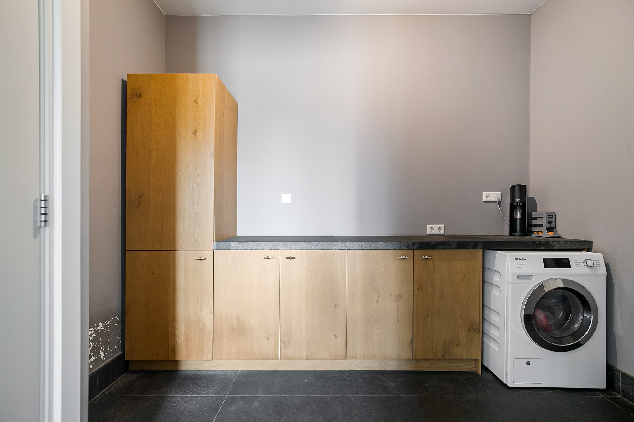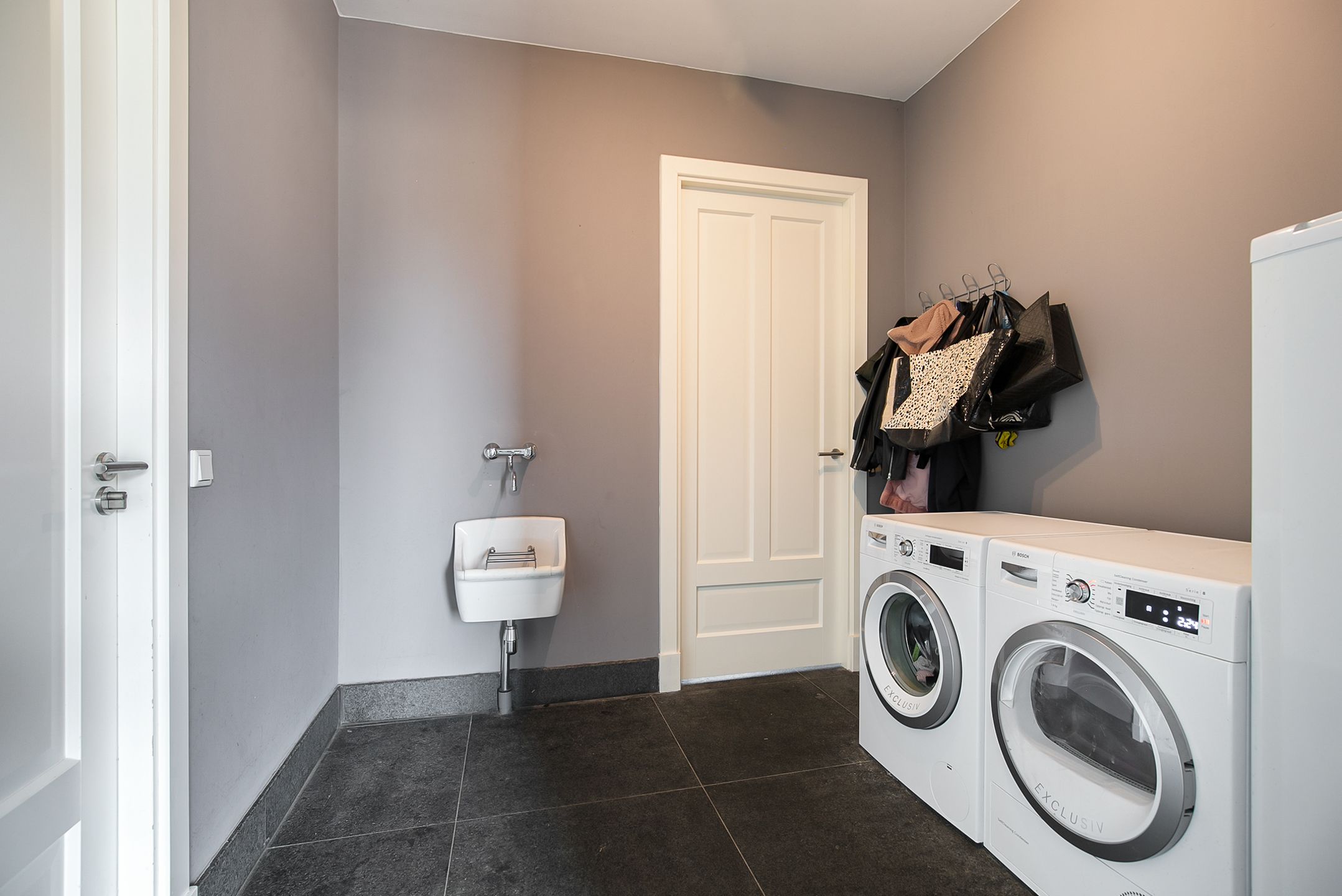The covered entrance with a double sliding front door, gives this villa an attractive appearance. The spacious reception hall with imposing wooden staircase provides access to the living room and the 1st floor. The hall has a natural stone tiled floor, stucco walls and a stucco ceiling. The spacious living kitchen with dining area has a natural stone tiled floor, stucco walls and a stucco ceiling with recessed lighting. The kitchen features a wall-mounted unit with appliance wall and a cooking and rinsing island. The appliance wall is further equipped with an oven, coffee maker, steam oven and fridge. The island features a 5-burner gas hob with built-in extractor fan in the ceiling, a sink and a dishwasher. Various cupboards and drawers provide plenty of storage space. A large bay window/extension with French doors provide access to the garden. The many windows provide plenty of natural light. A fireplace adds atmosphere and warmth to the room. From the living room there is a nice view of the horse pastures. And here, too, large windows and double doors provide a sea of light. In addition, there is a beautiful, large fireplace with a gas fire that provides even more atmosphere and warmth in the room. Sliding doors close off the living room from the kitchen/dining area. Semi-circular French doors in the side wall of the house provide access to the front house. The spacious entrance hall provides access to the utility/laundry room, living room, toilet room and the meter cupboard. The utility/laundry room is equipped with a sink. Also located here are the connections for the washing equipment. From here, there is access to the office/workroom. The office space is a fine room which is obviously suitable for various purposes, such as a playroom or chill room.