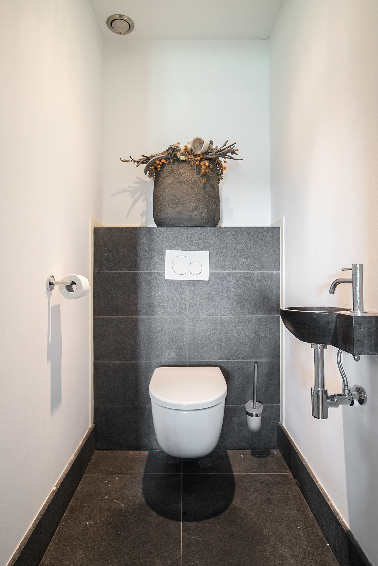 The master bedroom is equipped with a practical closet and air conditioning. French doors provide access to the roof terrace from here. The fully tiled bathroom is equipped with a bathtub, a bathroom unit with 2 nice washbasins and a walk-in shower. The separate toilet room has a floating toilet and a hand basin.