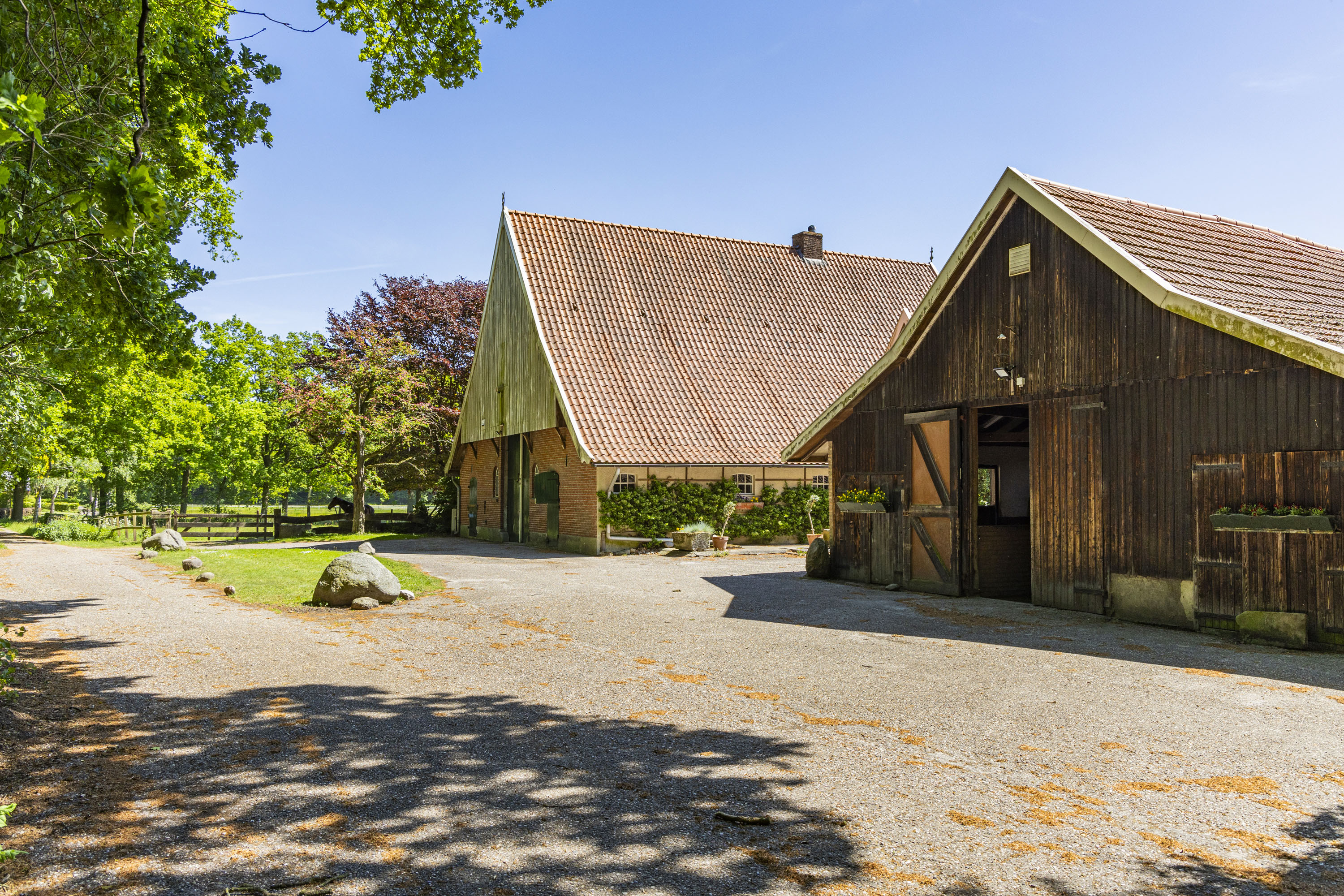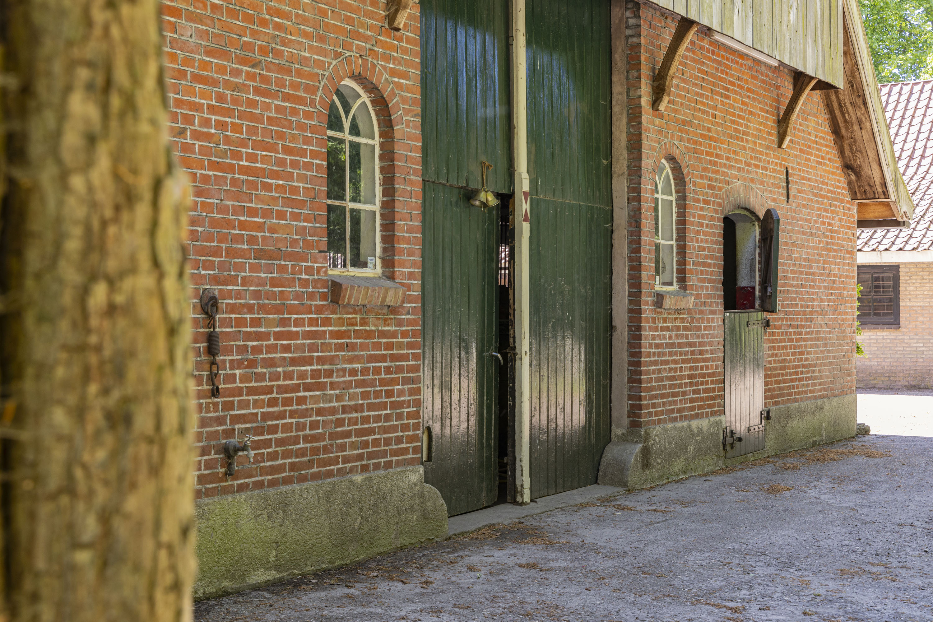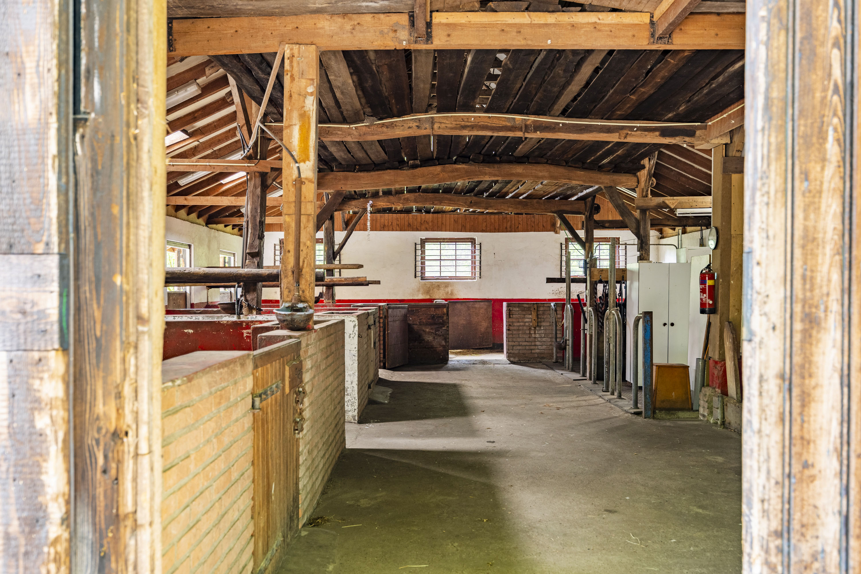 The back of the farmhouse remains structurally original, featuring beautiful wooden beams and a traditional stable door (the so called ‘niendeur’). Where cows once stood, there are now five horse stables, a tack room and additional facilities including an office, shower and laundry connections.