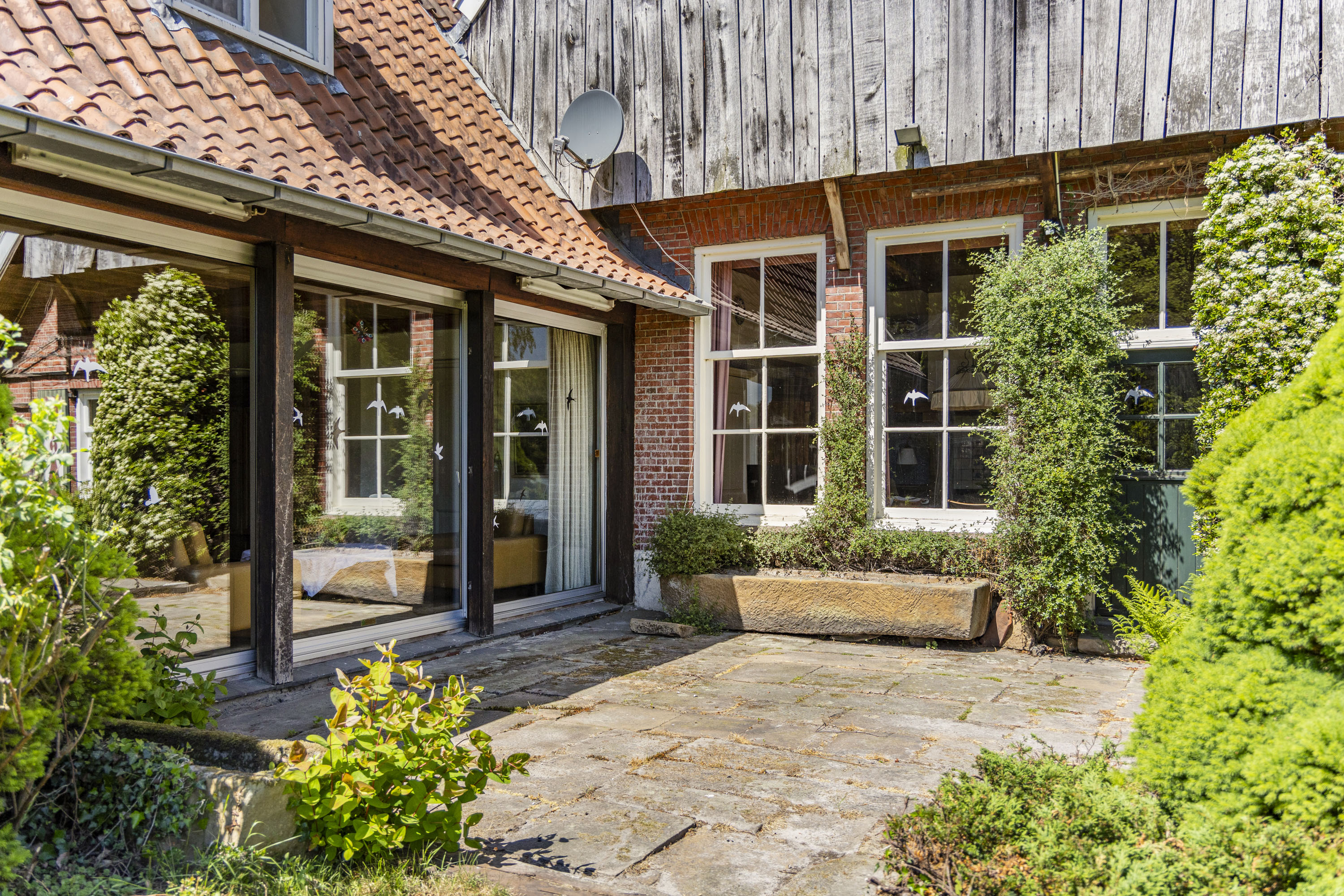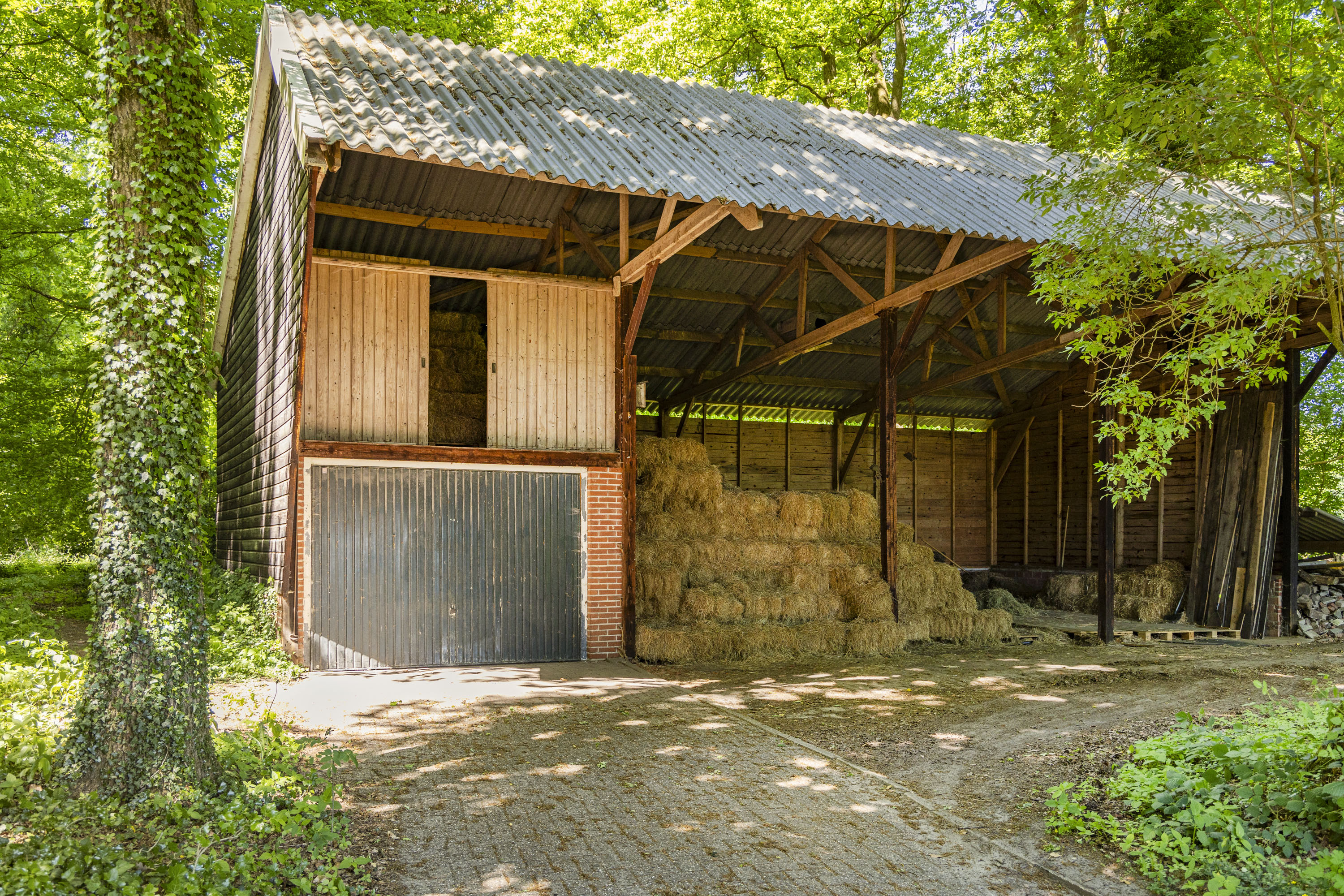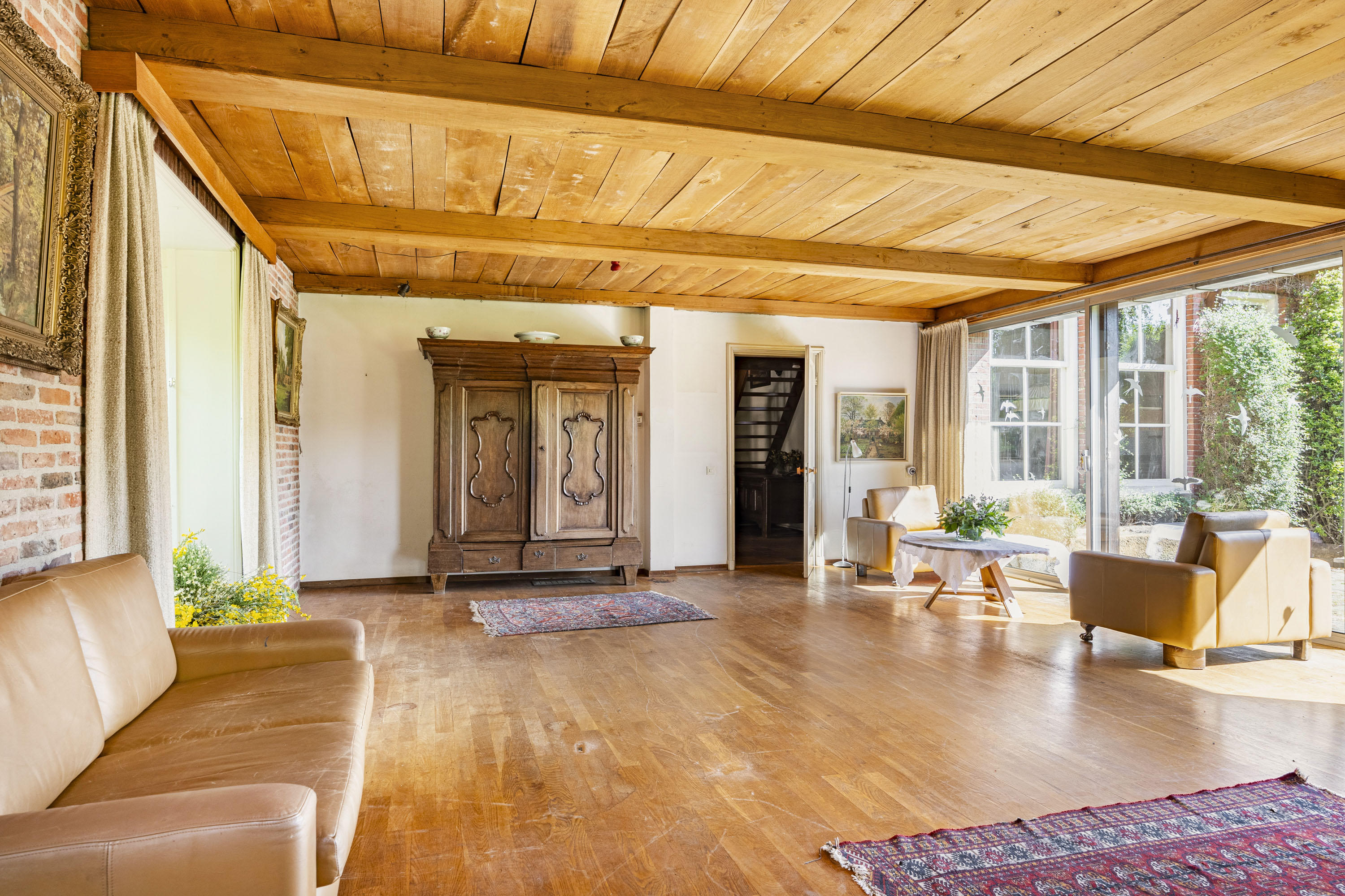The back of the farmhouse remains structurally original, featuring beautiful wooden beams and a traditional stable door (the so called ‘niendeur’). Where cows once stood, there are now five horse stables, a tack room and additional facilities including an office, shower and laundry connections.