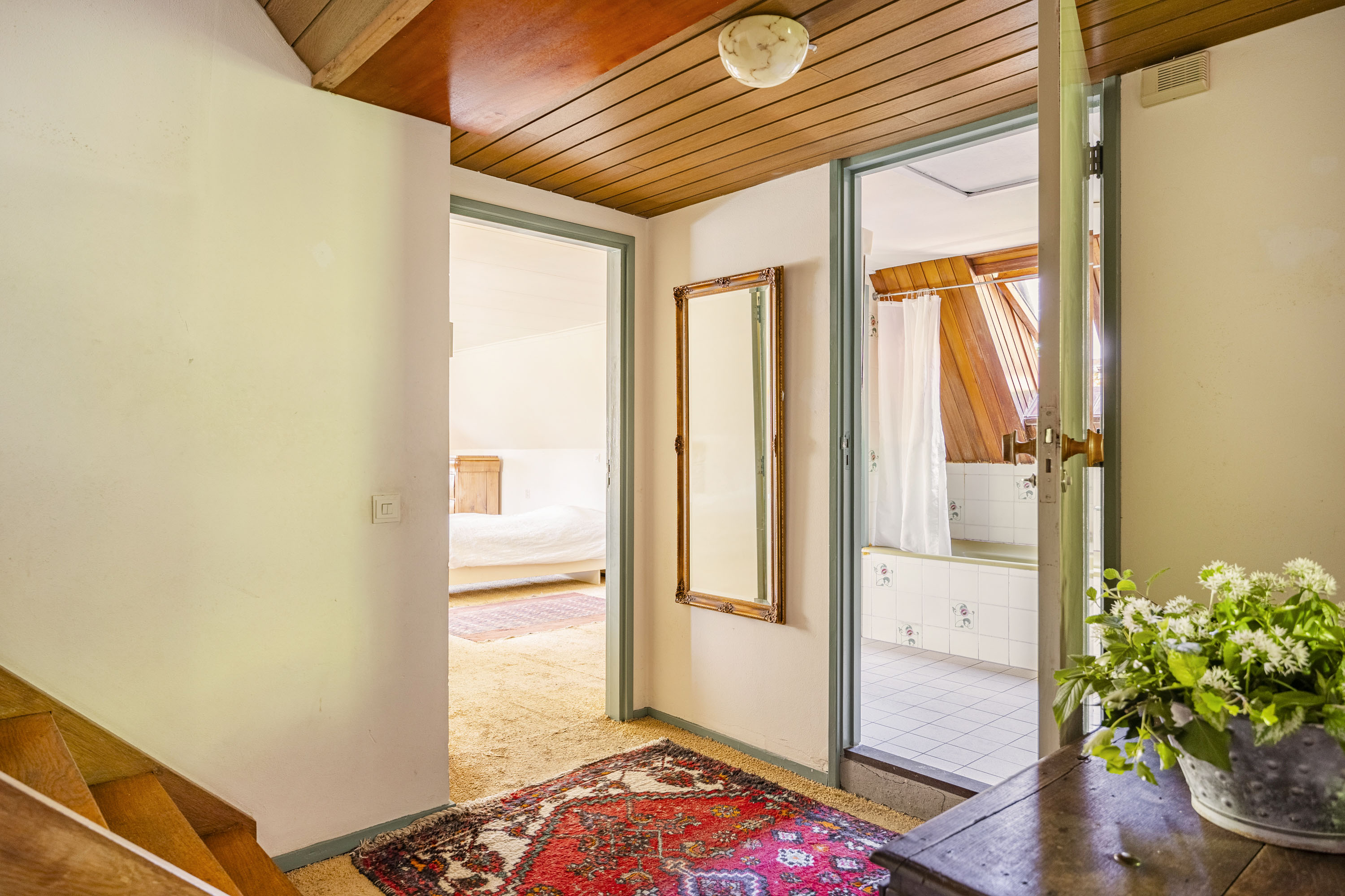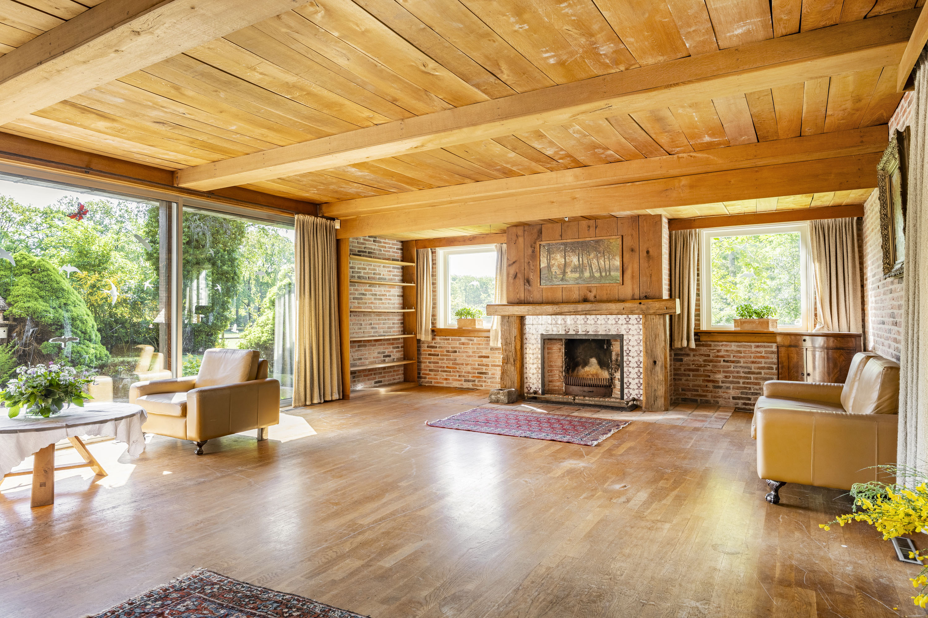 A covered entrance, made of Bentheim stone, leads into a bright hallway with a tiled floor. The hallway provides access to the staircase, guest toilet, a country-style kitchen and a spacious living room in the traditional “endskamer”. Both the kitchen and the endskamer offer views of the scenic Twente countryside, while fireplaces create a warm, intimate atmosphere.